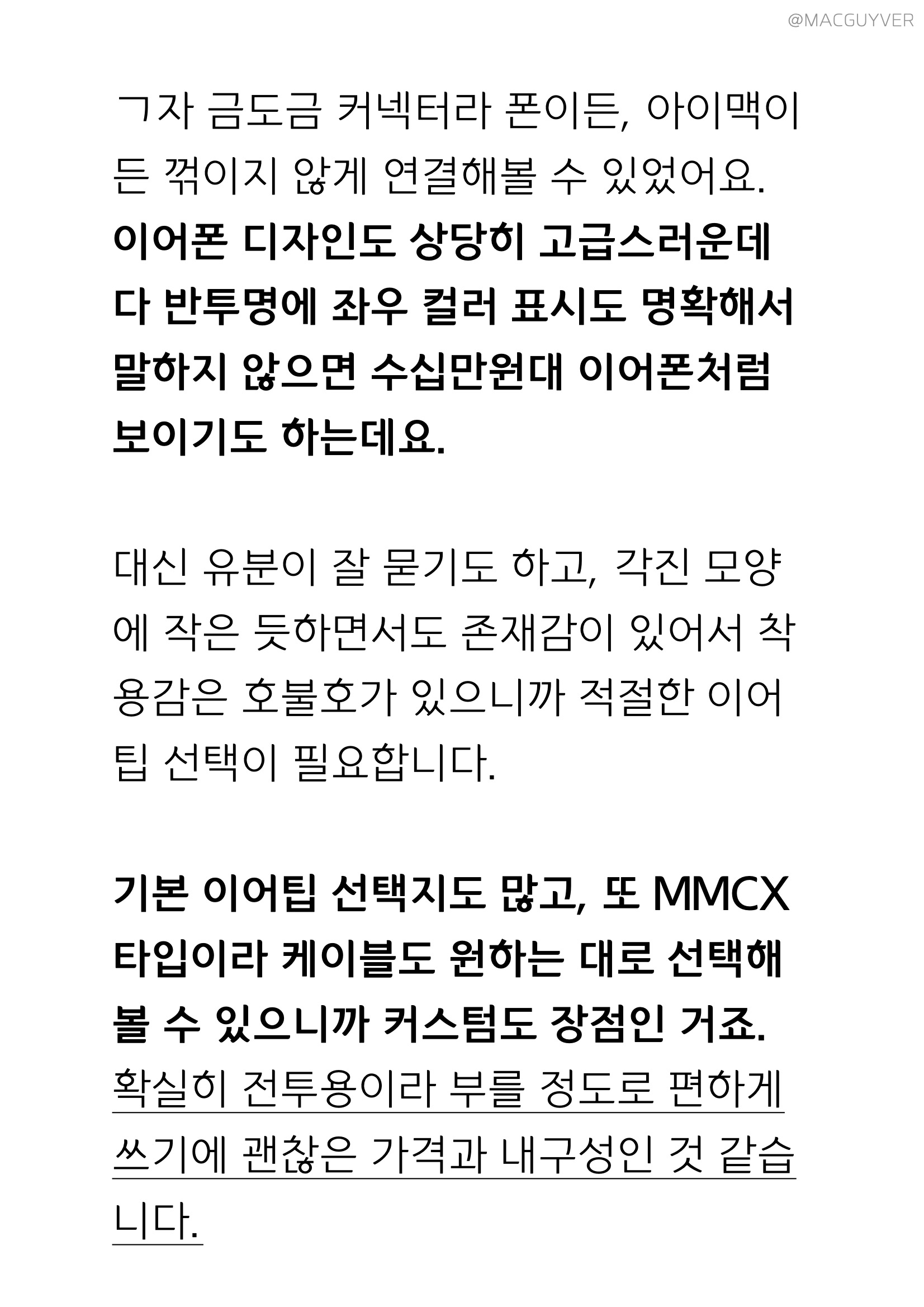 차이파이로 불리는 TRN TA1은 박스에서도, 설명서에서도 한글은 찾아볼 수 없는데요. 대신 가성비 이어폰답게 노멀 폼팁 3세트, 저음 폼팁 3세트, 메모리 폼팁 1세트, 케이블과 이어폰, 유일하게 한글이 적힌 워런티 카드까지 꽉 찬 구성입니다. 파우치가 없나 했는데, 구매 혜택으로 생활 방수 파우치를 준다고 합니다. 개인적으로 디자인이 상당히 마음에 들었는데요. 줄꼬임이 없는 건 기본이고, 손맛이 좋아서 음악을 안 들을 때도 자꾸만 케이블에 손이 가더라고요. ㄱ자 금도금 커넥터라 폰이든, 아이맥이든 꺾이지 않게 연결해볼 수 있었어요. 유선 이어폰 디자인도 상당히 고급스러운데다 반투명에 좌우 컬러 표시도 명확해서 말하지 않으면 수십만원대 이어폰처럼 보이기도 하는데요. 대신 유분이 잘 묻기도 하고, 각진 모양에 작은 듯하면서도 존재감이 있어서 착용감은 호불호가 있으니까 적절한 이어팁 선택이 필요합니다. 고음질 이어폰 기본 이어팁 선택지도 많고, 또 MMCX 타입이라 케이블도 원하는 대로 선택해볼 수 있으니까 커스텀도 장점인 거죠. 확실히 전투용이라 부를 정도로 편하게 쓰기에 괜찮은 가격과 내구성인 것 같습니다.