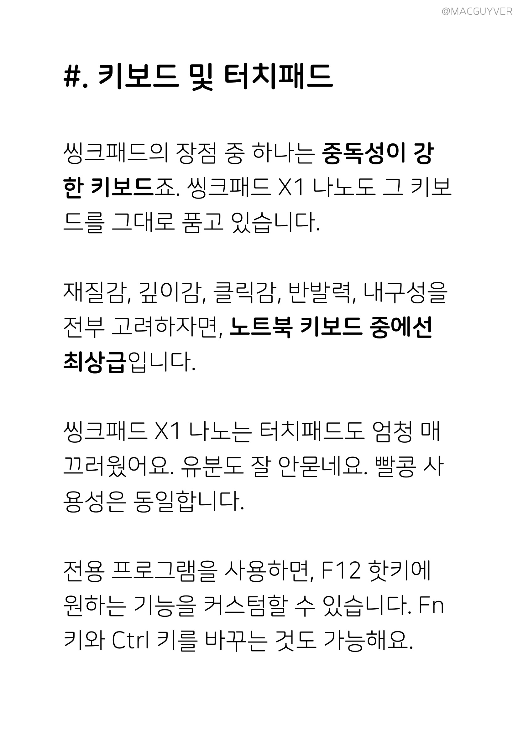 #. 키보드 씽크패드의 최대 장점 중 하나는 중독성이 강한 키보드죠. 씽크패드 X1 나노도 그 씽크패드의 키보드를 그대로 품고 있습니다. 재질감, 깊이감, 클릭감, 반발력, 내구성 등을 봤을 때, 노트북 키보드 중에선 최상급입니다. 씽크패드 X1 나노는 터치패드도 엄청 매끄러웠어요. 유분도 잘 안묻네요. 빨콩 사용성은 동일합니다. 참고로 전용 프로그램을 사용하면, F12 핫키에 원하는 기능을 커스텀할 수 있습니다. Fn키와 Ctrl 키를 바꾸는 것도 가능해요.