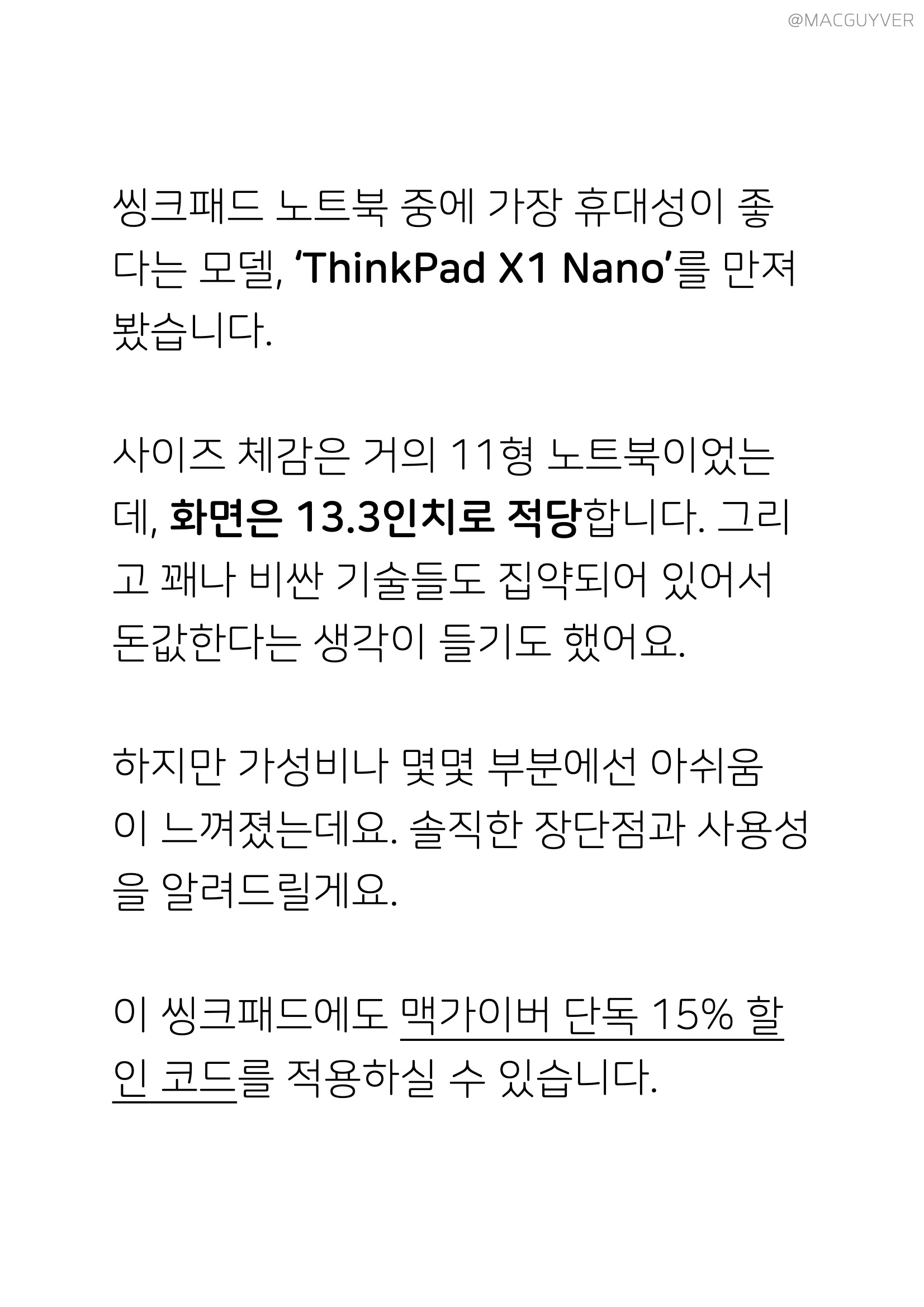 씽크패드 노트북 중에 가장 휴대성이 좋은 모델, 씽크패드 X1 나노를 만져봤습니다. 사이즈 체감은 거의 11형 노트북이었는데, 화면은 13.3인치로 적당합니다. 그리고 꽤나 비싼 기술들도 집약되어 있어서 돈값한다는 생각이 들기도 했어요. 하지만 가성비나 몇몇 부분에선 아쉬움이 느껴졌는데요. 솔직한 장단점과 사용성을 알려드릴게요. 이 씽크패드에도 맥가이버 단독 15% 할인 코드를 적용하실 수 있습니다.