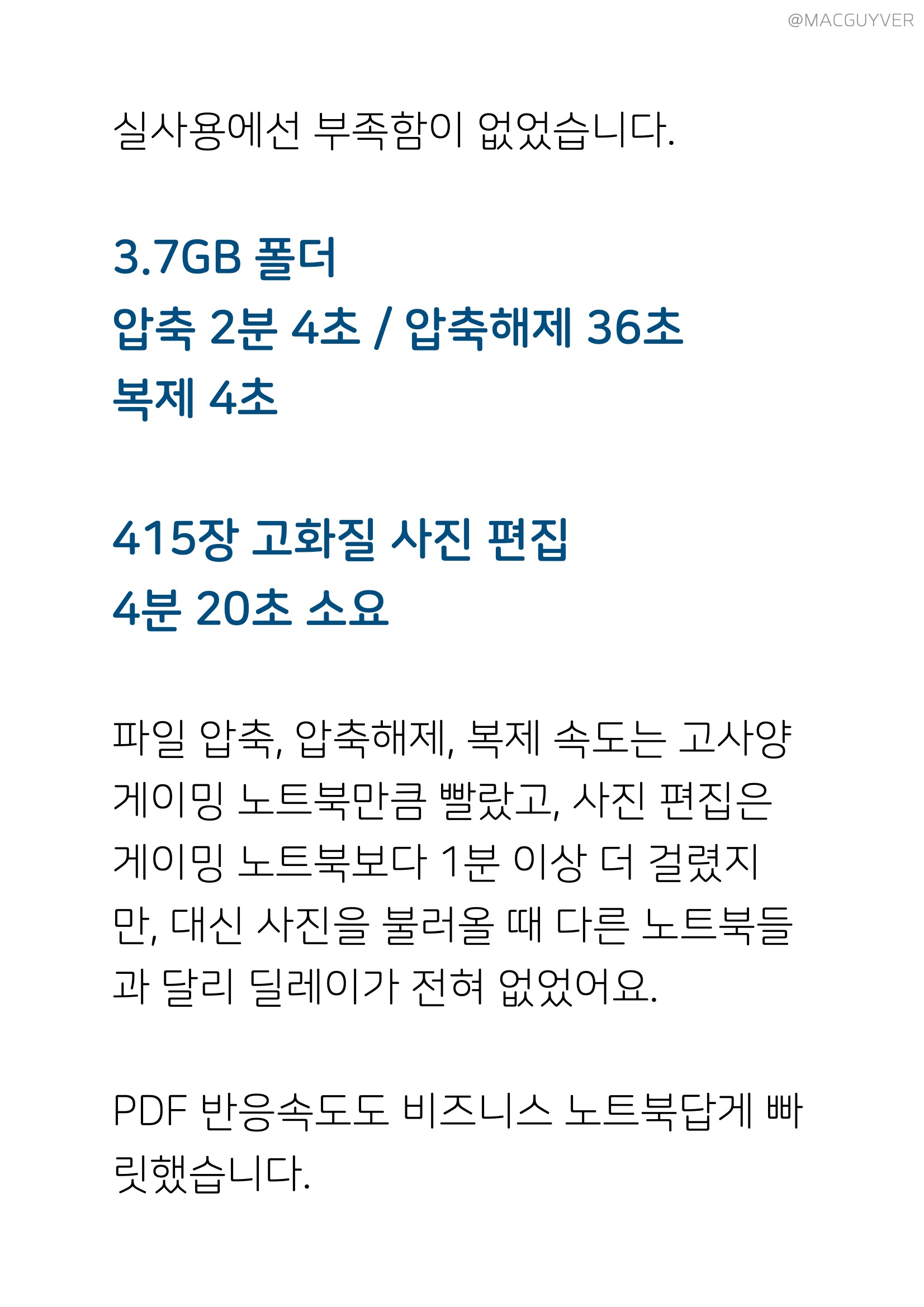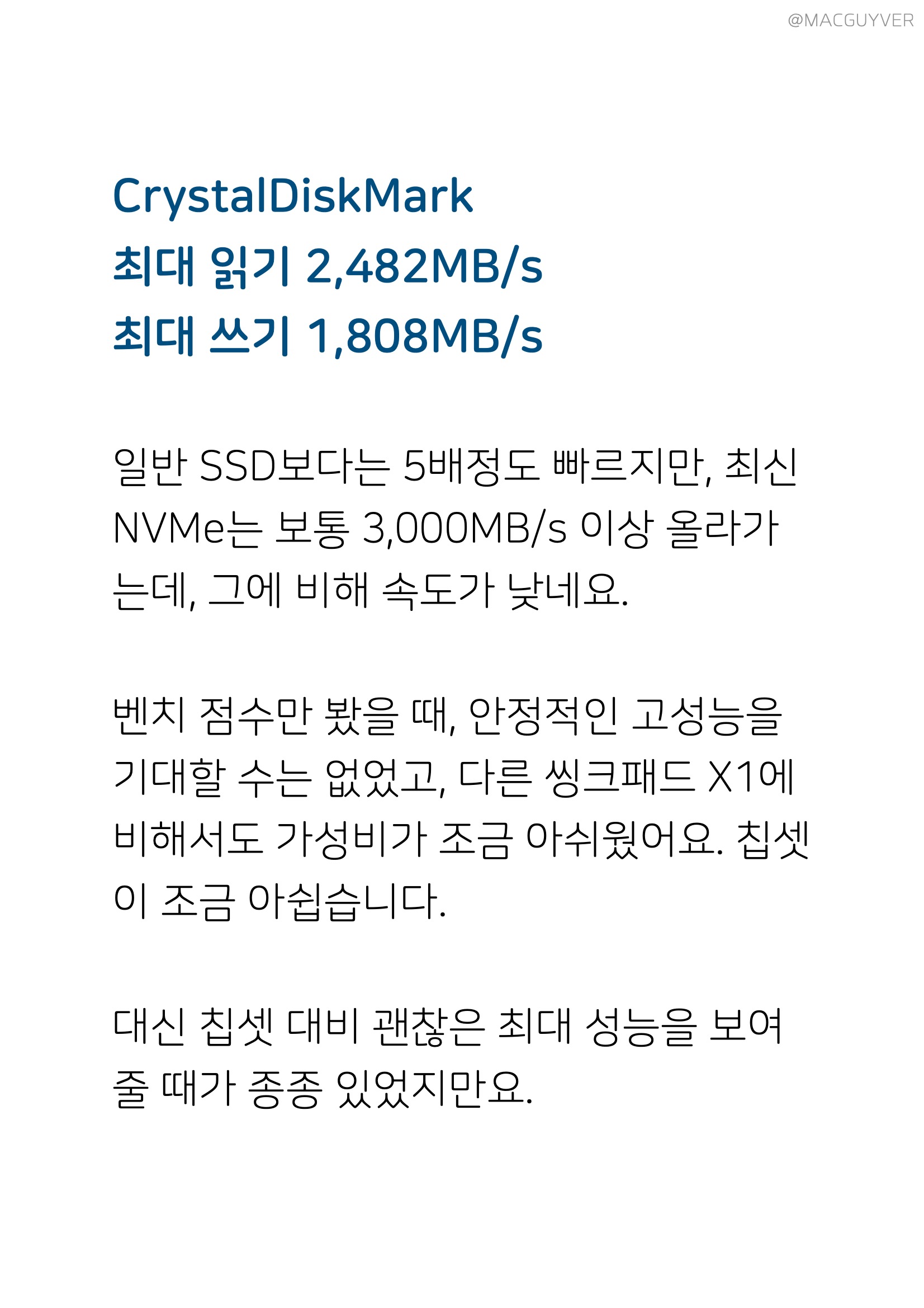 #. 가성비 인텔 i7-1160G7 코어는 초저전력 코어라서, i7이긴 하지만 최대 성능이 높지 않습니다. CPU-Z 2,467 그래서 단순 벤치인 CPU-Z 점수를 보면 10세대 i7 수준이에요. CineBench 4,209 i7-1165G7 : 3,769 그런데 렌더링 테스트인 시네벤치 점수는 11세대 상위 칩셋보다도 훨씬 높았습니다. 희한하네요. PCMARK10 4,613 발열 최대 - CPU 98도 / GPU 94도 평균 - CPU 50~90도 / GPU - 50~80도 업무 퍼포먼스는 상위 칩셋이 탑재된 비즈니스 노트북들과 비슷한데, 발열이 꽤 높은 편이었어요. 다른 비즈니스 노트북들도 90도 이상으로 올라가긴 하지만, 전반적으로 조금 더 높았습니다. 3DMark 총점 3,264 그래픽 3,845 물리 7,404 GPU/CPU 발열 평균 65도 이하 AMD R7 4750U 총점 : 3,288 그래픽 : 3,591 물리 : 14,050 인텔 i7-1165G7 총점 : 4,802 그래픽 : 5,269 물리 : 12,269 반면 그래픽 성능을 테스트하는 3D마크에선, 발열은 아주 안정적이지만 점수는 별볼일 없었습니다. 상위 칩셋을 탑재한 비즈니스 노트북들과 비교하면 확실히 밀리죠. CrystalDiskMark 최대 읽기 2,482MB/s 최대 쓰기 1,808MB/s 일반 SSD보다는 5배정도 빠르지만, 최신 NVMe는 보통 3,000MB/s 이상 올라가는데, 그에 비해 속도가 낮네요. 벤치 점수만 봤을 때, 안정적인 고성능을 기대할 수는 없었고, 다른 씽크패드 X1에 비해서도 가성비가 조금 아쉬웠어요. 대신 실사용 퍼포먼스에선 부족함이 없었습니다. 3.7GB 파일 압축 2분 4초 압축해제 36초 복제 4초 415장 고화질 사진 포토스케이프 편집 4분 20초 소요 파일 압축, 압축해제, 복제 속도는 고사양 게이밍 노트북만큼 빨랐고, 사진 편집은 게이밍 노트북보다 1분 이상 더 걸렸지만, 대신 사진을 불러올 때 다른 노트북들과 달리 딜레이가 전혀 없었어요. PDF 반응속도도 비즈니스 노트북답게 빠릿했습니다.