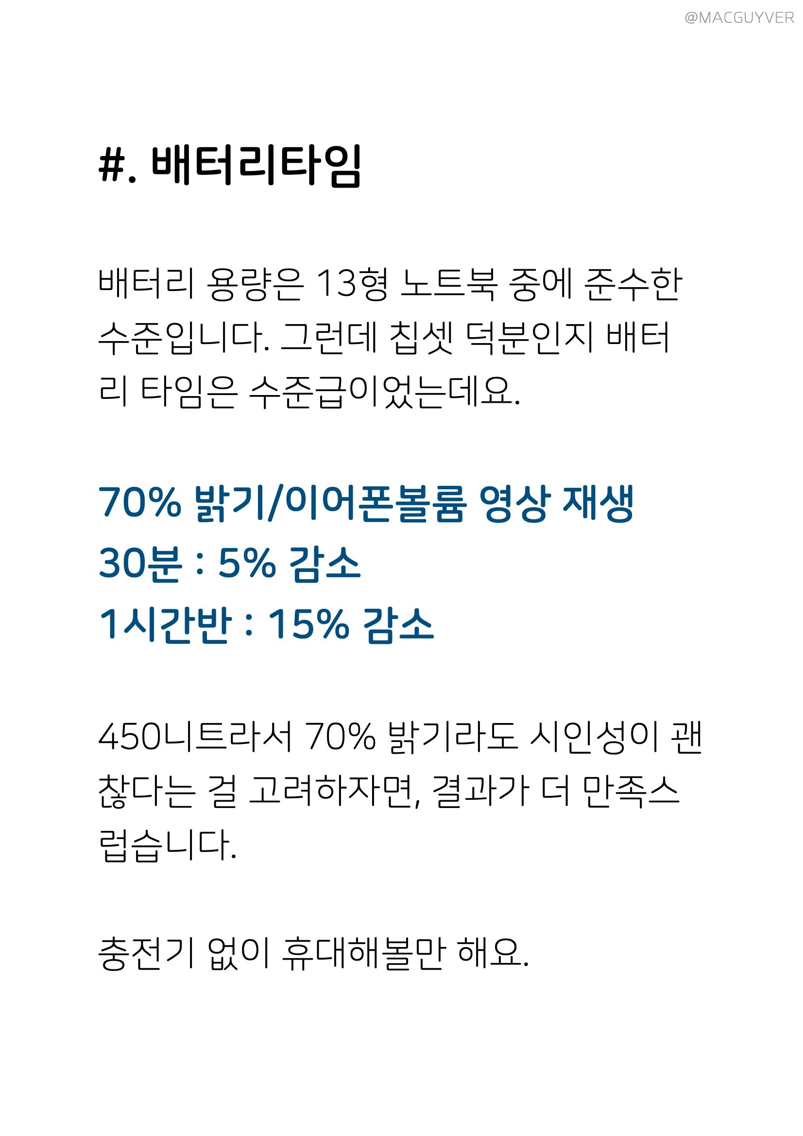 #. 배터리 배터리 용량은 13형 노트북 중에 준수한 수준입니다. 그런데 칩셋 덕분인지 배터리 타임은 수준급이었는데요. 70% 밝기/이어폰볼륨 영상 재생 30분 : 5% 감소 1시간반 : 15% 감소 450니트라서 70% 밝기라도 시인성이 괜찮다는 걸 고려하자면, 결과가 더 만족스럽습니다. 충전기 없이 휴대해볼만 해요. 대신 프로그램에 따라 소비량이 천차만별입니다. PC마크 재생 : 9% 감소 줌 화상회의 1시간반 : 30% 감소 48Wh 용량을 65W로 충전하니까 충전 속도는 엄청 빨랐습니다. 약 1시간 충전 20% -> 90%