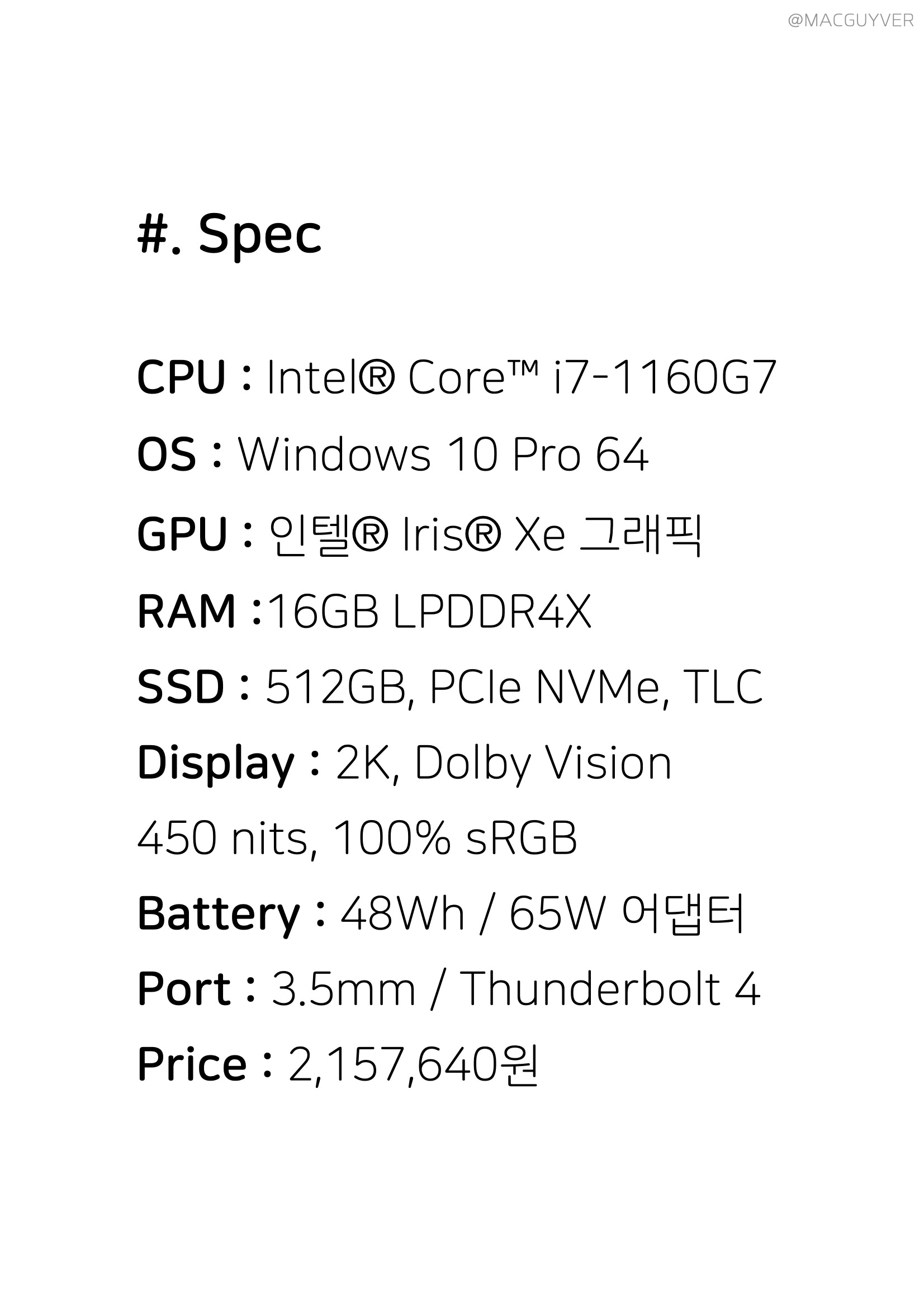 #. 스펙 CPU : Intel® Core™ i7-1160G7 OS : Windows 10 Pro 64 GPU : 인텔® Iris® Xe 그래픽 RAM :16GB LPDDR4X SSD : 512GB, PCIe NVMe, TLC Display : 2K, Dolby Vision 450 nits, 100% sRGB Battery : 48Wh / 65W 어댑터 Port : 3.5mm / Thunderbolt 4 Price : 2,157,640원