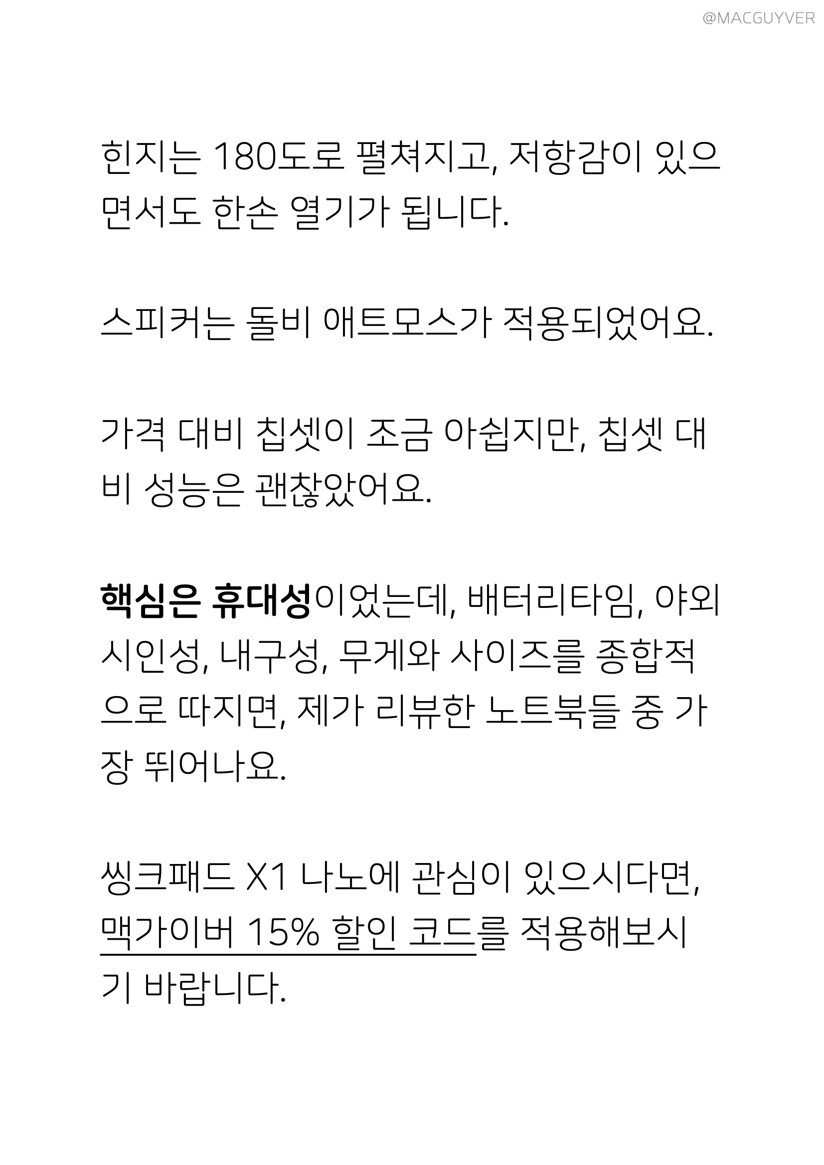 #. 기타 씽크패드 X1 나노도 12개의 군용 등급의 요구 사항 충족하고 200개 이상의 품질검사를 거쳤습니다. 그리고 카본 소재는 알루미늄보다 가벼우면서 내구성이 강하고 스크래치에도 장점이 있어요. 포트는 헤드폰잭과 썬더볼트4 두개가 전부고, 모두 왼편에만 있어요. 오른쪽엔 전원버튼이 전부입니다. 웹캠엔 커버가 있는데, 근접센서에 움직임이 감지되면 화면이 켜집니다. 화면을 닫아놓게 되네요. 힌지는 180도로 펼쳐지고, 저항감도 있고 바디 무게도 가볍지만 한손 열기도 됩니다. 스피커는 돌비 애트모스가 적용되었어요. 그리고 정말, 정말 정말 가볍습니다. 작고 튼튼하면서 가벼우니까 체감 무게는 거의 태블릿급이네요. 가격 대비 칩셋이 조금 아쉽지만, 칩셋 대비 성능은 괜찮았어요. 핵심은 휴대성이었는데, 배터리타임, 야외시인성, 내구성, 무게를 종합적으로 따지면, 제가 리뷰한 노트북들 중 가장 뛰어나요. 관심이 있으신 분들은 맥가이버 15% 할인 코드를 적용해보시기 바랍니다.