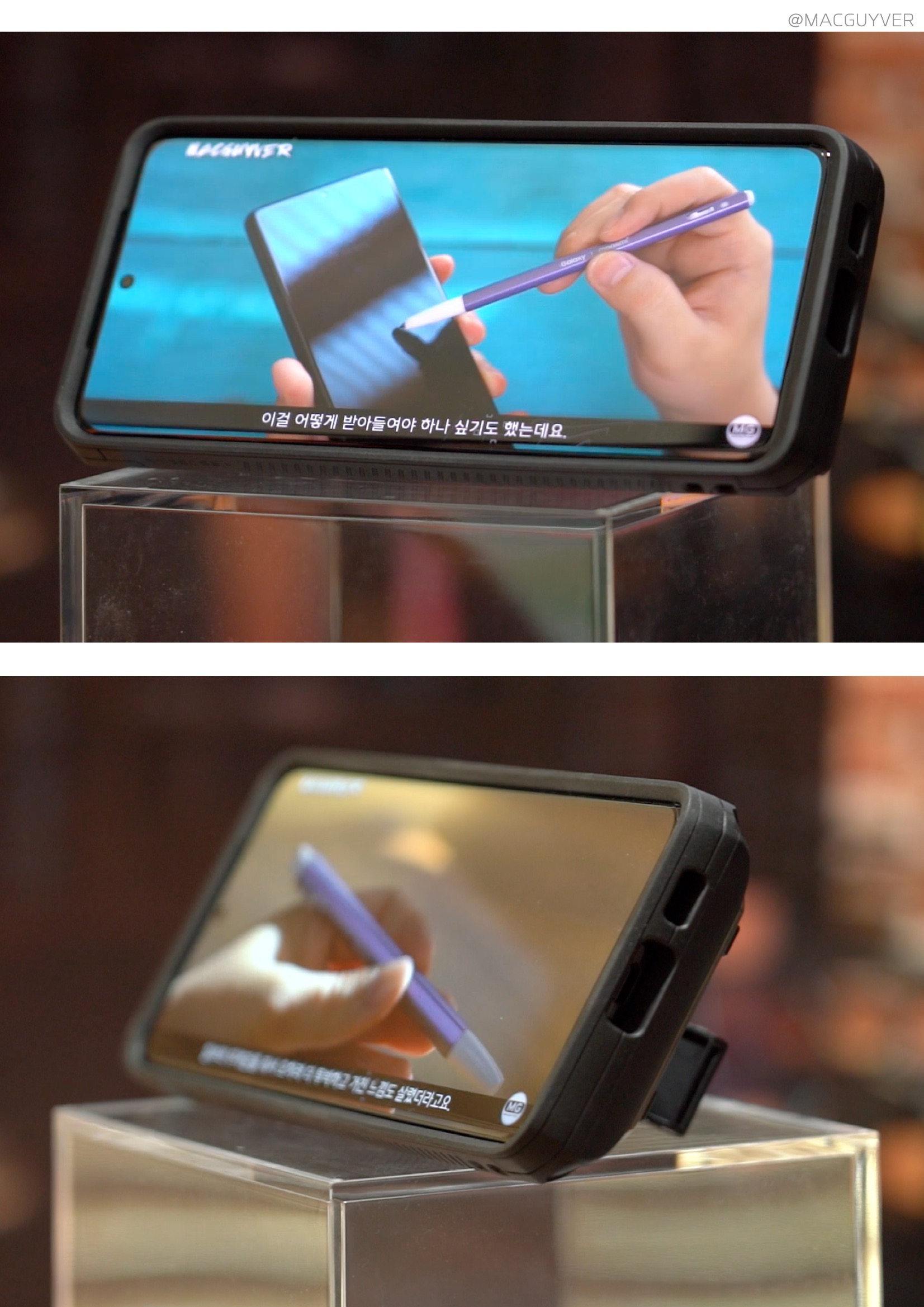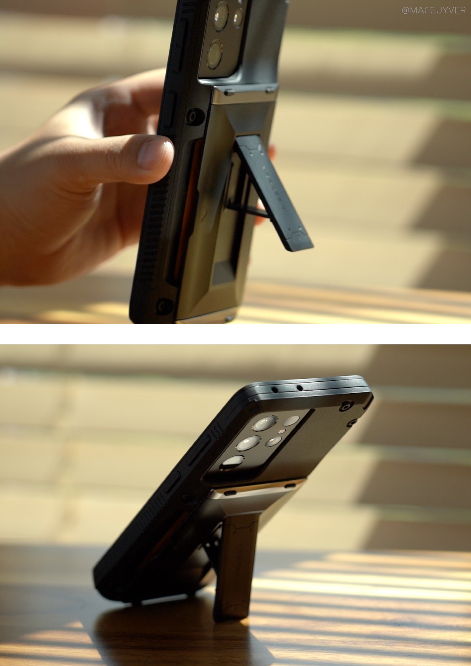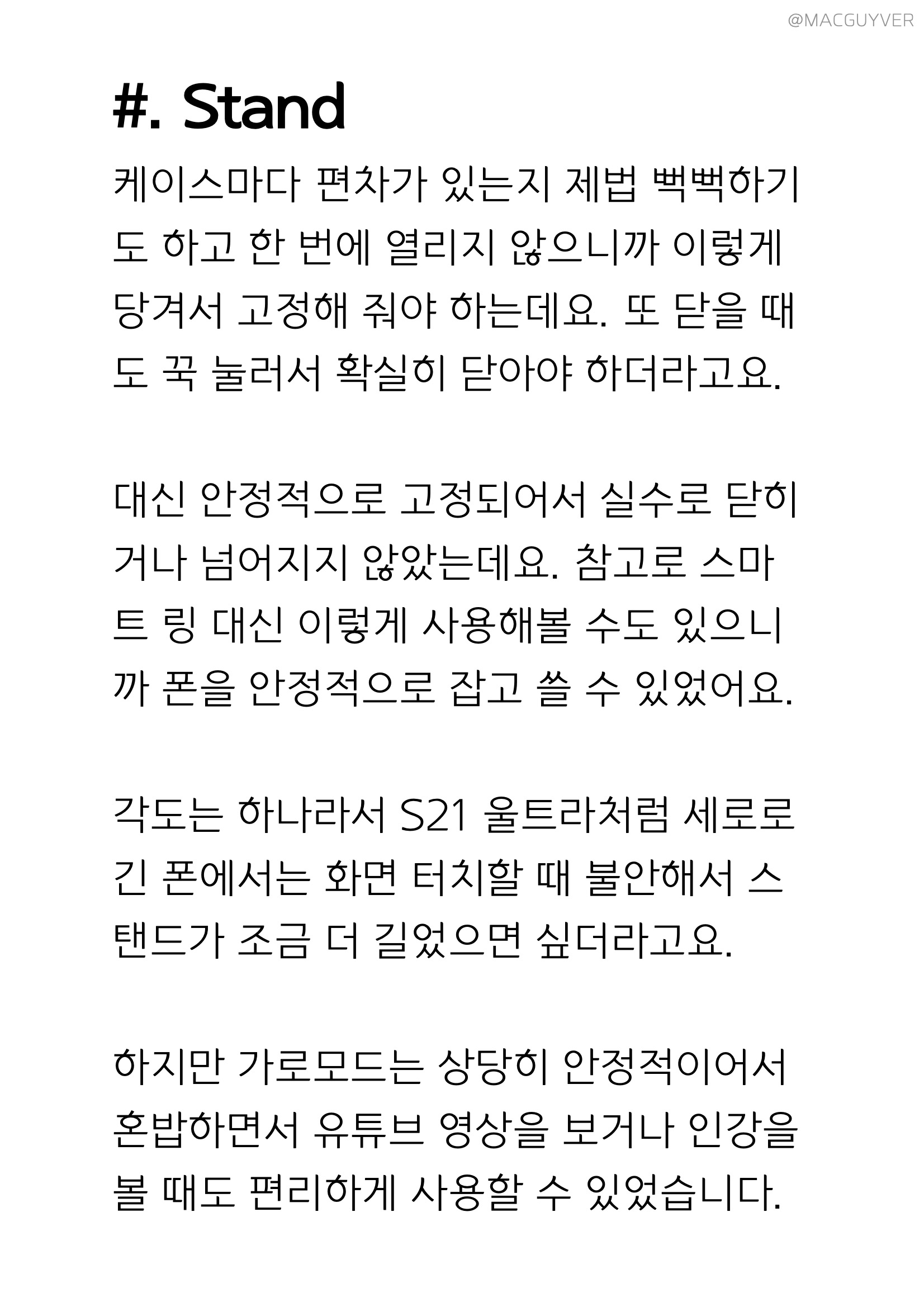 #. 아이폰 12 거치대 케이스 Stand 케이스마다 편차가 있는지 제법 뻑뻑하기도 하고 한 번에 열리지 않으니까 이렇게 당겨서 고정해 줘야 하는데요. 또 닫을 때도 꾹 눌러서 확실히 닫아야 하더라고요. 대신 안정적으로 고정되어서 실수로 닫히거나 넘어지지 않았는데요. 참고로 아이폰12 케이스에 스마트 링 대신 이렇게 사용해볼 수도 있으니까 폰을 안정적으로 잡고 쓸 수 있었어요. 각도는 하나라서 S21 울트라처럼 세로로 긴 폰에서는 화면 터치할 때 불안해서 스탠드가 조금 더 길었으면 싶더라고요. 하지만 가로모드는 상당히 안정적이어서 혼밥하면서 유튜브 영상을 보거나 인강을 볼 때도 편리하게 사용할 수 있었습니다.