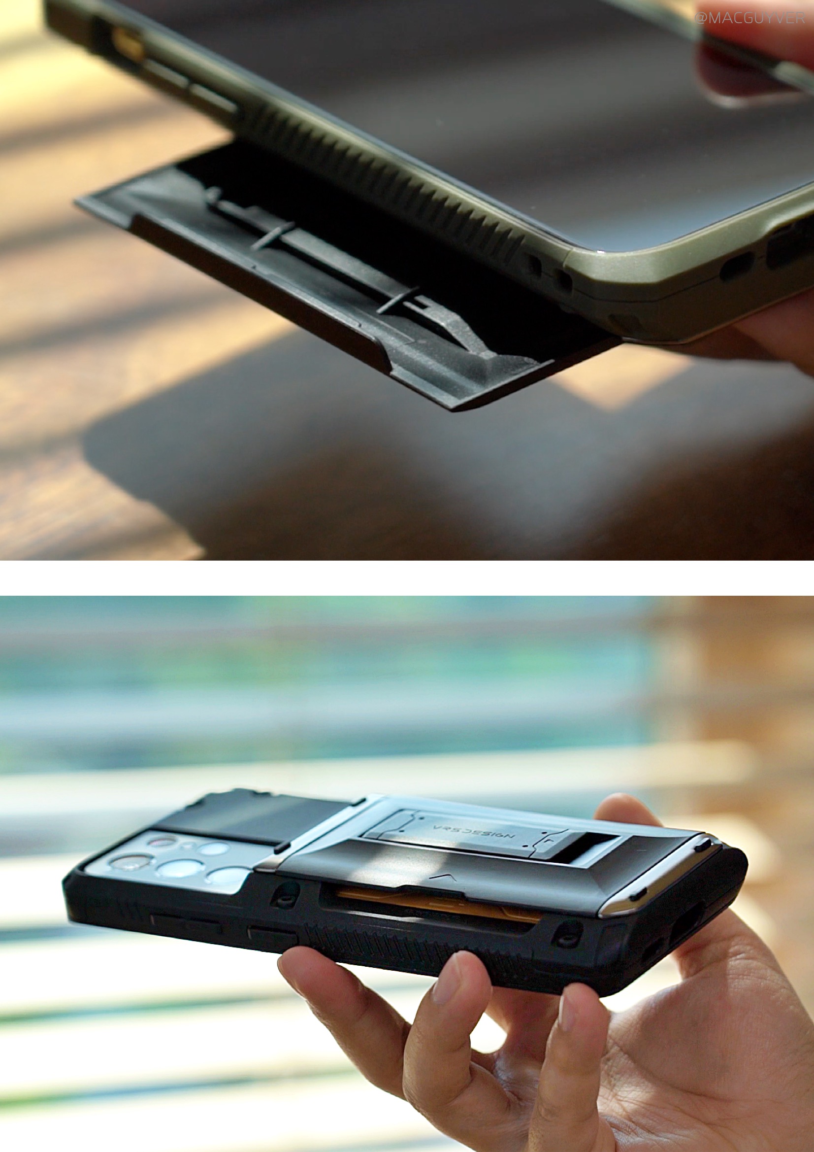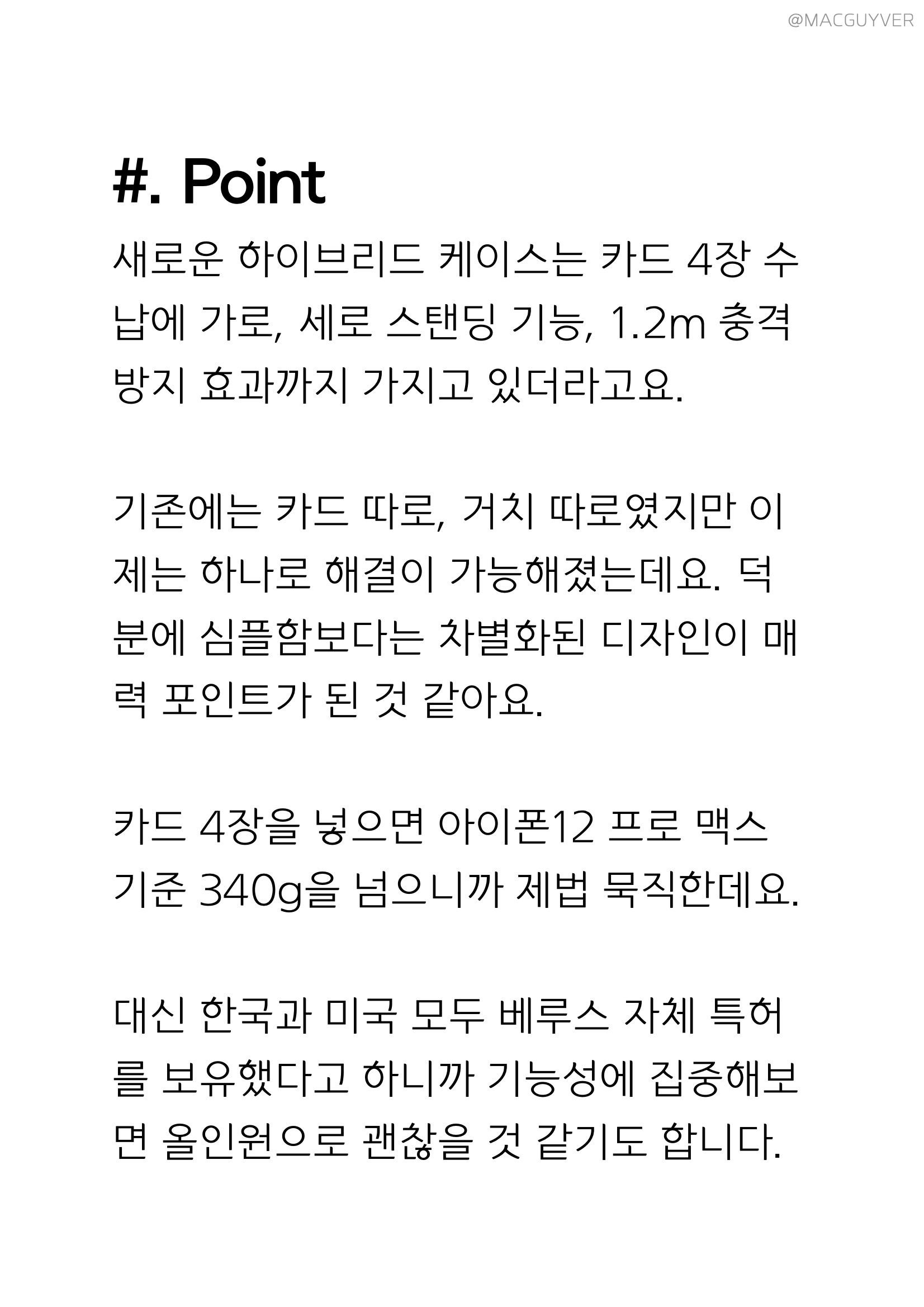 #. 아이폰 케이스 추천 Point 새로운 하이브리드 케이스는 카드 4장 수납에 가로, 세로 스탠딩 기능, 1.2m 충격 방지 효과까지 가지고 있더라고요. 기존에는 카드 따로, 거치 따로였지만 이제는 아이폰 12 거치대 케이스, 아이폰 12 카드 케이스로 하나로 해결이 가능해졌는데요. 덕분에 심플함보다는 차별화된 디자인이 매력 포인트가 된 것 같아요. 카드 4장을 넣으면 아이폰12 프로 맥스 기준 340g을 넘으니까 제법 묵직한데요. 대신 한국과 미국 모두 베루스 자체 특허를 보유했다고 하니까 기능성에 집중해보면 올인원으로 괜찮을 것 같기도 합니다.