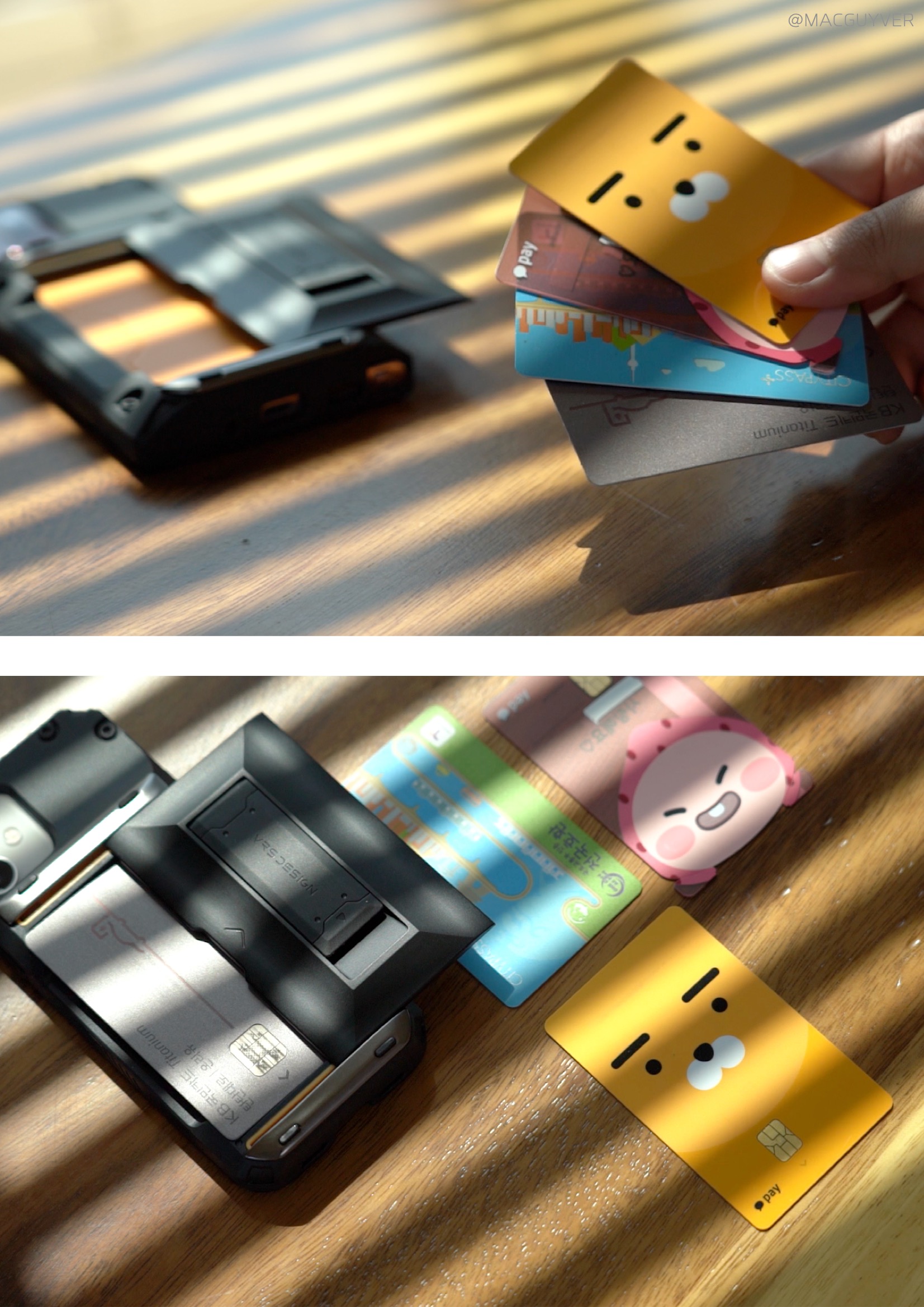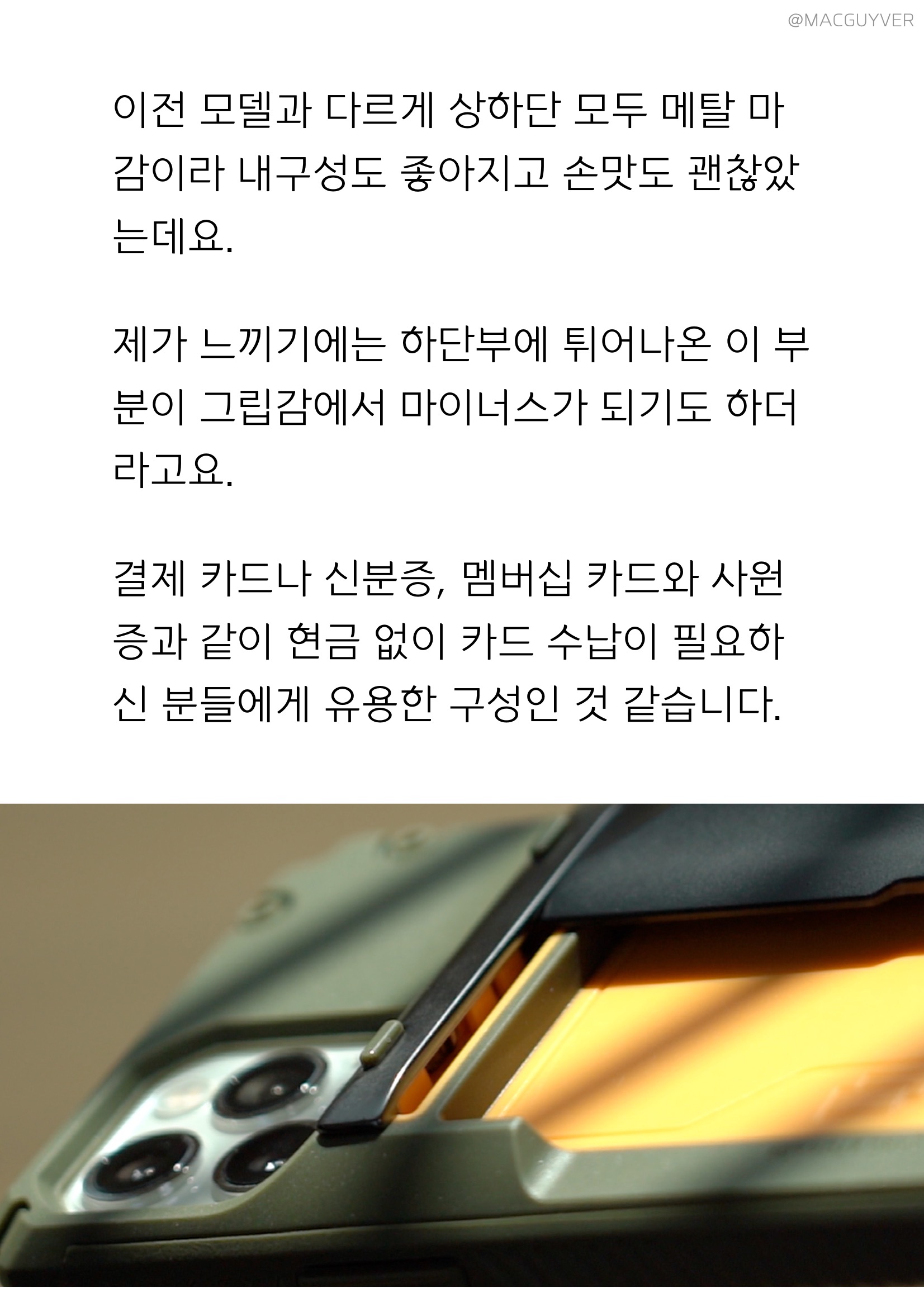 #. 아이폰 12 카드 케이스 Card 4장까지 거뜬한 카드 수납은 커버가 정말 경쾌하게 열리고 닫히는데요. 한쪽을 살짝 밀어주면 부드러우면서도 빠르게 여닫히는 느낌이 묘하게 중독성 있는 게, 카드케이스는 역시 베루스더라고요. 슬라이드 방식으로 열리고 닫히는 힘이 세서, 때로는 시끄럽게 느껴지기도 했는데요. 그만큼 확실하게 닫아줘서 의도치 않게 열려 카드가 쏟아지는 일은 없어서 안심이 되더라고요. 대신 1~2장만 넣어두면 빈 공간이 남아 들썩이면서 소리가 나기도 하고, 무선 충전이나 삼성 페이, 아이폰12 케이스로 맥세이프는 사용하기 힘들다는 게 아쉽기도 합니다. 이전 모델과 다르게 상하단 모두 메탈 마감이라 내구성도 좋아지고 손맛도 괜찮았는데요. 제가 느끼기에는 하단부에 튀어나온 이 부분이 그립감에서 마이너스가 되기도 하더라고요. 결제 카드나 신분증, 멤버십 카드와 사원증과 같이 현금 없이 카드 수납이 필요하신 분들에게 유용한 구성인 것 같습니다.
