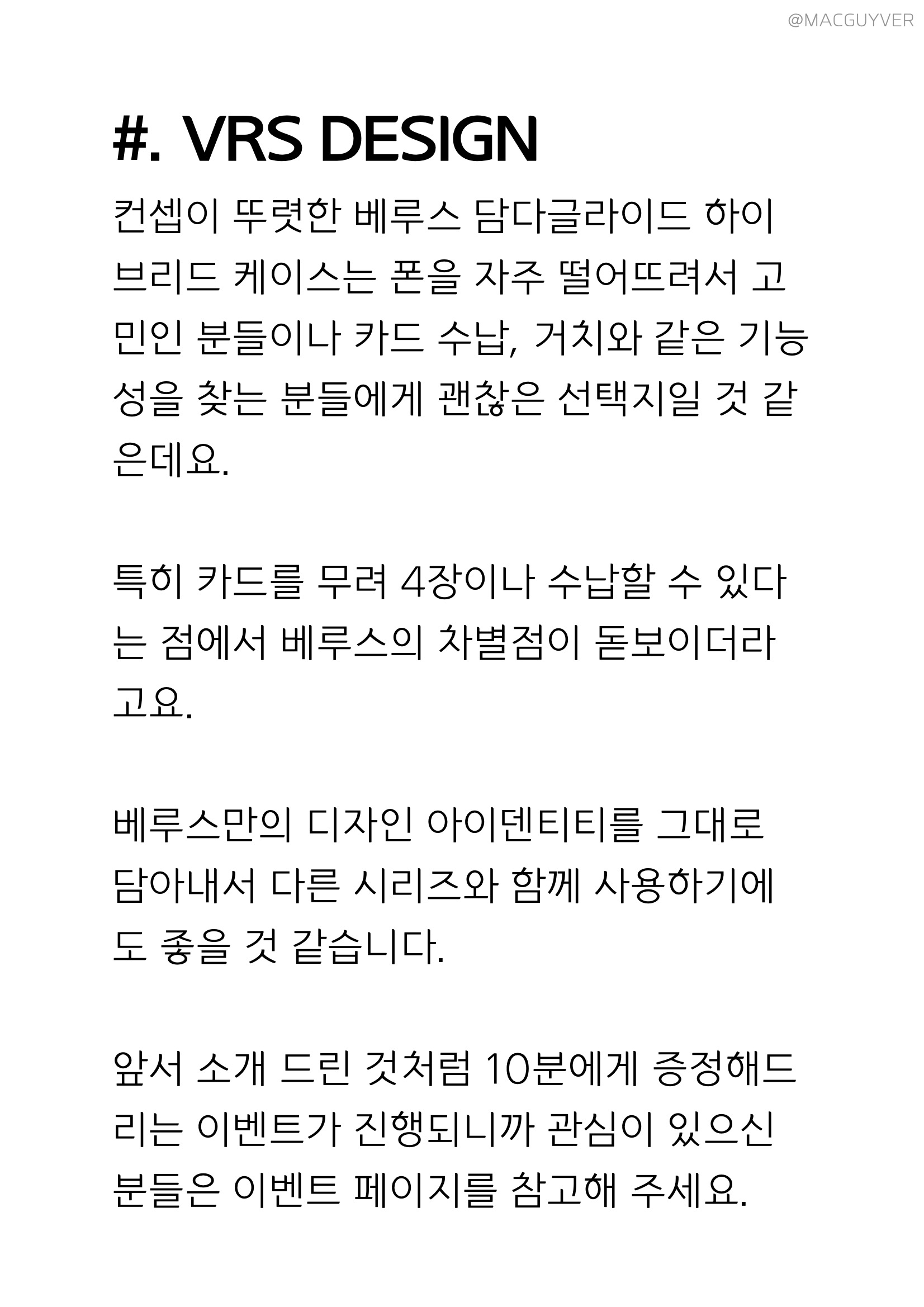 #. 아이폰12프로 케이스 VRS DESIGN 컨셉이 뚜렷한 베루스 담다글라이드 하이브리드 케이스는 폰을 자주 떨어뜨려서 고민인 분들이나 카드 수납, 거치와 같은 기능성을 찾는 분들에게 괜찮은 선택지일 것 같은데요. 특히 카드를 무려 4장이나 수납할 수 있다는 점에서 베루스의 차별점이 돋보이더라고요. 베루스 카드수납 케이스만의 디자인 아이덴티티를 그대로 담아내서 다른 시리즈와 함께 사용하기에도 좋을 것 같습니다. 앞서 소개 드린 것처럼 10분에게 증정해드리는 이벤트가 진행되니까 관심이 있으신 분들은 이벤트 페이지를 참고해 주세요. 오늘 소개해 드린 베루스 담다글라이드 하이브리드 케이스가 궁금하신 분들은 아래 배너를 통해 제품에 대한 보다 상세한 정보와 실구매자 리뷰를 보실 수 있습니다.