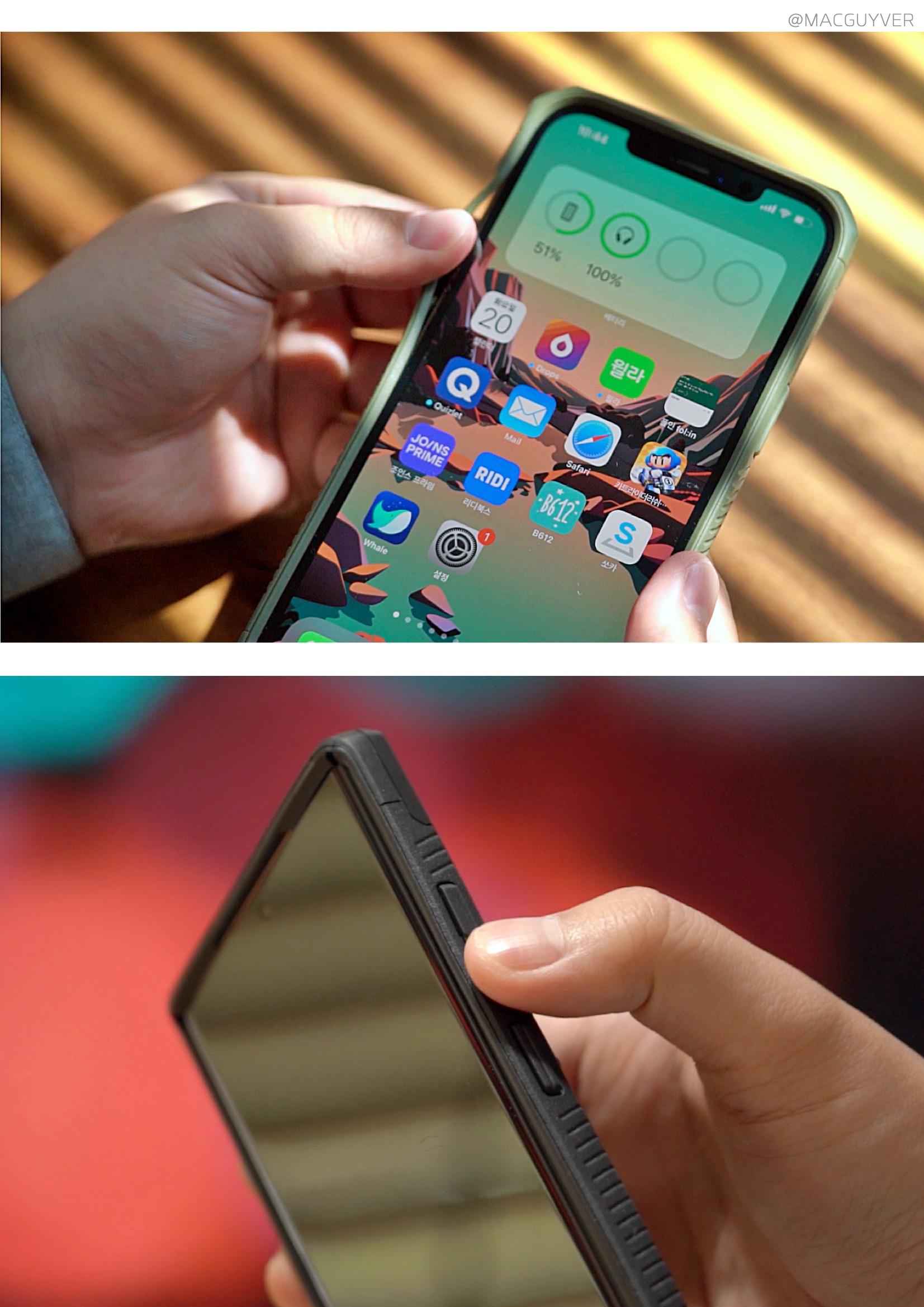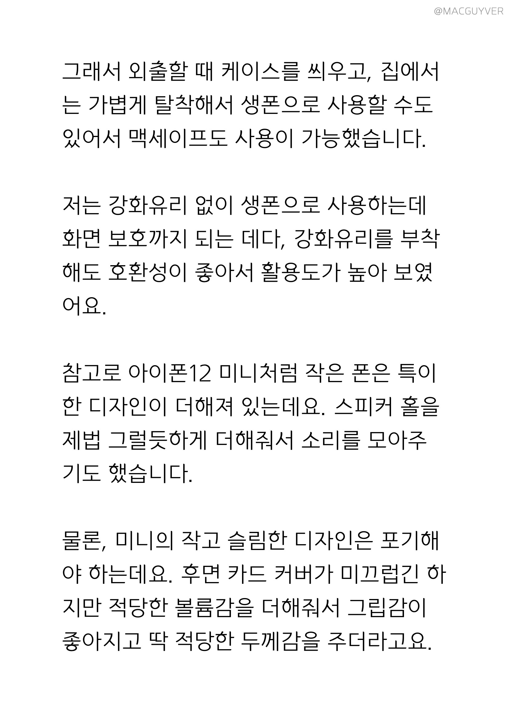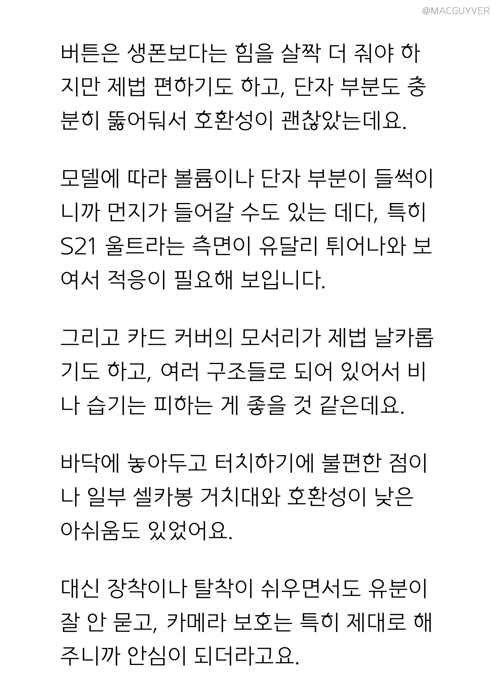 아이폰12프로 케이스 버튼은 생폰보다는 힘을 살짝 더 줘야 하지만 제법 편하기도 하고, 단자 부분도 충분히 뚫어둬서 호환성이 괜찮았는데요. 모델에 따라 볼륨이나 단자 부분이 들썩이니까 먼지가 들어갈 수도 있는 데다, 특히 S21 울트라는 측면이 유달리 튀어나와 보여서 적응이 필요해 보입니다. 그리고 카드수납 케이스 카드 커버를 열어보면 모서리가 제법 날카롭기도 하고, 여러 구조들로 되어 있어서 비나 습기는 피하는 게 좋을 것 같은데요. 바닥에 놓아두고 터치하기에 불편한 점이나 일부 셀카봉 거치대와 호환성이 낮은 아쉬움도 있었어요.대신 장착이나 탈착이 쉬우면서도 유분이 잘 안 묻고, 카메라 보호는 특히 제대로 해주니까 안심이 되더라고요. 그래서 외출할 때 카드 케이스를 씌우고, 집에서는 가볍게 탈착해서 생폰으로 사용할 수도 있어서 맥세이프도 사용이 가능했습니다. 저는 강화유리 없이 생폰으로 사용하는데 화면 보호까지 되는 데다, 강화유리를 부착해도 호환성이 좋아서 활용도가 높아 보였어요. 참고로 아이폰12 미니처럼 작은 폰은 특이한 카드 케이스 디자인이 더해져 있는데요. 스피커 홀을 제법 그럴듯하게 더해줘서 소리를 모아주기도 했습니다. 물론, 미니의 작고 슬림한 디자인은 포기해야 하는데요. 후면 카드 커버가 미끄럽긴 하지만 적당한 볼륨감을 더해줘서 그립감이 좋아지고 딱 적당한 두께감을 주더라고요.
