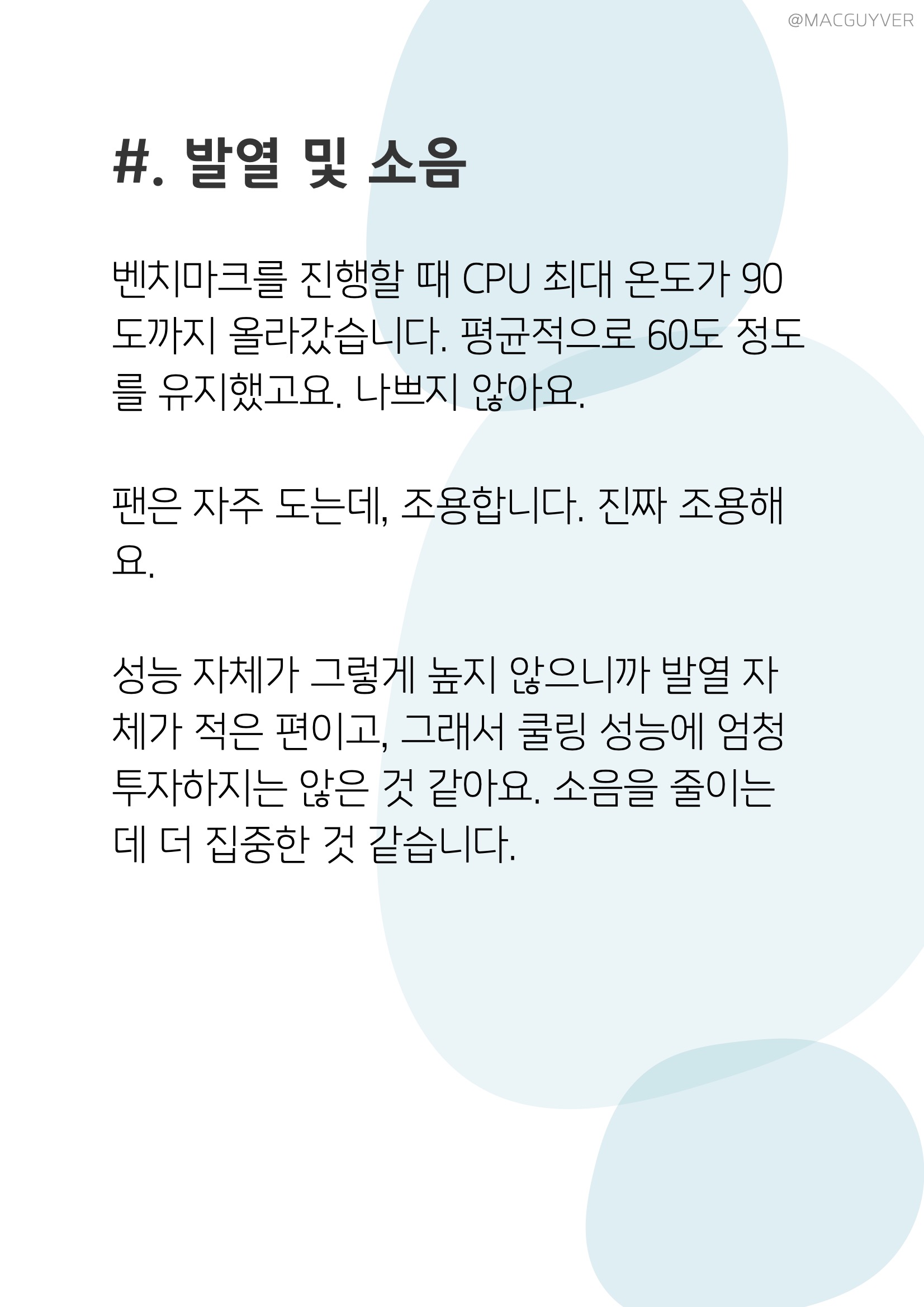 #. 발열 및 소음벤치마크를 진행할 때 CPU 최대 온도가 90도까지 올라갔습니다. 평균적으로 60도 정도를 유지했고요. 나쁘지 않아요.팬은 자주 도는데, 조용합니다. 진짜 조용해요.성능 자체가 그렇게 높지 않으니까 발열 자체가 적은 편이고, 그래서 쿨링 성능에 엄청 투자하지는 않은 것 같아요. 소음을 줄이는데 더 집중한 것 같습니다.