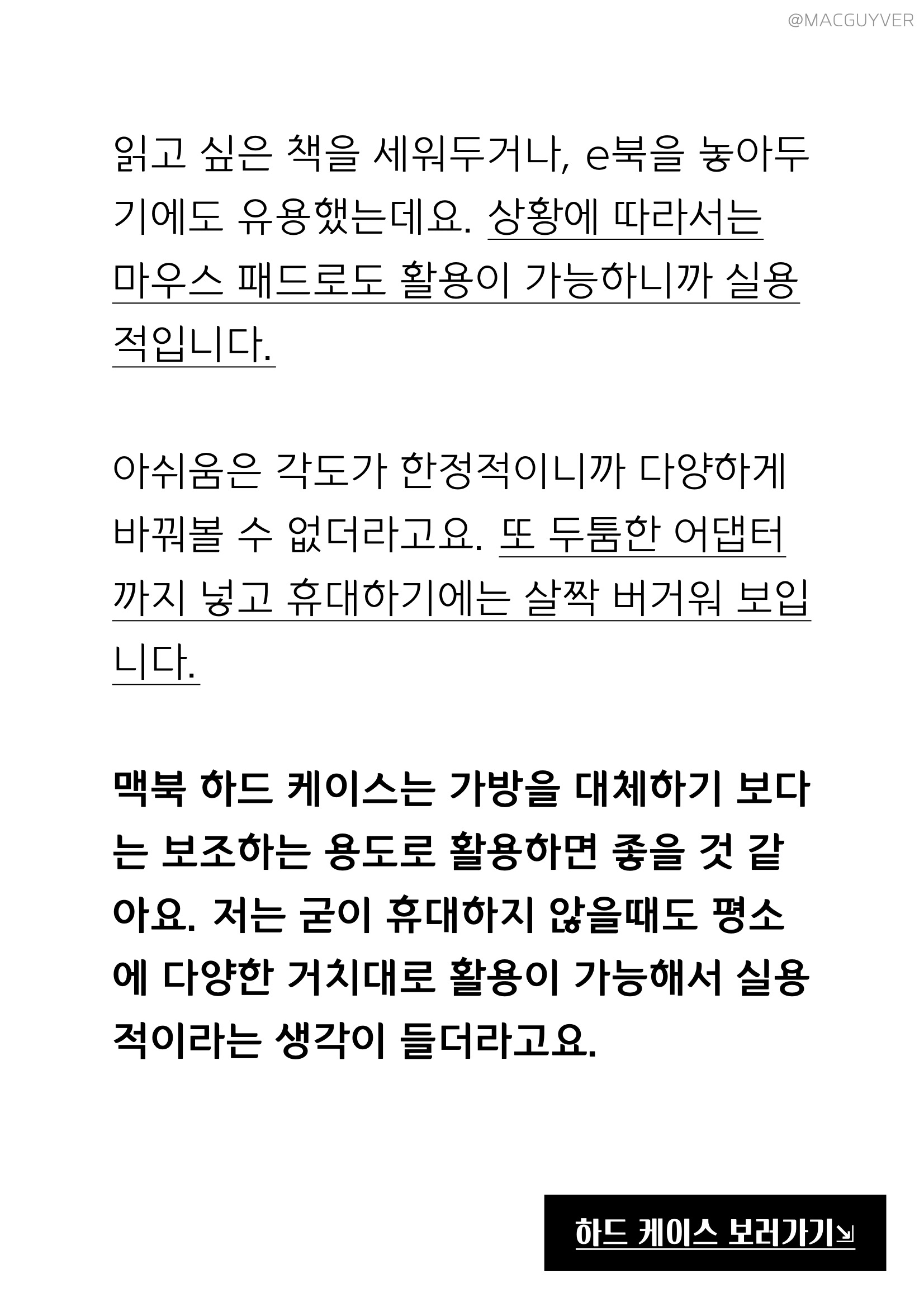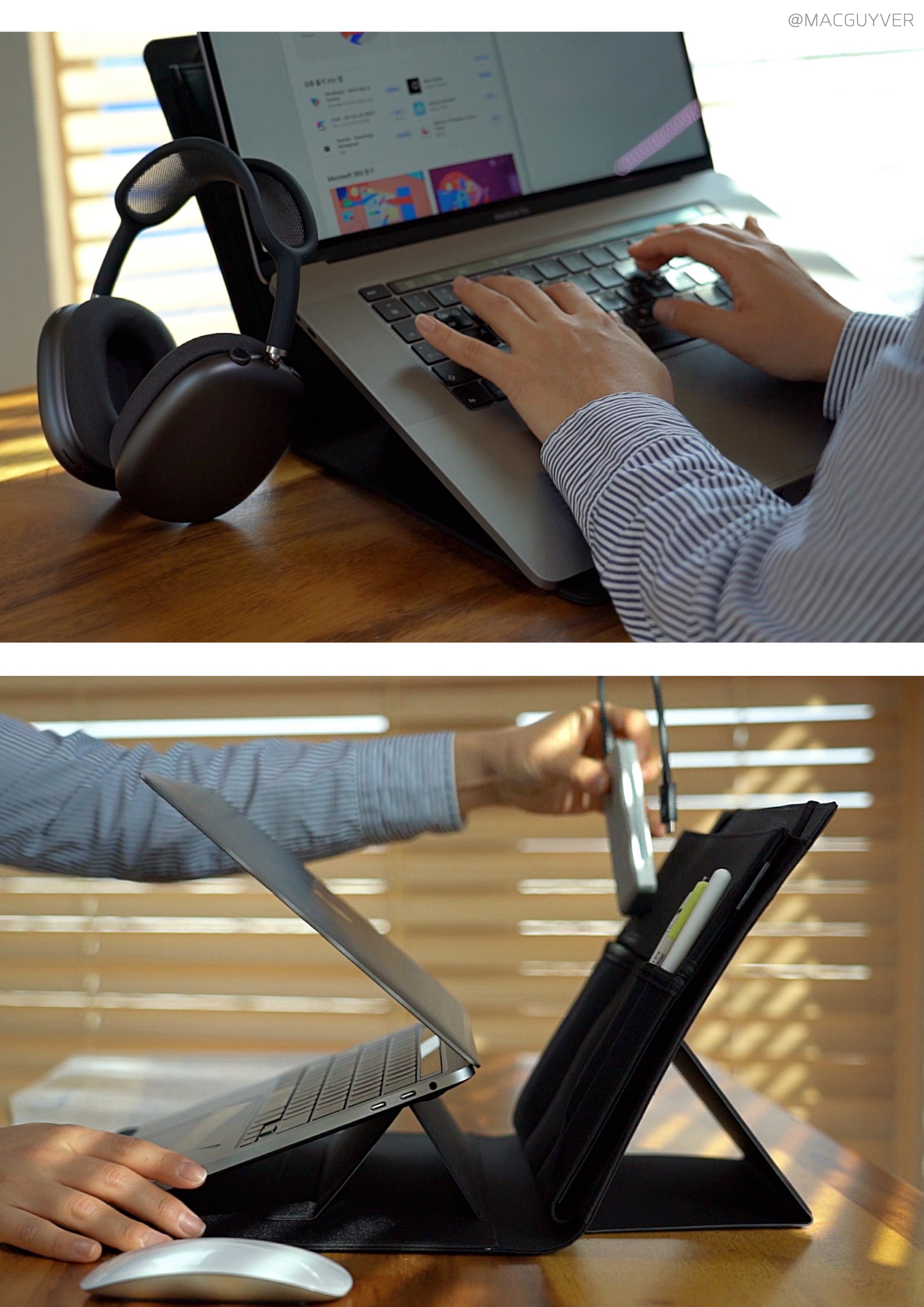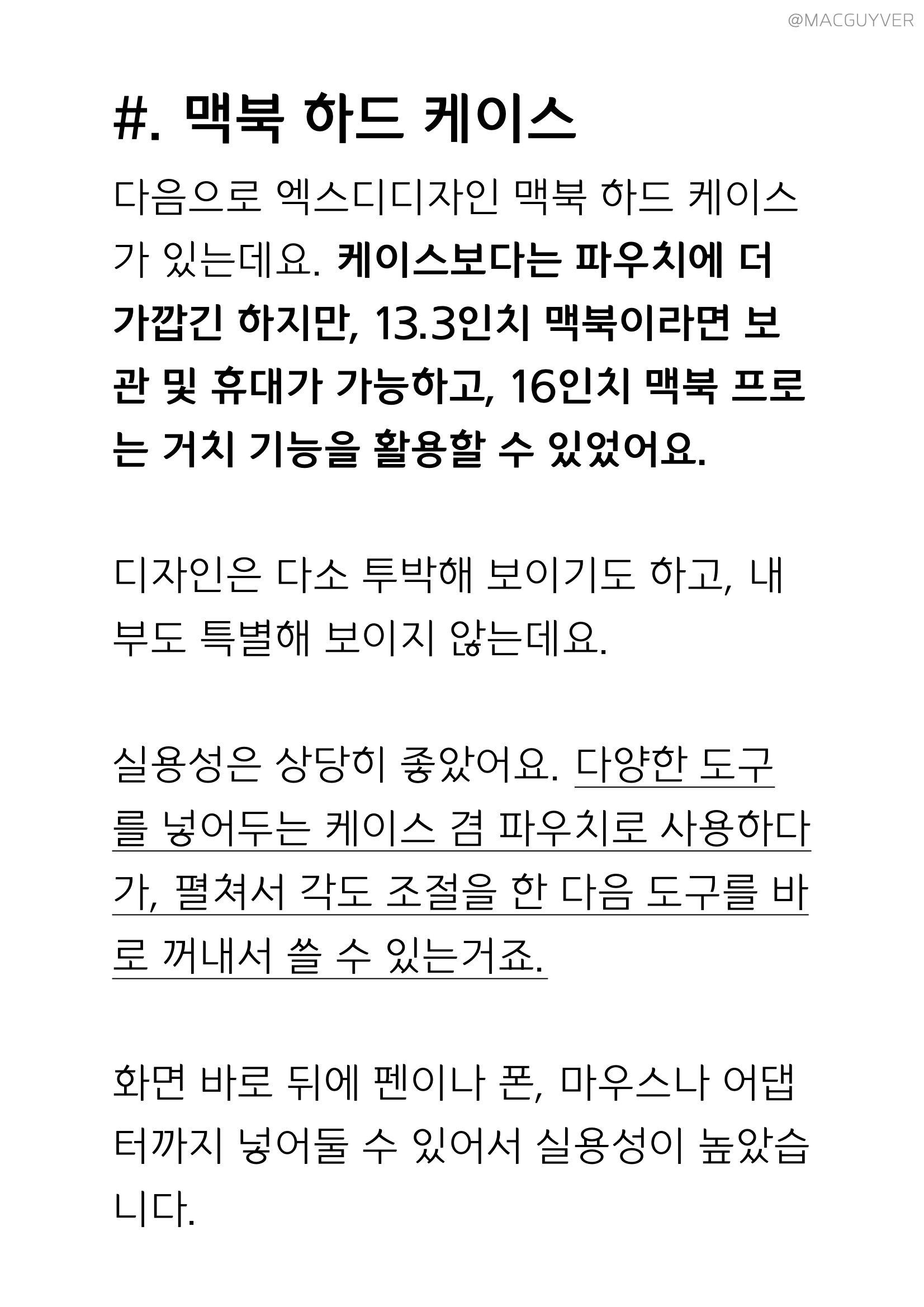 #. 맥북 하드 케이스 다음으로 엑스디디자인 맥북 하드 케이스가 있는데요. 케이스보다는 노트북파우치에 더 가깝긴 하지만, 13.3인치 맥북이라면 보관 및 휴대가 가능하고, 16인치 맥북 프로는 거치 기능을 활용할 수 있었어요. 맥북하드케이스 디자인은 다소 투박해 보이기도 하고, 내부도 특별해 보이지 않는데요. 맥북하드케이스 실용성은 상당히 좋았어요. 다양한 도구를 넣어두는 케이스 겸 파우치로 사용하다가, 펼쳐서 각도 조절을 한 다음 도구를 바로 꺼내서 쓸 수 있는거죠. 화면 바로 뒤에 펜이나 폰, 마우스나 어댑터까지 넣어둘 수 있어서 실용성이 높았습니다. 읽고 싶은 책을 세워두거나, e북을 놓아두기에도 유용했는데요. 상황에 따라서는 마우스 패드로도 활용이 가능하니까 실용적입니다. 아쉬움은 각도가 한정적이니까 다양하게 바꿔볼 수 없더라고요. 또 두툼한 어댑터까지 넣고 휴대하기에는 버거워 보입니다. 맥북 하드 케이스는 가방을 대체하기 보다는 보조하는 용도로 노트북파우치로 활용하면 좋을 것 같아요. 저는 굳이 휴대하지 않을때도 평소에 다양한 거치대로 활용이 가능해서 실용적이라는 생각이 들더라고요.