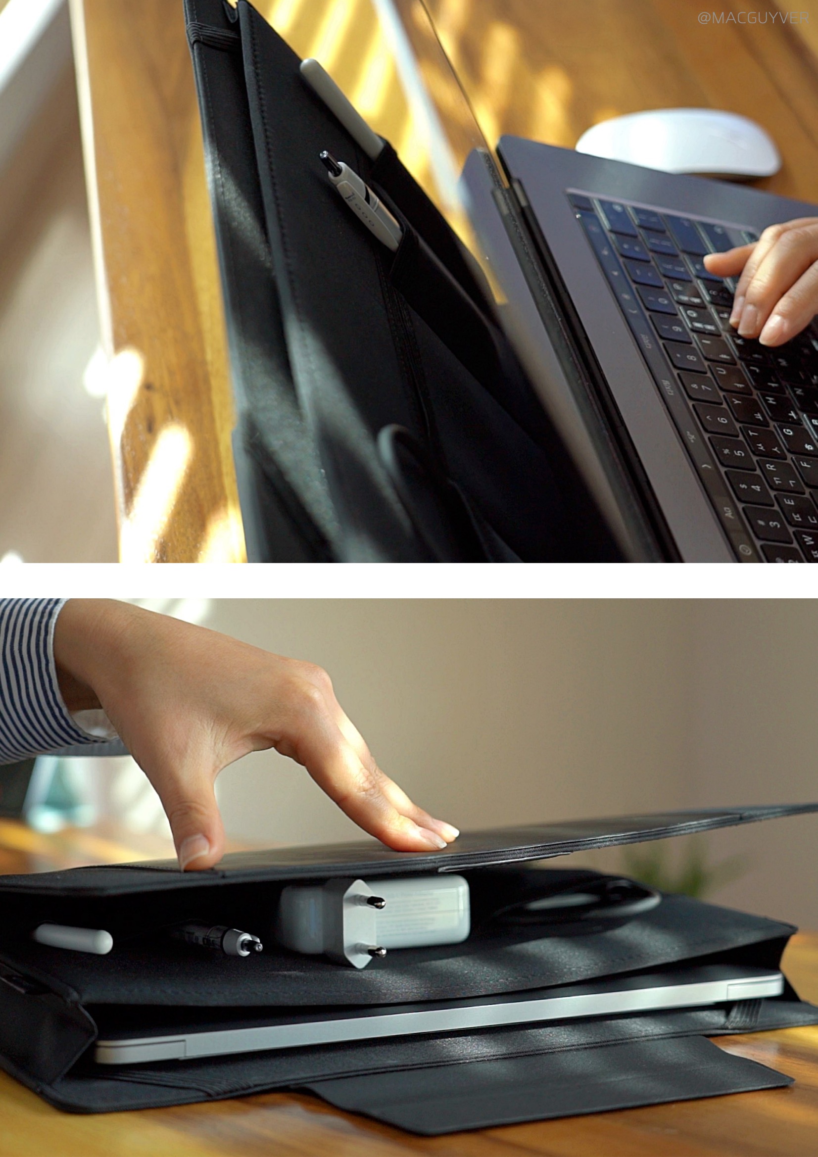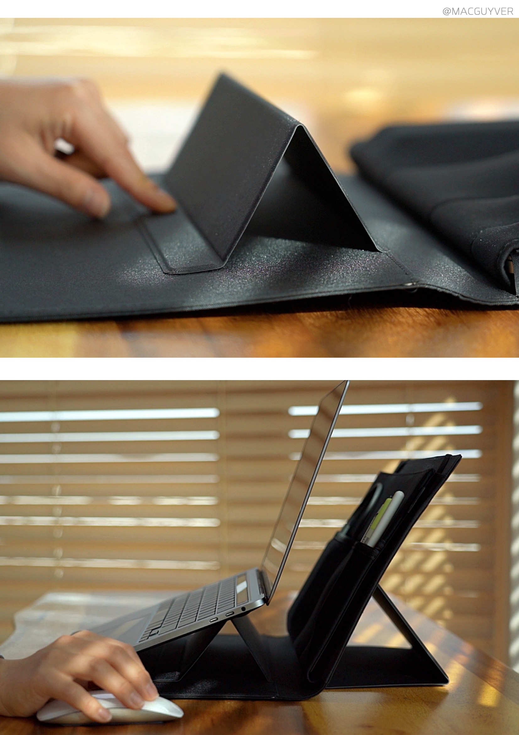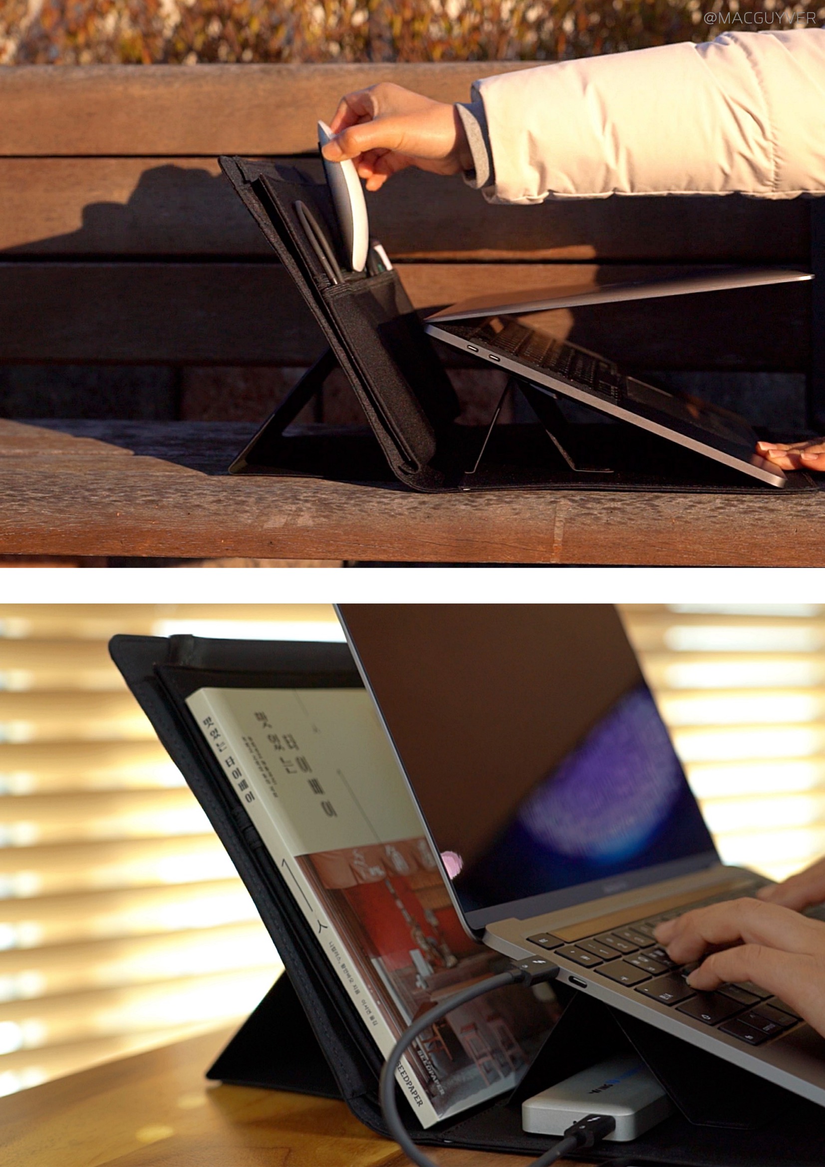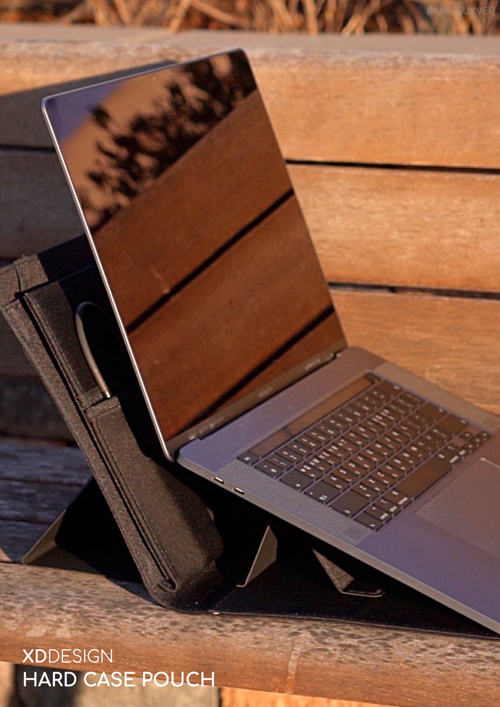 #. 맥북 하드 케이스 다음으로 엑스디디자인 맥북 하드 케이스가 있는데요. 케이스보다는 노트북파우치에 더 가깝긴 하지만, 13.3인치 맥북이라면 보관 및 휴대가 가능하고, 16인치 맥북 프로는 거치 기능을 활용할 수 있었어요. 맥북하드케이스 디자인은 다소 투박해 보이기도 하고, 내부도 특별해 보이지 않는데요. 맥북하드케이스 실용성은 상당히 좋았어요. 다양한 도구를 넣어두는 케이스 겸 파우치로 사용하다가, 펼쳐서 각도 조절을 한 다음 도구를 바로 꺼내서 쓸 수 있는거죠. 화면 바로 뒤에 펜이나 폰, 마우스나 어댑터까지 넣어둘 수 있어서 실용성이 높았습니다. 읽고 싶은 책을 세워두거나, e북을 놓아두기에도 유용했는데요. 상황에 따라서는 마우스 패드로도 활용이 가능하니까 실용적입니다. 아쉬움은 각도가 한정적이니까 다양하게 바꿔볼 수 없더라고요. 또 두툼한 어댑터까지 넣고 휴대하기에는 버거워 보입니다. 맥북 하드 케이스는 가방을 대체하기 보다는 보조하는 용도로 노트북파우치로 활용하면 좋을 것 같아요. 저는 굳이 휴대하지 않을때도 평소에 다양한 거치대로 활용이 가능해서 실용적이라는 생각이 들더라고요.