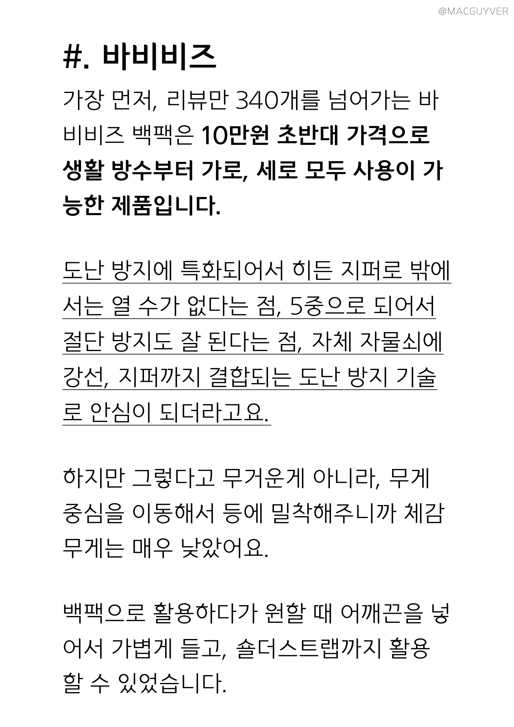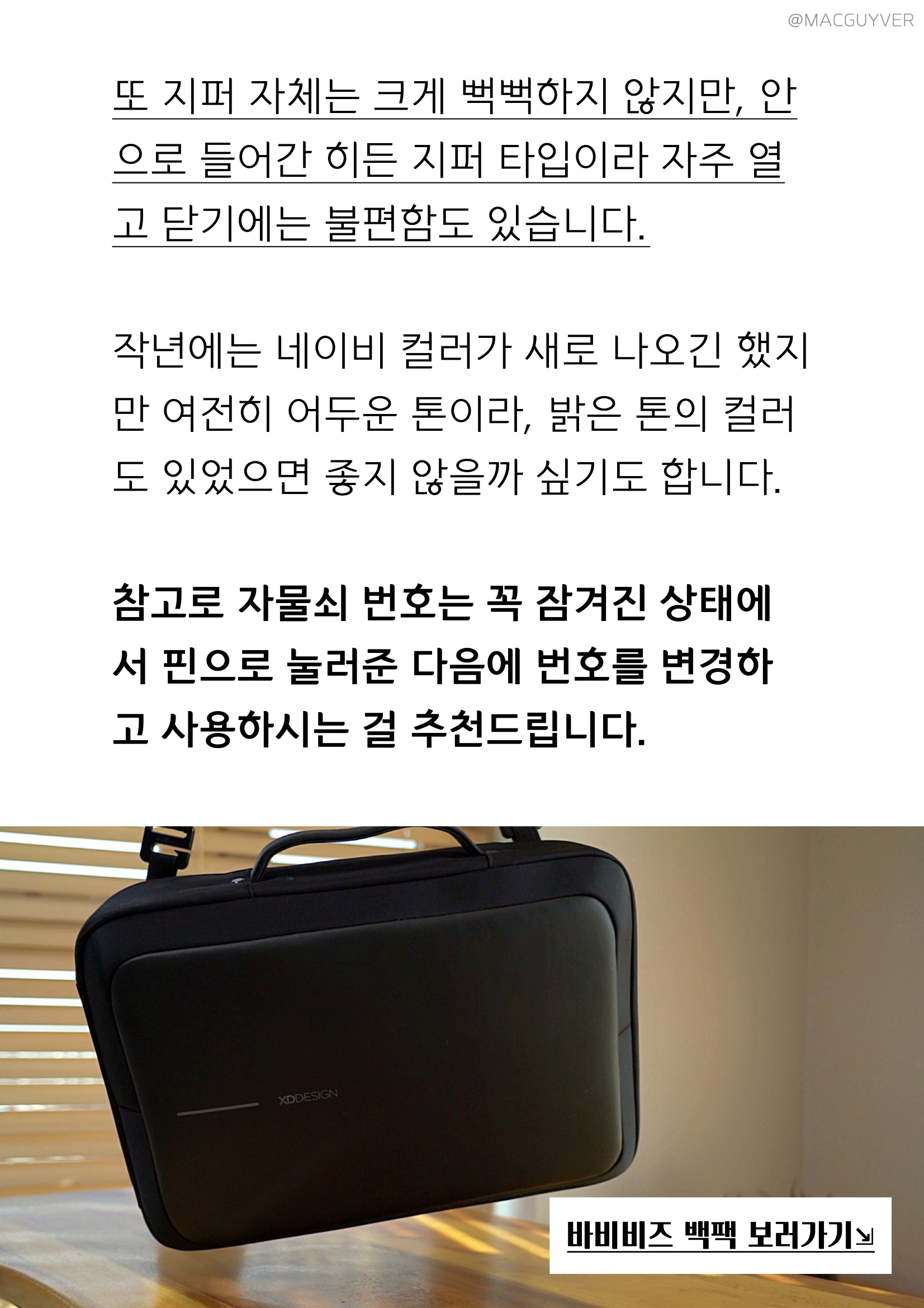 #. 남성 백팩 바비비즈 가장 먼저, 리뷰만 340개를 넘어가는 남자 직장인 백팩 바비비즈 백팩은 10만원 초반대 가격으로 생활 방수부터 가로, 세로 모두 사용이 가능한 제품입니다. 도난 방지에 특화되어서 히든 지퍼로 밖에서는 열 수가 없다는 점, 5중으로 되어서 절단 방지도 잘 된다는 점, 자체 자물쇠에 강선, 지퍼까지 결합되는 도난 방지 기술로 안심이 되더라고요. 하지만 그렇다고 무거운게 아니라, 무게 중심을 이동해서 등에 밀착해주니까 체감 무게는 매우 낮았어요. 남자 직장인 백팩 백팩으로 활용하다가 원할 때 어깨끈을 넣어서 가볍게 들고, 숄더스트랩까지 활용할 수 있었습니다. 재질감이 상당히 좋은데다, 30도부터 다양한 각도로 펼쳐지는 센스있는 구조, 내부 수납 공간 분리까지 다양한 장점이 눈에 띄더라고요. 가방 안쪽으로는 보조배터리를 넣어두고 측면 포켓으로 케이블을 연결해서 가볍게 충전해볼 수도 있었는데요. 남성 백팩 어깨끈에는 히든포켓이 좌우로 하나씩 있어서 카드, 신분증, 현금을 넣어두고 바로 꺼내쓸 수 있었습니다. 물론 남자 백팩 파티션이 잘 되어 있기는 하지만 가운데 빈 공간이 다소 넓게 남아있을 때도 있어서 파티션이 있었으면 싶을때도 있더라고요. 또 지퍼 자체는 크게 뻑뻑하지 않지만, 안으로 들어간 히든 지퍼 타입이라 자주 열고 닫기에는 불편함도 있습니다. 비즈니스 백팩 작년에는 네이비 컬러가 새로 나오긴 했지만 여전히 어두운 톤이라, 밝은 톤의 컬러도 있었으면 좋지 않을까 싶기도 합니다. 참고로 자물쇠 번호는 꼭 잠겨진 상태에서 핀으로 눌러준 다음에 번호를 변경하고 사용하시는 걸 추천드립니다.