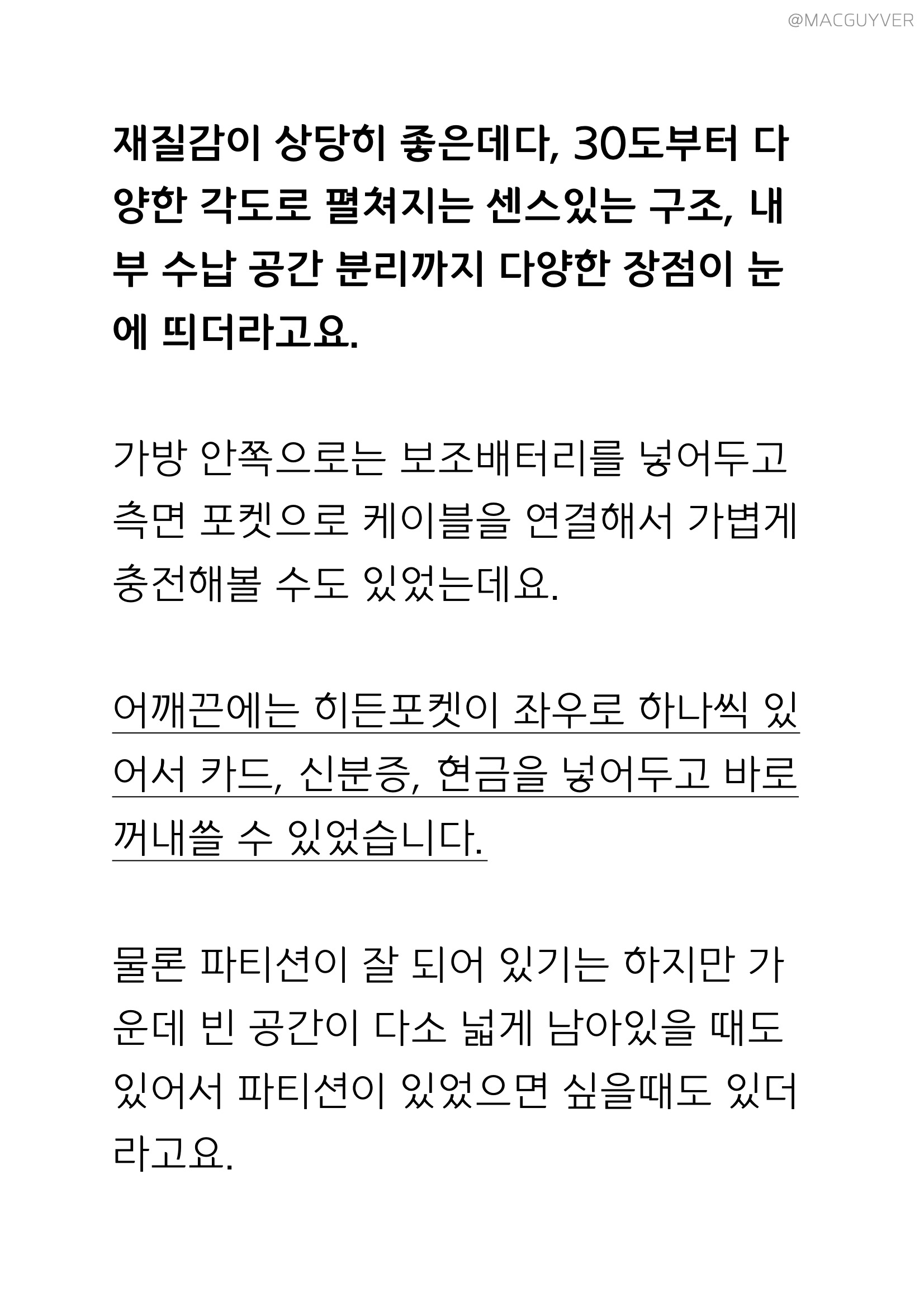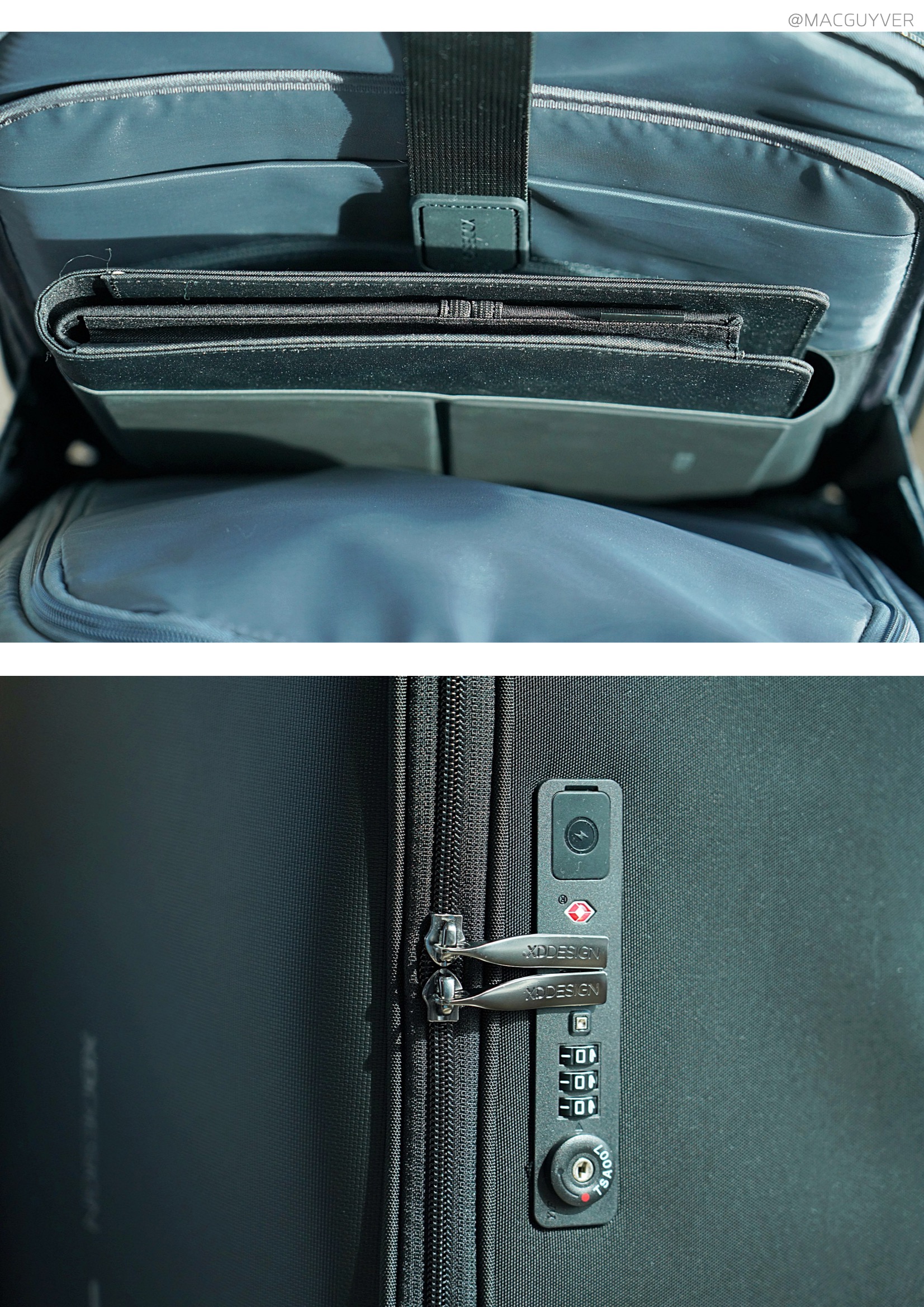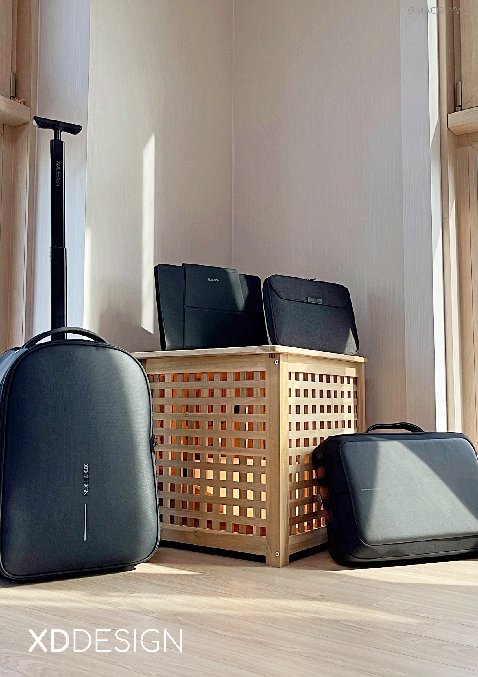 #. 트롤리 백팩 엑스디디자인 뉴 컬렉션 여행용 캐리어도 있습니다. 20만원 정도의 가격으로 생활 방수부터 절단 방지, 실용성까지 모두 더했는데요. 백팩으로 쓰다가도 필요할 때 핸들을 꺼내서 가볍게 이동할 수 있어서 계단이든 도로든 자유롭게 맞춰서 써볼 수 있겠더라고요. 센스있는 구조로 되어서 휠에 옷이 손상되지 않게 커버로 덮을 수 있게 되어있고, 충전을 위한 단자도 눈에 띕니다. 캐리어 자물쇠 디자인이나 구성도 상당히 깔끔하고 고급스러운데다 크기 대비 체감 무게도 가벼워서 부담을 줄여줬어요. 하지만 구조적으로 노트북을 가장 멀리 보관하게 되어 있어서 넣고 빼는 건 쉽지만 무게 중심이 멀리 있는 아쉬움은 있습니다. 트롤리 백팩 내부 공간은 상당히 넓게 되어서 공간 활용성이 좋긴 한데, 파티션이 없어서 짐이 섞일 수 있더라고요. 대신 수납함이 다양하고 내부 공간과 완전히 분리가 되어서 목적에 맞는 사용이 가능했어요. 노트북은 17.3형까지 수납이 되니까 넉넉하고, 확 펼쳐지지 않게 잡아주니까 편한 각도로 열어볼 수 있습니다. 가벼운 출장, 여행에서도 유용한 비즈니스 백팩, 남자 직장인 백팩으로 활용이 가능하지 않을까 싶더라고요.