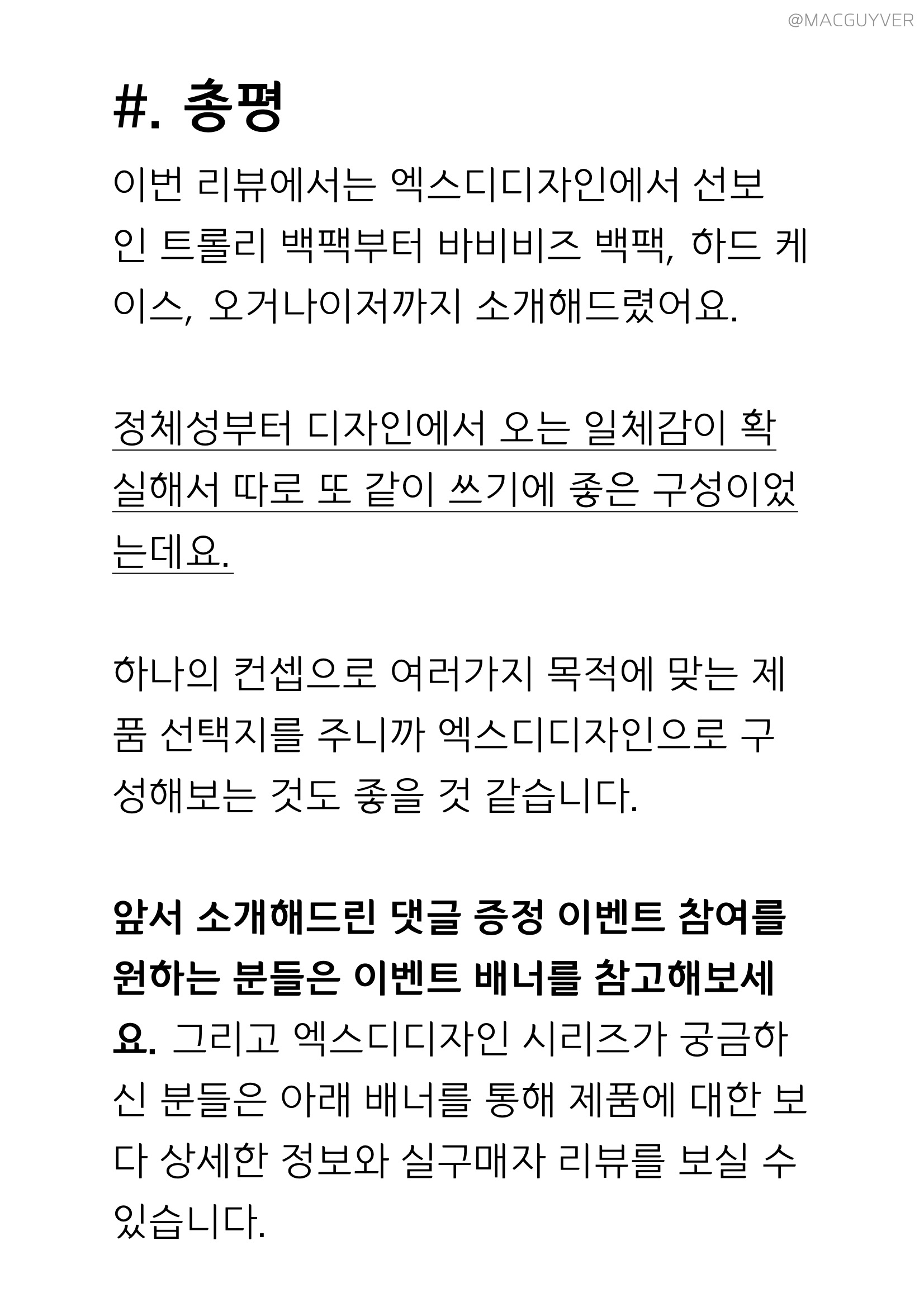 #. 총평 이번 리뷰에서는 엑스디디자인에서 선보인 트롤리 백팩부터 바비비즈 백팩, 하드 케이스, 오거나이저까지 소개해드렸어요. 정체성부터 디자인에서 오는 일체감이 확실해서 따로 또 같이 쓰기에 좋은 구성이었는데요. 하나의 컨셉으로 여러가지 목적에 맞는 제품 선택지를 주니까 엑스디디자인으로 구성해보는 것도 좋을 것 같습니다. 앞서 소개해드린 댓글 증정 이벤트 참여를 원하는 분들은 이벤트 배너를 참고해보세요. 그리고 엑스디디자인 시리즈가 궁금하신 분들은 아래 배너를 통해 제품에 대한 보다 상세한 정보와 실구매자 리뷰를 보실 수 있습니다.