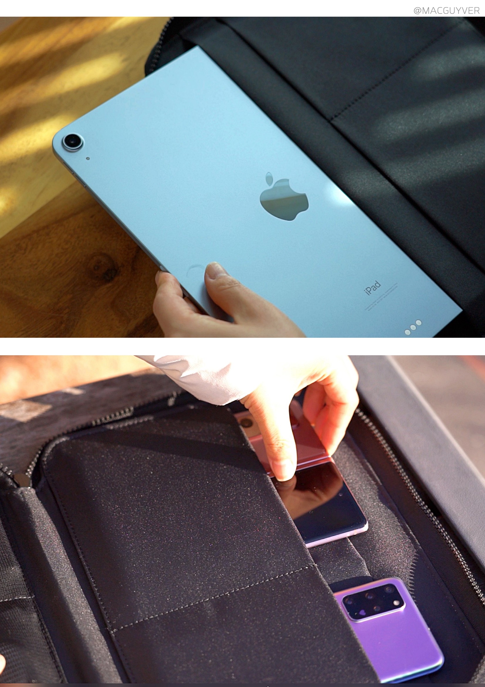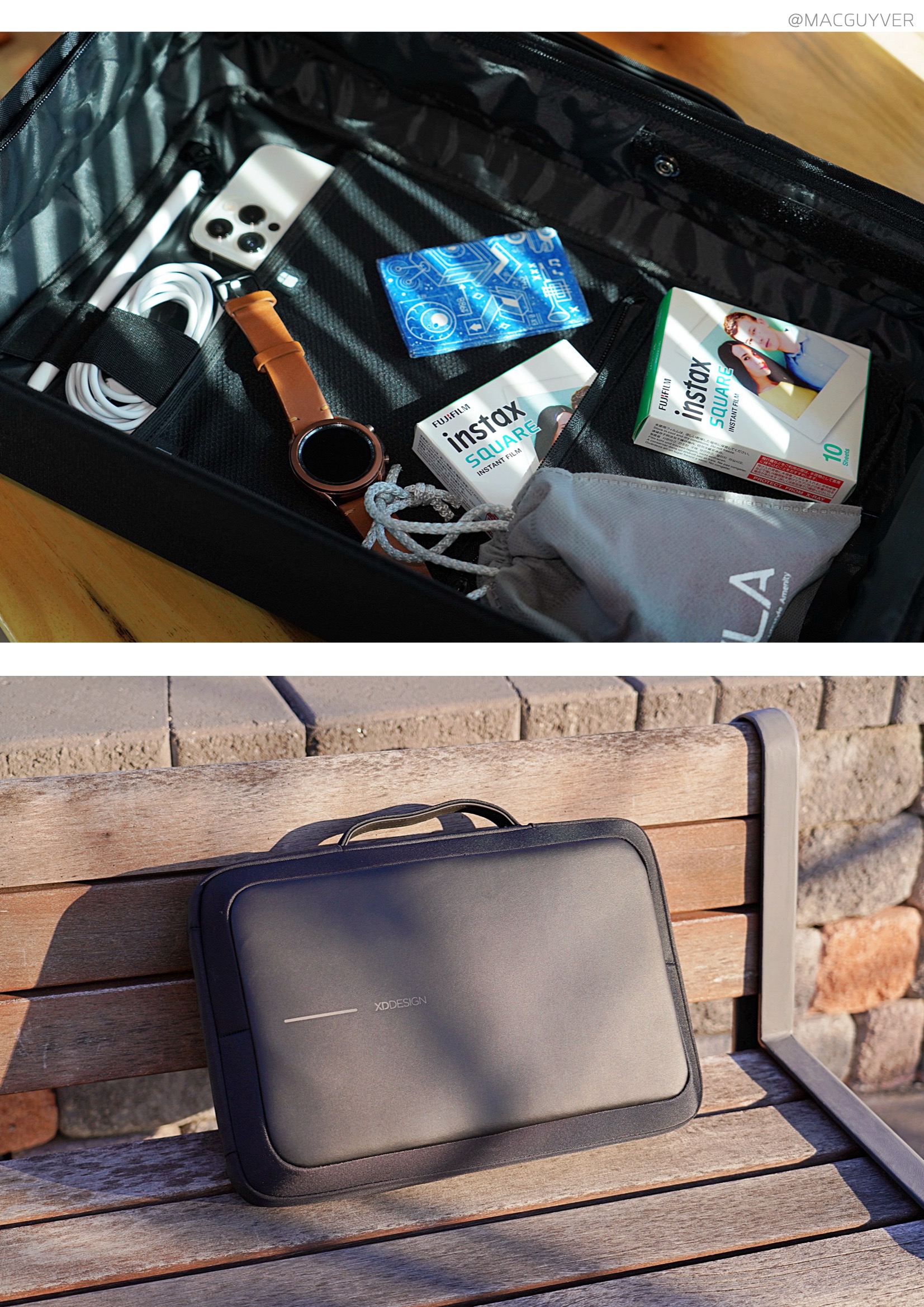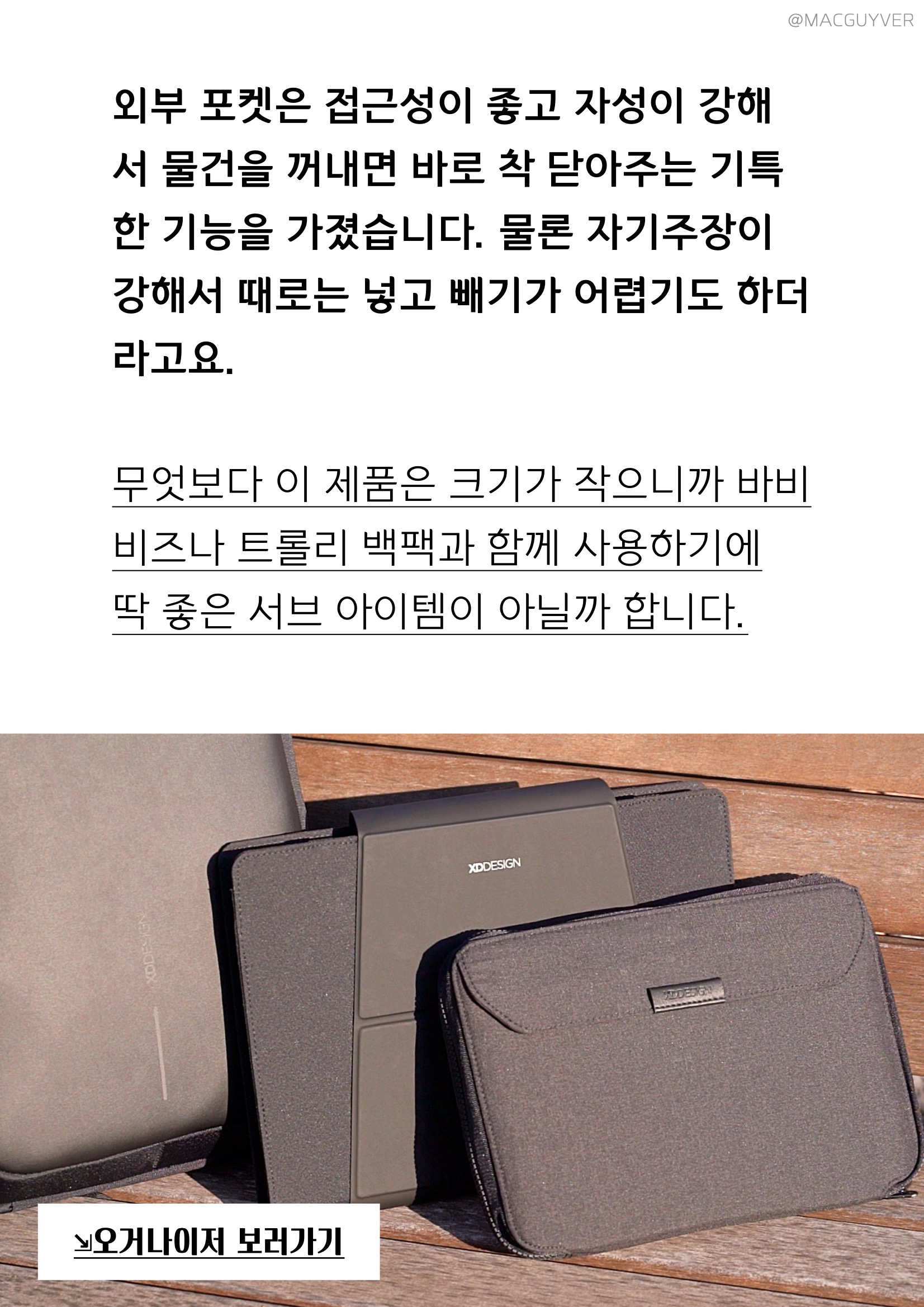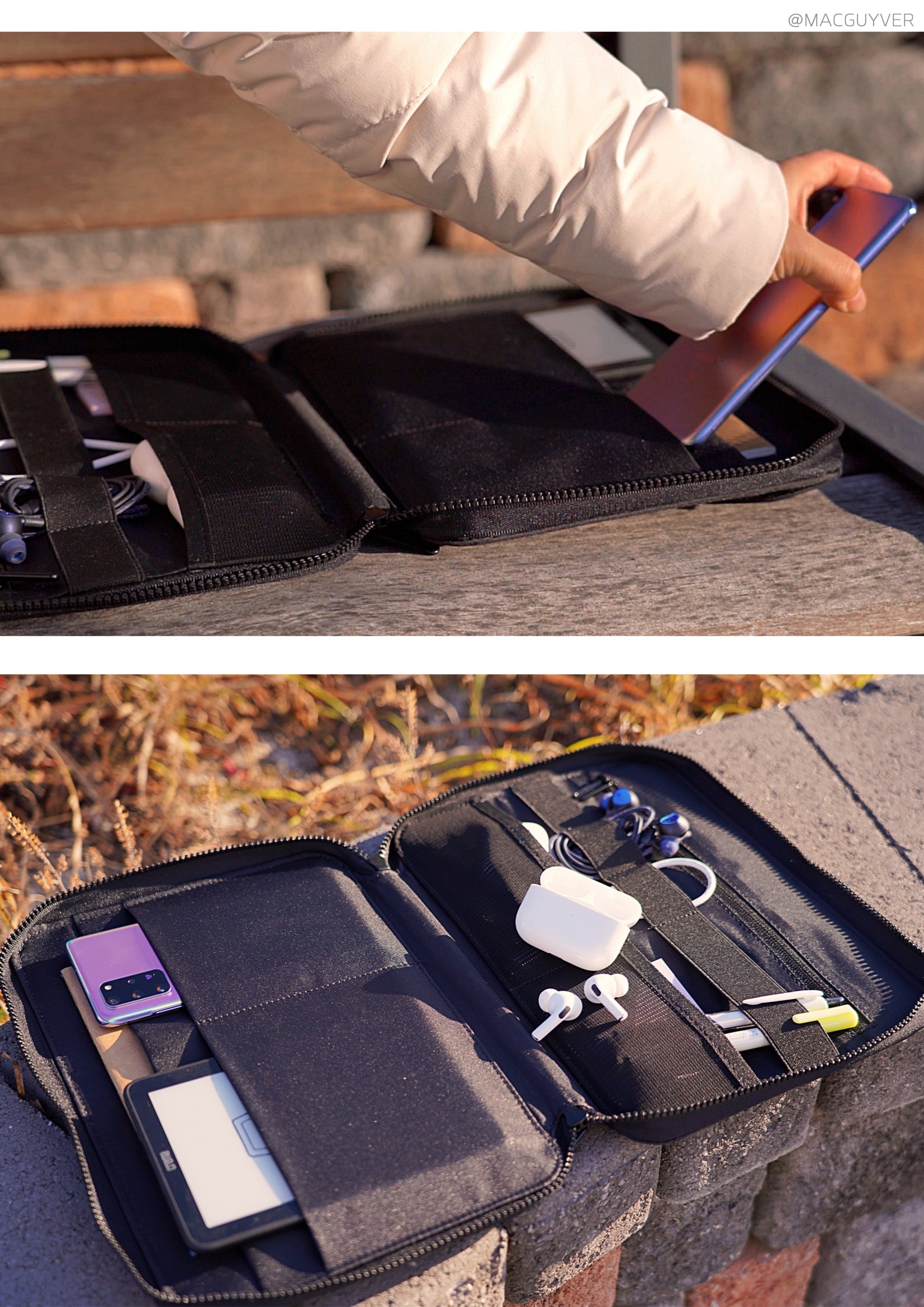 #. 오거나이저 마지막으로 엑스디디자인 오거나이저 테크 파우치가 있습니다. 전체적으로 디자인은 투박하면서 심플해 보이는데요. 테크 파우치 실용적인 기능에 집중한 제품이었어요. 지퍼는 부드럽고, 180도로 펼쳐지는데다 아이패드 에어4, 프로11형까지 모두 호환이 됩니다. 매직 키보드와 같은 별도의 케이스나 키보드를 쓴다면 가운데 넣어둘 수 있더라고요. 파티션이 다양하고 종류나 스타일도 달라서 목적에 맞는 수납이 되었는데요. 특히 케이블이나 이어폰이 엉키지 않게 정리되는 점도 큰 장점입니다. 흠집에 대한 우려도 낮고, 오염 가능성도 낮아서 편하게 막 쓸 수 있는 제품이었어요. 액세서리 파우치 외부 포켓은 접근성이 좋고 자성이 강해서 물건을 꺼내면 바로 착 닫아주는 기특한 기능을 가졌습니다. 물론 자기주장이 강해서 때로는 넣고 빼기가 어렵기도 하더라고요. 무엇보다 이 제품은 크기가 작으니까 바비비즈나 트롤리 백팩과 함께 사용하기에 딱 좋은 서브 아이템이 아닐까 합니다.