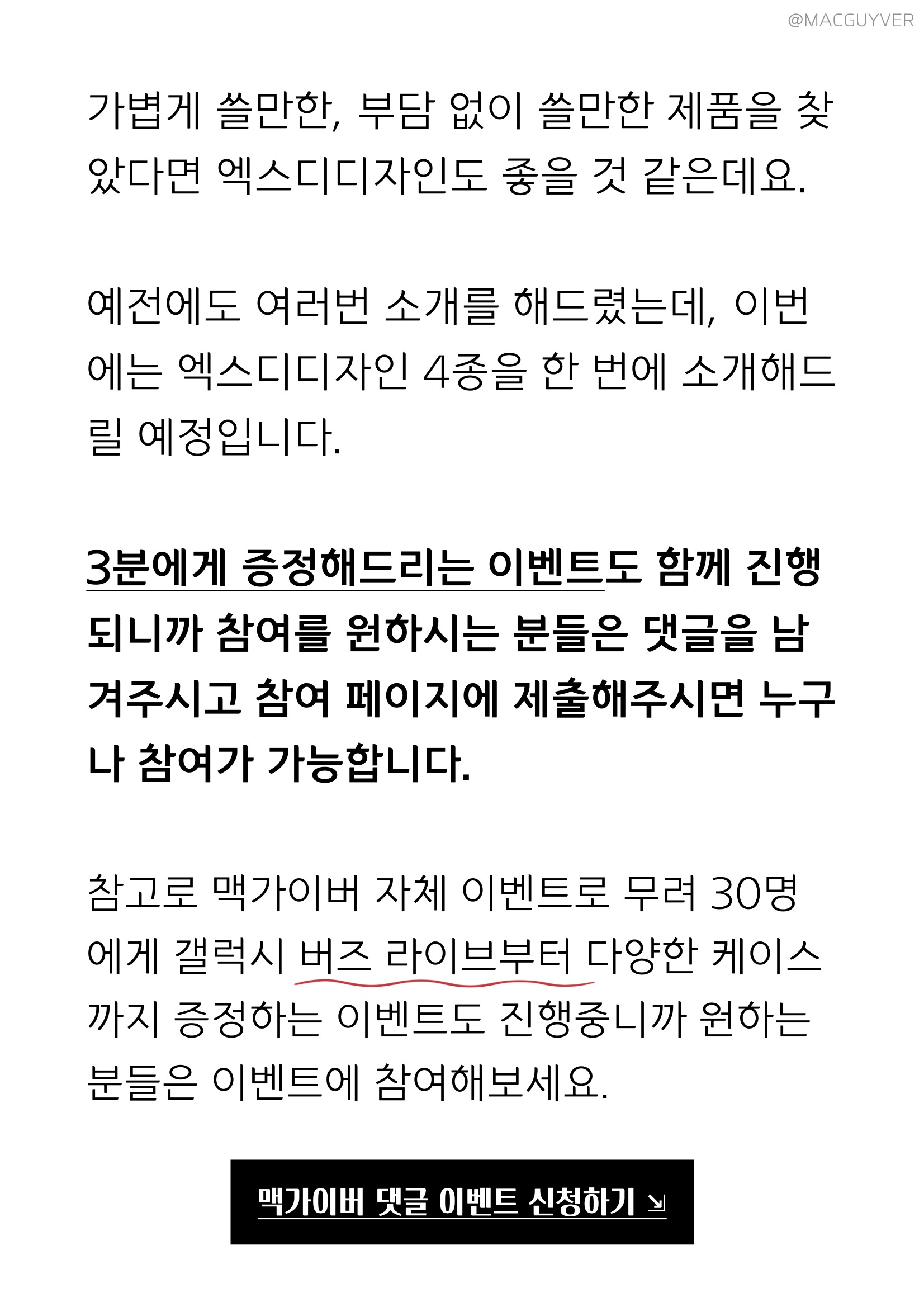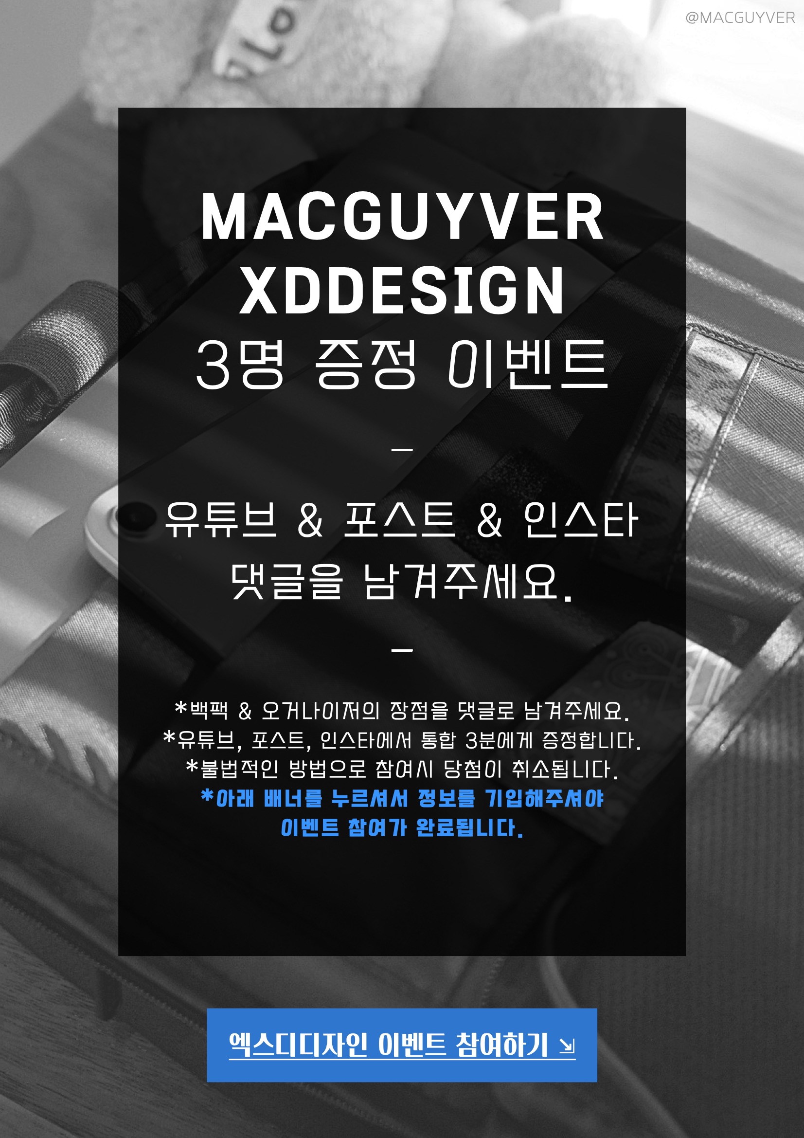 가볍게 쓸만한, 부담 없이 쓸만한 제품을 찾았다면 엑스디디자인 시리즈도 좋을 것 같은데요. 예전에도 여러번 소개를 해드렸는데, 이번에는 엑스디디자인 4종 바비비즈 남성 백팩, 트롤리 백팩, 맥북 하드 케이스, 오거나이저를 한 번에 소개해드릴 예정입니다. 참고로 3분에게 증정해드리는 이벤트도 함께 진행되니까 참여를 원하시는 분들은 댓글을 남겨주시고 참여 페이지에 제출해주시면 누구나 참여가 가능합니다.