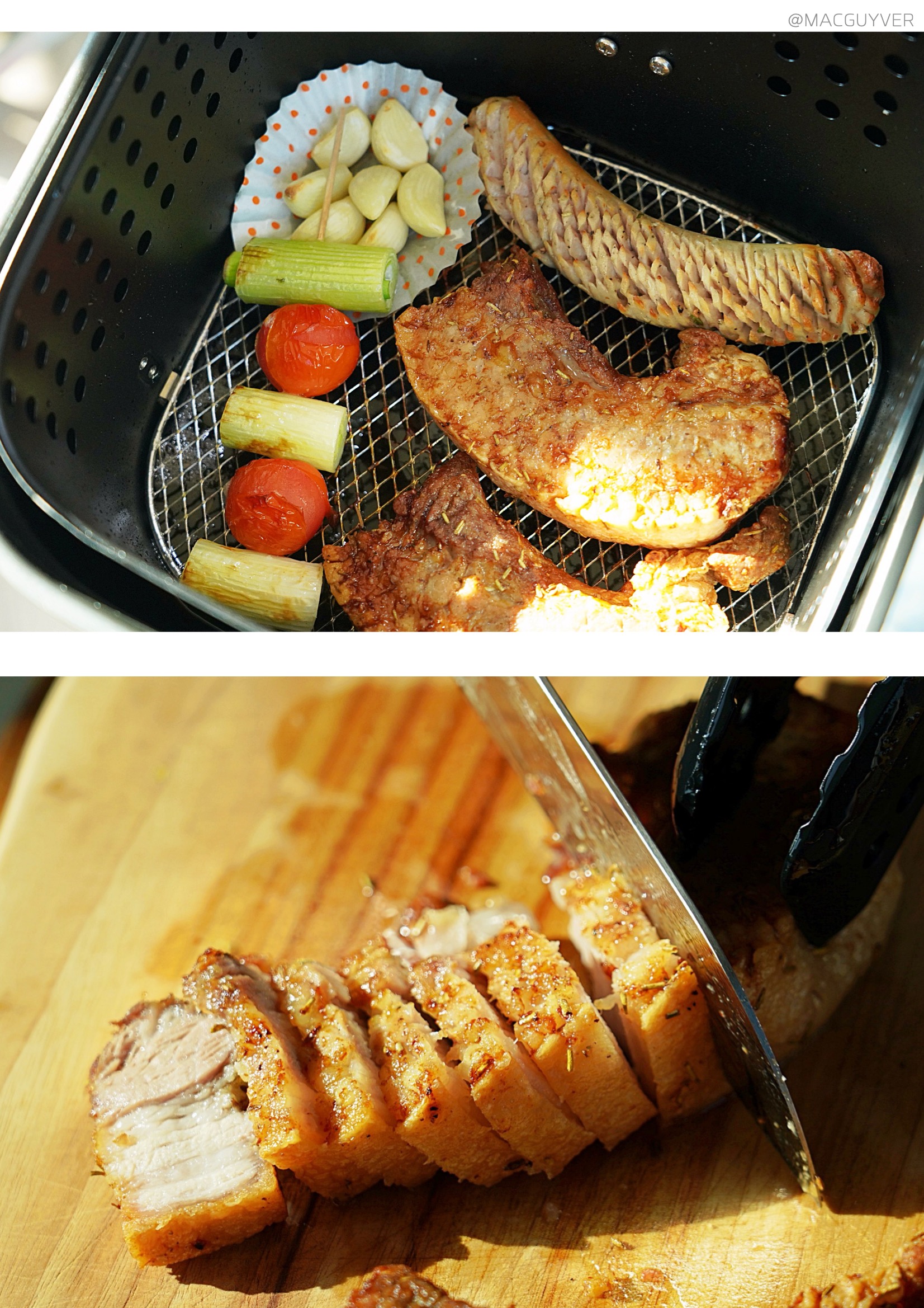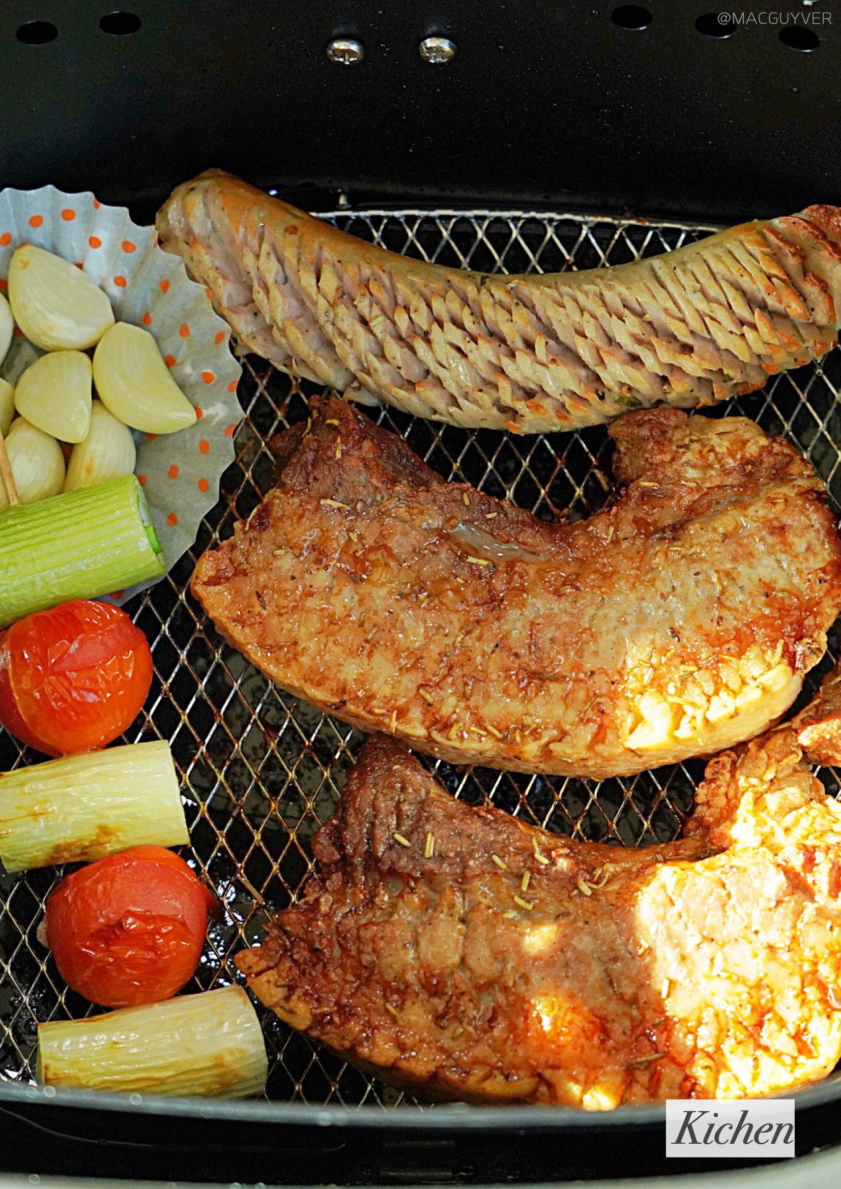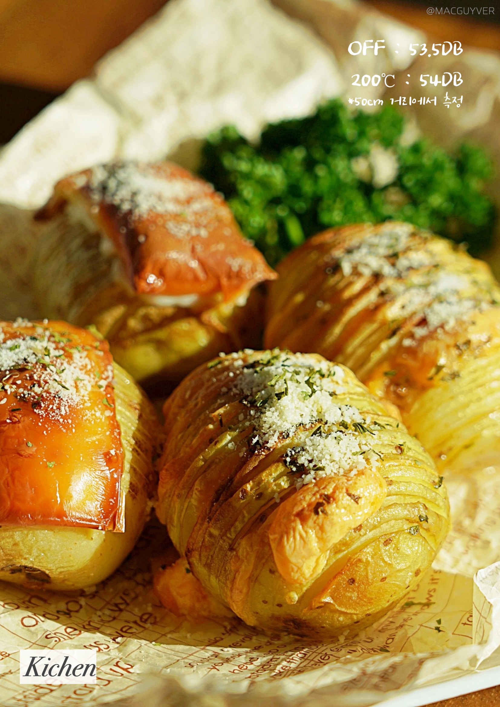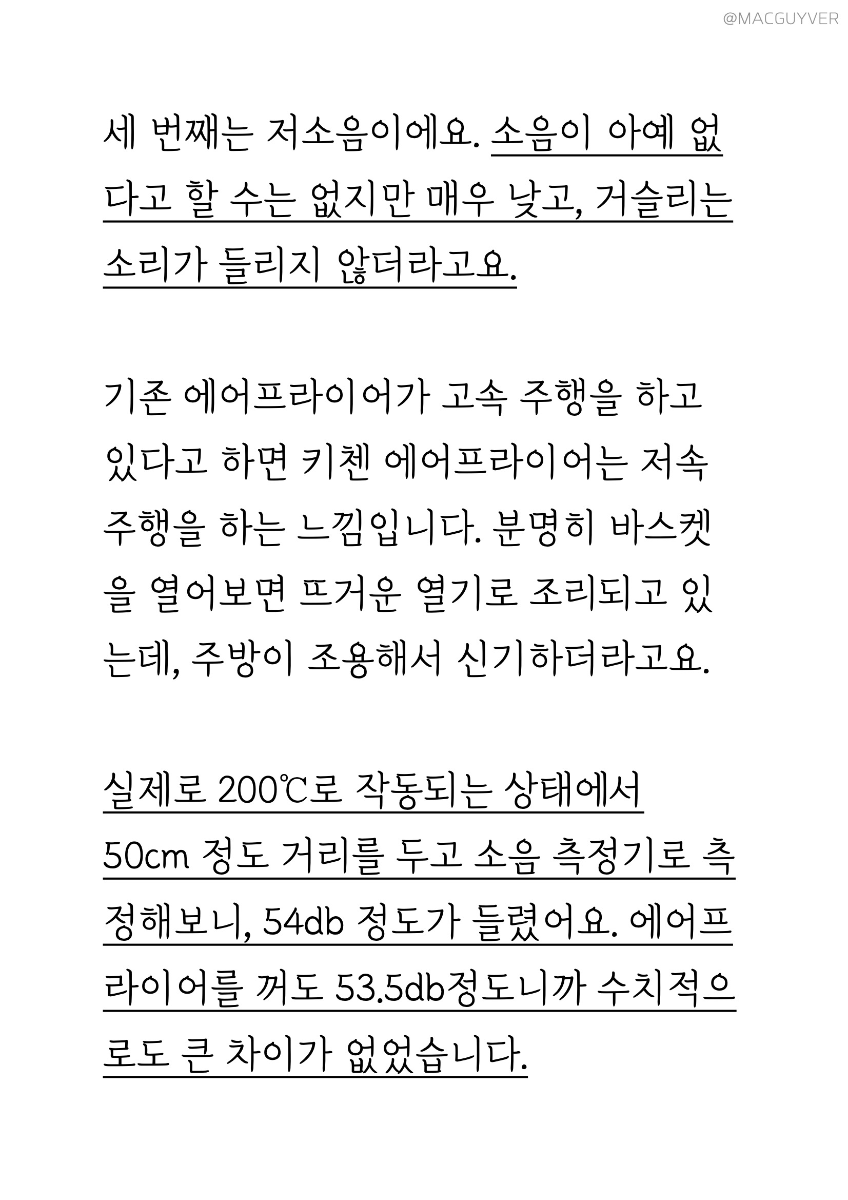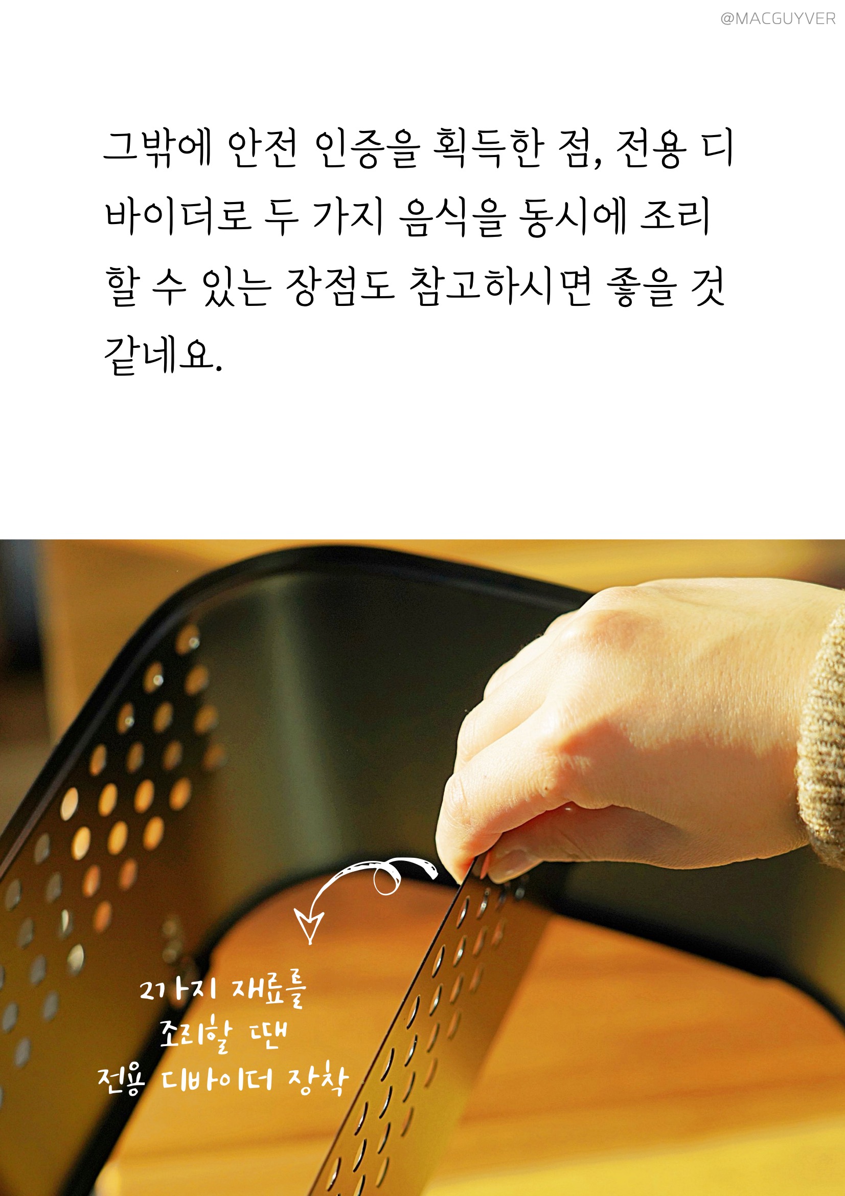 #에어프라이기추천 기능 키첸 에어프라이에는 크게 세 가지 포인트가 있는데요. 첫 번째는 대용량 에어프라이어라는 점입니다. 사실 요즘 출시되는 대부분의 에어프라이어가 대용량에어프라이어, 넉넉한 용량으로 만들어지지만 외부 용량과 내부 용량에 차이가 커서 아쉬운 경우가 있잖아요. 그런데 키첸 에어프라이어는 외부 용량이 6.5L이고, 내부는 무려 6L나 되는 정직한 대용량에어프라이어 제품이더라고요. 실제로 기존 에어프라이기에 딱 맞던 6호 사이즈의 닭을 키첸 에어프라이어에 넣으니까 여유 공간이 많이 남아 곁들일 야채나 다른 재료를 넣기에 좋더라고요. 거기다 실용적인 사각 바스켓은 내용물이 겹치지 않게 넣기에도 안성맞춤이어서 많은 양을 한 번에 조리하기에 더 좋더라고요. 두 번째는 초고속 히팅 기술입니다. 주로 에어프라이에 많이 조리하게 되는 육류는 온도가 충분히 도달하지 않은 상태에서 가열 시간이 길어지면 육즙이 서서히 빠져 식감이 퍼석하고 질겨지기 쉬운데요. 키첸 에어프라이어는 열의 순환 속도가 빨라서 빠른 시간에 조리되고, 골고루 익혀주더라고요. 그래서인지 기존에 사용하던 에어프라이를 기준으로 조리했다가 오버 쿠킹 되었던 적도 있는데요. 중간중간 조리 상태를 확인해 보시는 걸 추천드려요. 또 열을 발생시키는 히터가 5개나 된다는 점도 바삭바삭하고 촉촉한 식감을 즐기는데 한몫을 하는 것 같네요. 세 번째는 소음이에요. 소음이 아예 없다고 할 수는 없지만 매우 낮고, 거슬리는 소리가 들리지 않더라고요. 기존 에어프라이어가 고속 주행을 하고 있다고 하면 키첸 에어프라이어는 저속 주행을 하는 느낌입니다. 분명히 바스켓을 열어보면 뜨거운 열기로 조리되고 있는데, 주방이 조용해서 신기하더라고요. 실제로 200°C로 작동되는 상태에서 50cm 정도 거리를 두고 소음 측정기로 측정해보니, 54db 정도가 들렸어요. 에어후라이기를 꺼도 53.5db정도니까 수치적으로도 큰 차이가 없었습니다. 그밖에 안전 인증을 획득한 점, 전용 디바이더로 두 가지 음식을 동시에 조리할 수 있는 장점도 참고하시면 좋을 것 같네요.
