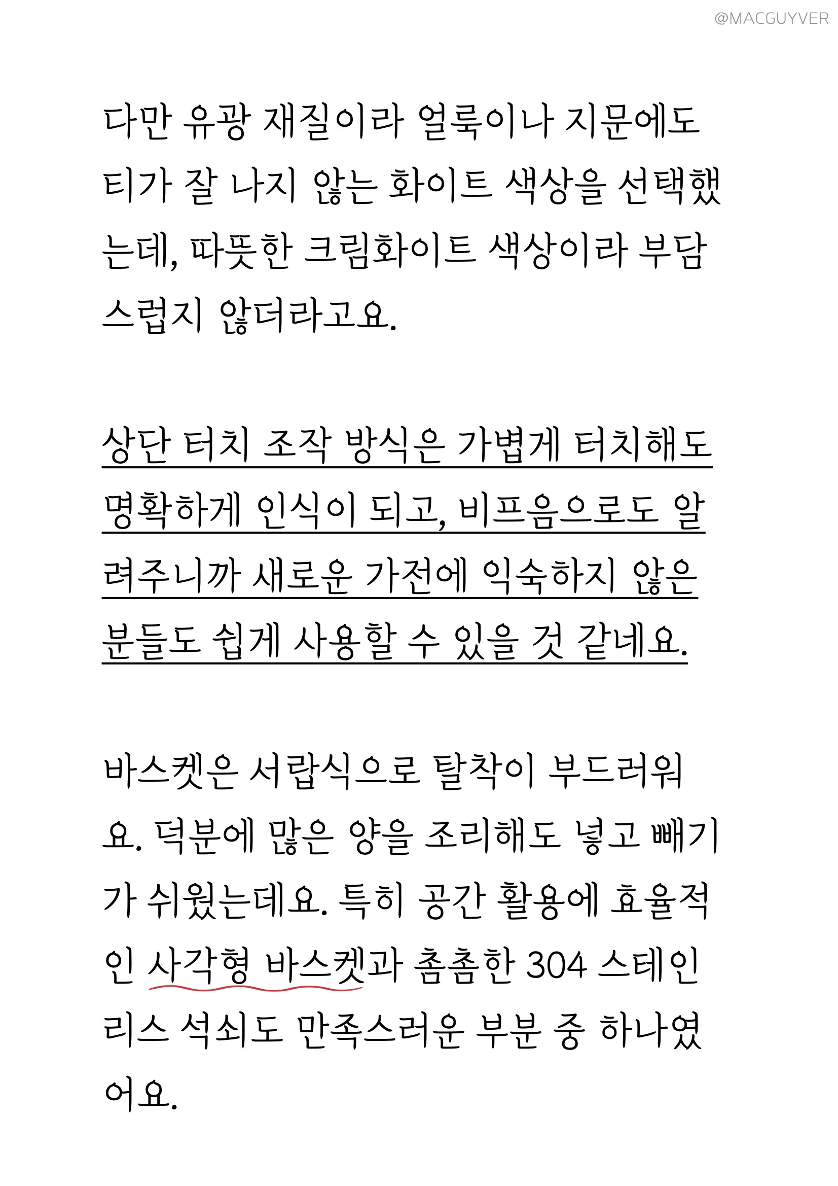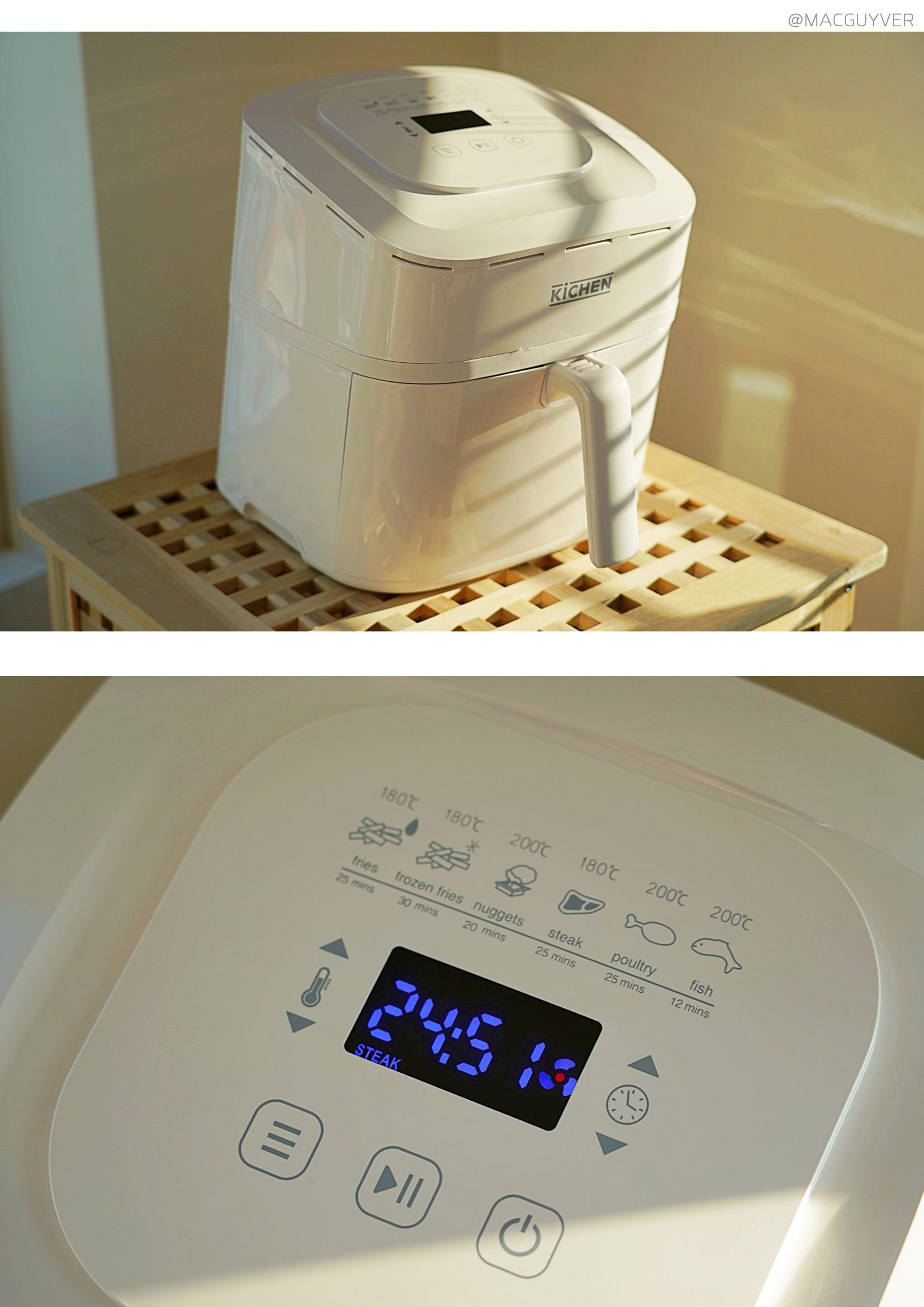 # 에어프라이기추천 디자인 첫인상으로 앞으로 비스듬히 기울어진 디자인이 눈에 들어왔는데요. 처음엔 개성 있는 디자인이라고만 생각했는데, 사용하다 보니 높은 테이블이나 조리대에 올려두고 사용할 경우 상단의 스크린이 한눈에 들어와서 조작이 간편하더라고요. 키첸 에어프라이기 화이트와 블랙 두 가지 컬러 모두 군더더기 없이 부드럽게 이어지는 디자인이에요. 개성이 강한 디자인은 제품 자체는 만족스럽지만 주방 분위기에 어울리지 않아 산만해지는 경향이 있는데, 키첸 에어프라이어는 어디에도 잘 어울릴만한 이미지였어요. 다만 유광 재질이라 얼룩이나 지문에도 티가 잘 나지 않는 화이트 색상을 선택했는데, 따뜻한 크림화이트 색상이라 부담스럽지 않더라고요. 상단 터치 조작 방식은 가볍게 터치해도 명확하게 인식이 되고, 비프음으로도 알려주니까 새로운 가전에 익숙하지 않은 분들도 쉽게 사용할 수 있을 것 같네요. 바스켓은 서랍식으로 탈착이 부드러워요. 덕분에 에어후라이기에 많은 양을 조리해도 넣고 빼기가 쉬웠는데요. 스텐에어프라이어추천 특히 공간 활용에 효율적인 사각형 바스켓과 촘촘한 304 스테인리스 석쇠, 스텐에어프라이어라는 점도 만족스러운 부분 중 하나였어요. 하지만 에어프라이기 외부 바스켓과 내부 바스켓이 때때로 헐겁게 결합되는 느낌도 들어서 잘 장착되었는지 확인하게 된다는 점은 아쉽기도 합니다. 물론 사용 중에 바스켓이 분리되는 문제는 생기지 않았지만 좀 더 안정감 있게 만들어졌다면 좋을 것 같네요.