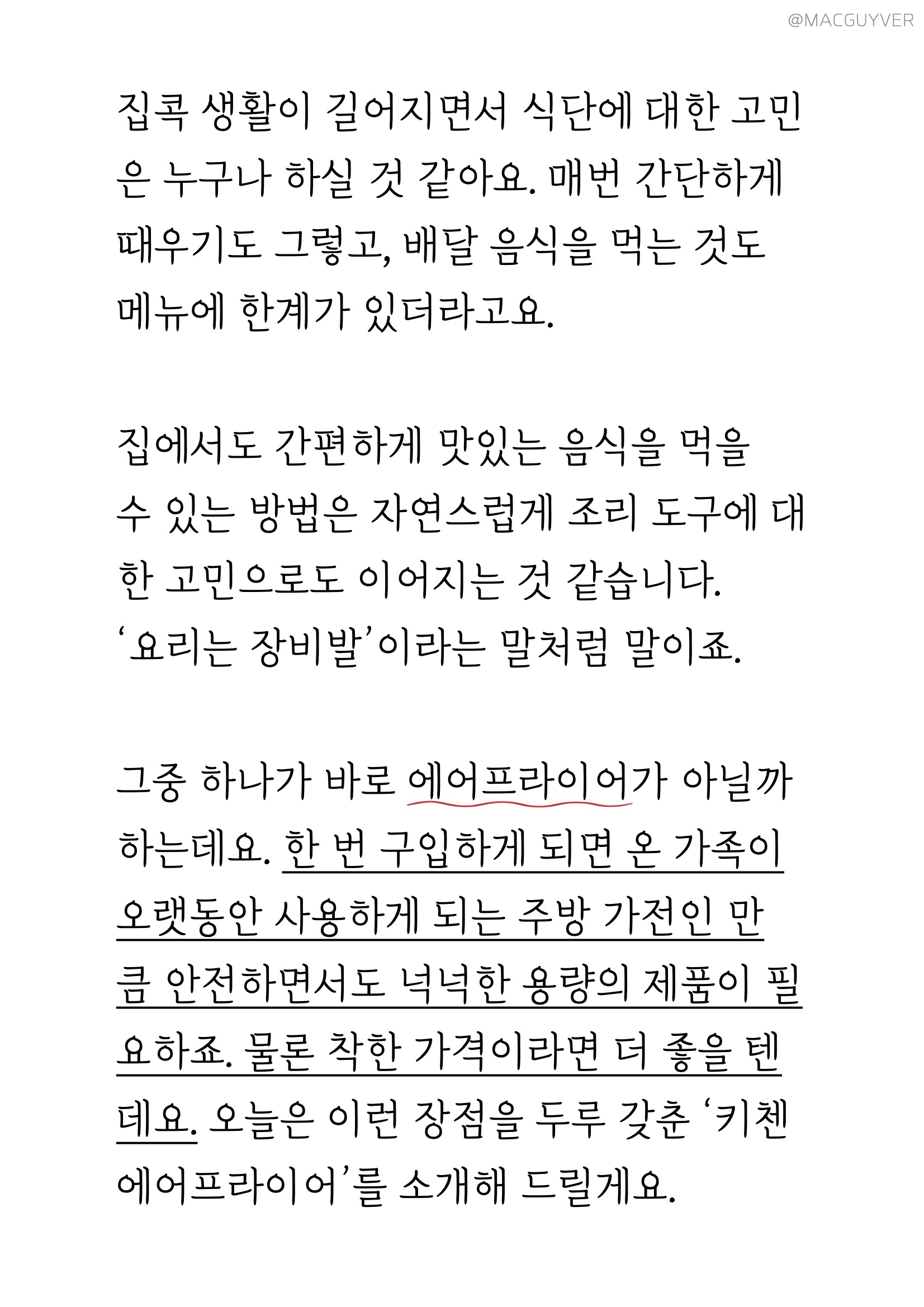 키첸 에어프라이어 집콕 생활이 길어지면서 식단에 대한 고민은 누구나 하실 것 같아요. 매번 간단하게 때우기도 그렇고, 배달 음식을 먹는 것도 메뉴에 한계가 있더라고요. 집에서도 간편하게 맛있는 음식을 먹을 수 있는 방법은 자연스럽게 조리 도구에 대한 고민으로도 이어지는 것 같습니다. ‘요리는 장비발’이라는 말처럼 말이죠. 그중 하나가 바로 에어프라이어가 아닐까 하는데요. 한 번 구입하게 되면 온 가족이 오랫동안 사용하게 되는 주방 가전인 만큼 안전하면서도 넉넉한 용량의 제품이 필요하죠. 물론 착한 가격이라면 더 좋을 텐데요. 오늘은 이런 장점을 두루 갖춘 키첸 에어프라이어를 소개해 드릴게요.