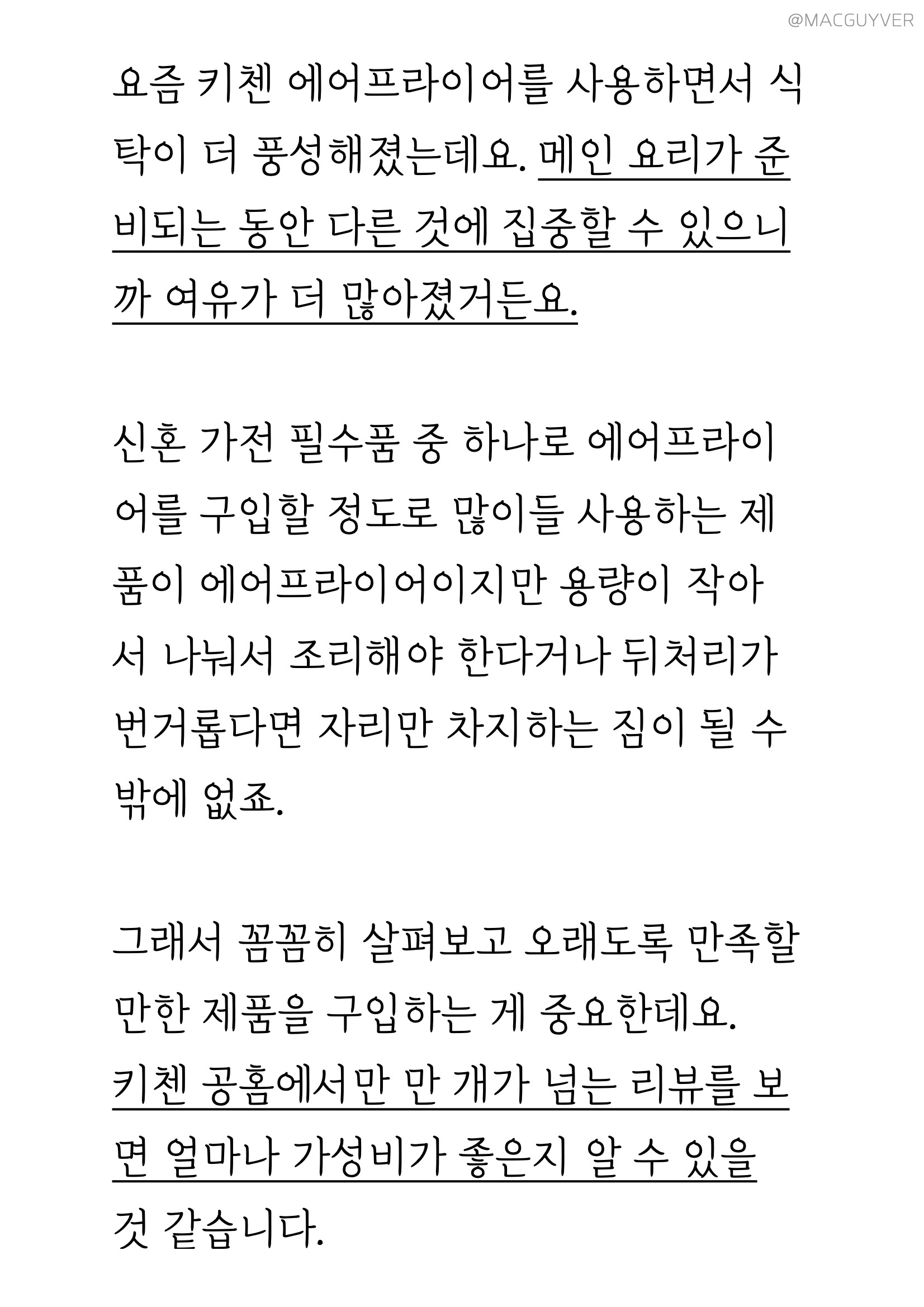 요즘 키첸 에어프라이어를 사용하면서 에어프라이어요리로 식탁이 더 풍성해졌는데요. 메인 요리가 준비되는 동안 다른 것에 집중할 수 있으니까 여유가 더 많아졌거든요. 신혼 가전 필수품 중 하나로 에어프라이기를 구입할 정도로 많이들 사용하는 제품이 에어프라이어이지만 용량이 작아서 나눠서 조리해야 한다거나 뒤처리가 번거롭다면 자리만 차지하는 짐이 될 수밖에 없죠. 그래서 꼼꼼히 살펴보고 오래도록 만족할만한 제품을 구입하는 게 중요한데요. 스텐에어프라이어추천 키첸 공홈에서만 만 개가 넘는 에어후라이기 리뷰를 보면 얼마나 가성비가 좋은지 알 수 있을 것 같습니다. 키첸 에어후라이기는 요리가 또 하나의 숙제처럼 여겨져서 대충 끼니를 때우는 나를 위한 선물로, 또는 오늘도 건강한 한 끼를 위해 고생하는 누군가를 위한 좋은 선물이 되지 않을까 합니다. 이 제품에 대한 보다 상세한 스펙과 정보는 아래 배너를 통해 보실 수 있으니까 참고해보세요.