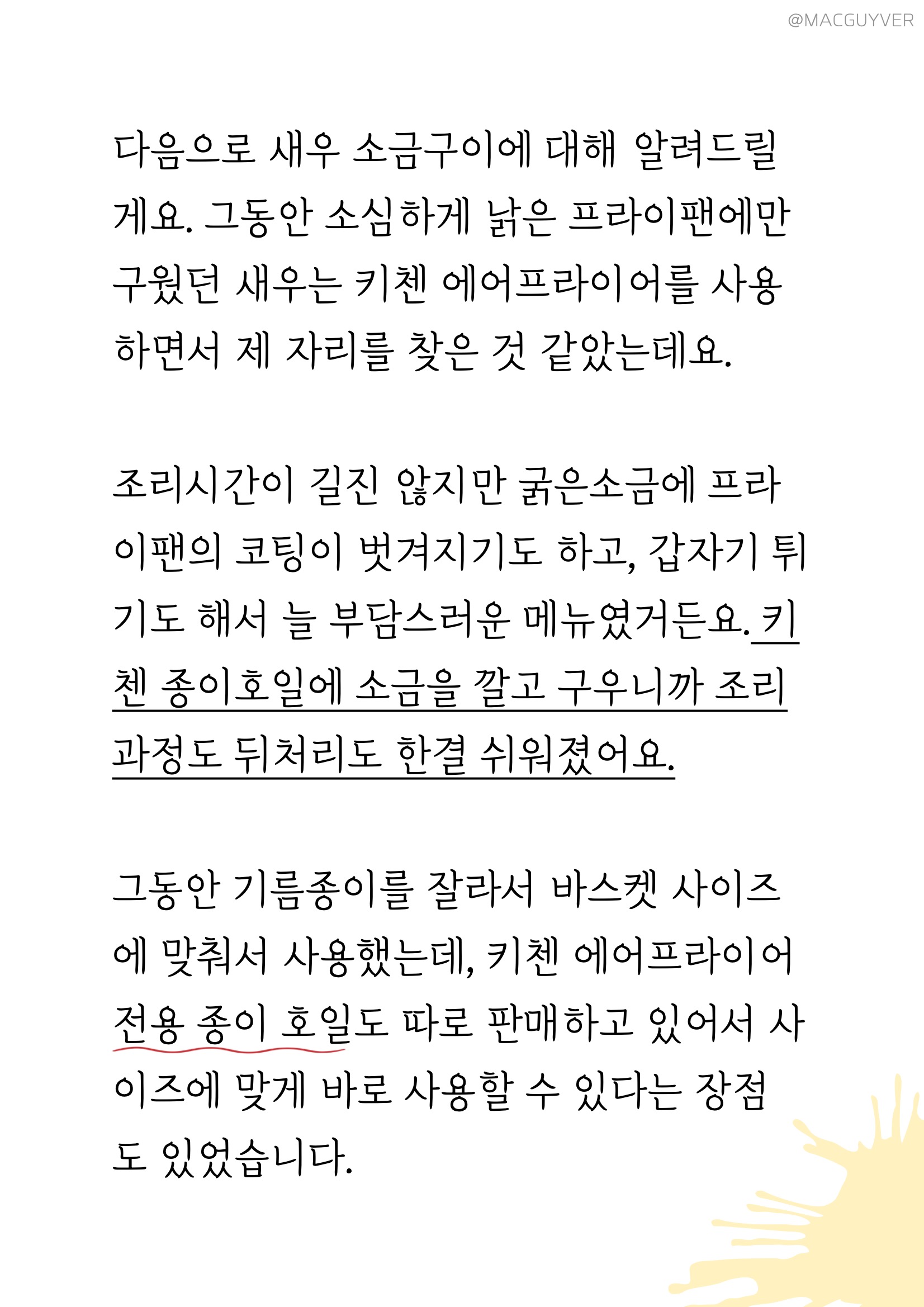#에어프라이어요리 실사용 소감 키첸 에어프라이어의 성능을 확인하기 위해 두툼한 통삼겹과 새우 소금구이를 시도해봤어요. 그동안 속까지 잘 익히기 위해 수육으로만 즐겼던 메뉴였는데, 에어프라이어로도 속까지 잘 익더라고요. 속은 촉촉하고, 겉은 바삭바삭해서 에어프라이어 조리만의 독특한 매력이 있었어요. 크기에 따라 조리시간은 40~50분 정도 되는 것 같아요. 에어프라이기 터치스크린의 6가지 간편 조리 모드 중 ‘poultry’모드를 2번 이용하셔도 좋을 것 같아요. 에어후라이기 히터가 상단에 있으니까 앞뒤로 한 번씩 뒤집어 주면 좋겠죠? 그리고 삼겹살처럼 기름이 많이 나오고, 크고 두꺼운 재료는 종이 호일 없이 사용하는 걸 추천드려요. 물론 종이호일을 깔면 세척은 간편하지만 기름이 쫙 빠지지 않게 되고, 무엇보다 공기 순환이 잘 되어야 위아래가 골고루 익을 수 있거든요. 다음으로 새우 소금구이에 대해 알려드릴게요. 그동안 소심하게 낡은 프라이팬에만 구웠던 새우는 키첸 에어프라이기를 사용하면서 딱 맞는 자리를 찾은 것 같았는데요. 조리시간이 길진 않지만 굵은소금에 프라이팬의 코팅이 벗겨지기도 하고, 갑자기 튀기도 해서 늘 부담스러운 메뉴였거든요. 이렇게 키첸 에어프라이 종이 호일에 소금을 깔고 구우니까 조리 과정도 뒤처리도 한결 쉬워졌어요. 그동안 기름종이를 잘라서 바스켓 사이즈에 맞춰서 사용했는데, 키첸 에어프라이어 전용 종이 호일도 따로 판매하고 있어서 사이즈에 맞게 바로 사용할 수 있다는 장점도 있었습니다. 그밖에 간편 조리제품이나 간식, 에어프라이어요리, 브런치도 키첸 에어프라이기 활용해봤는데 전자렌지나 오븐과는 비교할 수 없는 에어프라이어의 장점을 확실히 느낄 수 있더라고요. 전자렌지에서는 말라서 딱딱해지거나 혹은 눅눅해져 버리기 쉬운 재료들을 바삭 촉촉하게 살려주면서도 오븐보다는 효율적이어서 요리 초보에게도 친숙한 제품이었어요.