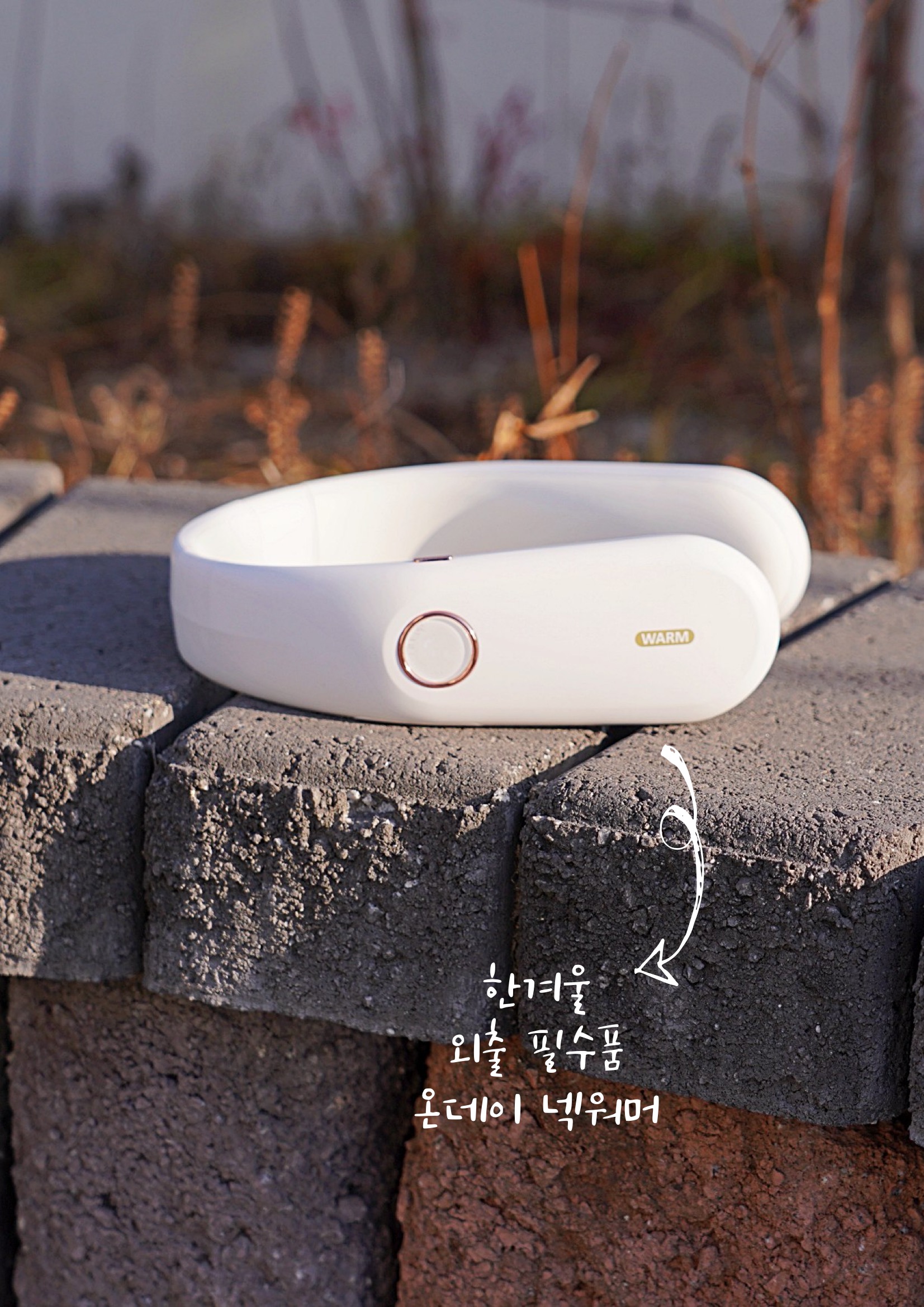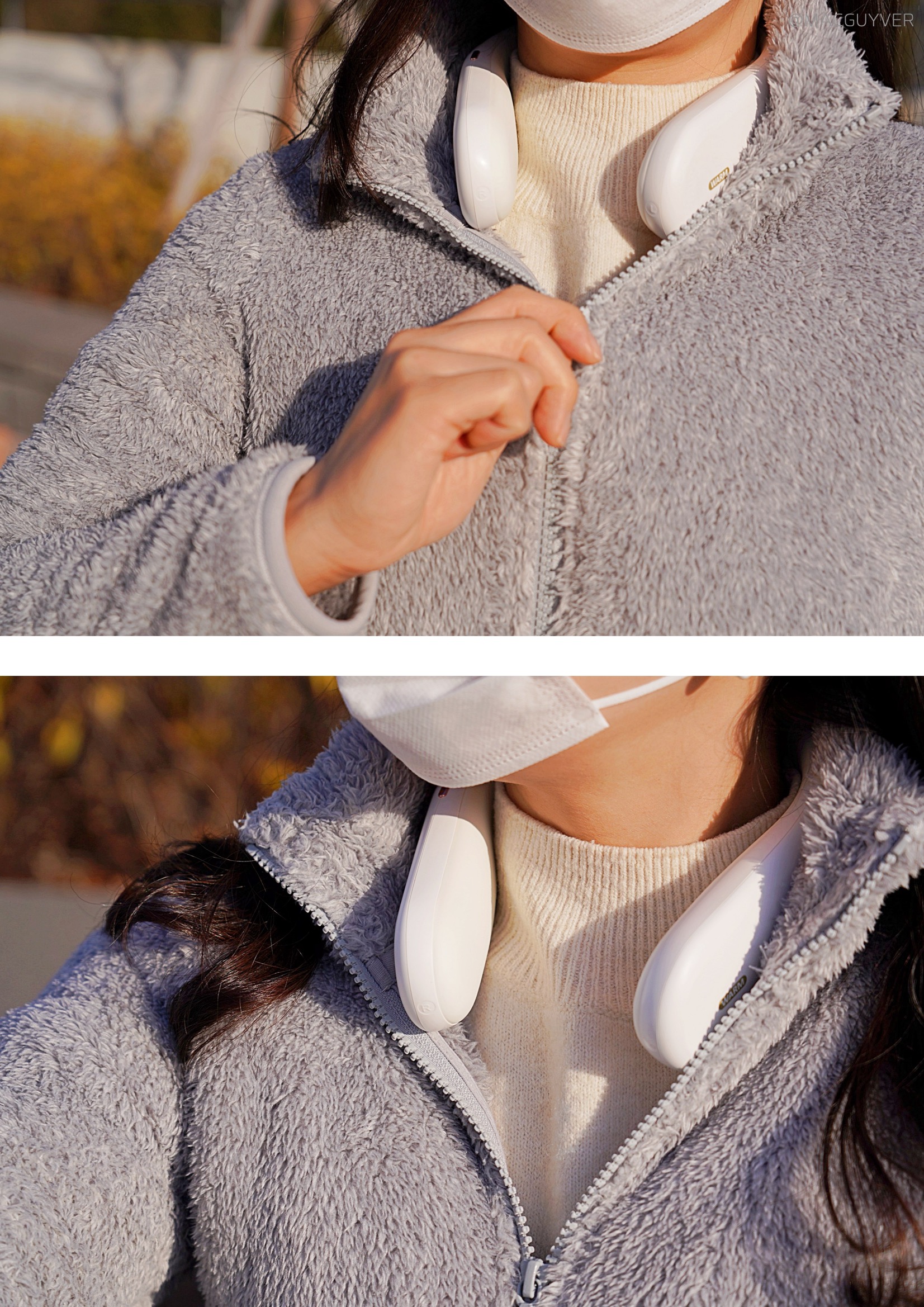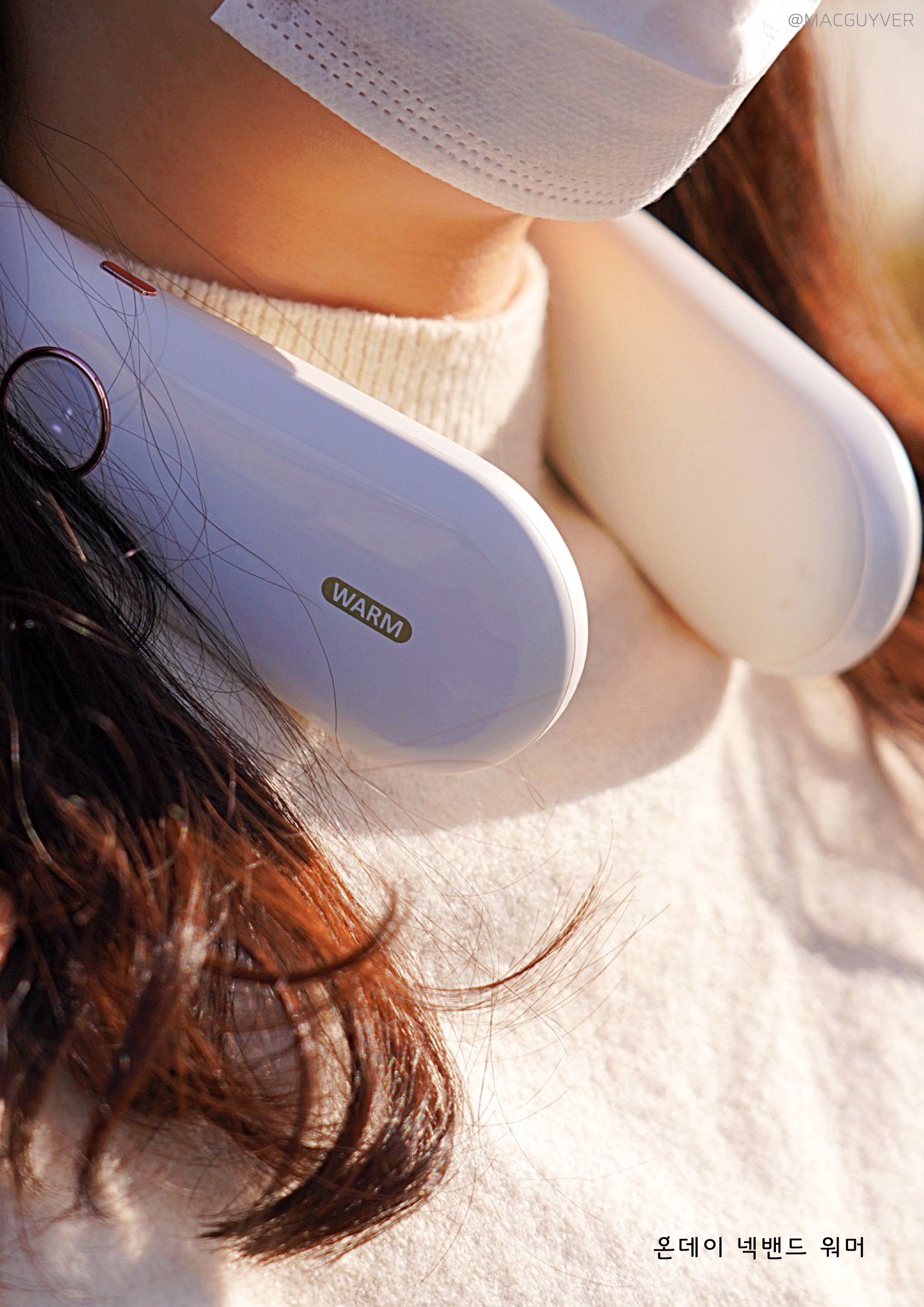 보통 목도리나 넥워머라고 하면 도톰한 니트 같은 재질을 떠올리실 것 같은데요. 온데이 넥워머는 기기의 내장된 배터리로 열을 발생시키는 원리라 U자형의 슬림한 디자인인 목난로예요. 처음엔 넥밴드 워머가 좀 어색하게 느껴지기도 했는데 슬림한 헤드폰을 목에 걸고 있는 느낌이 나더라고요. 그래서 생각보다 목을 움직이거나 숙이는 건 불편하지 않았는데요. 물론 넥워머가 없는 것처럼 옆이나 뒤로 젖히는 것은 힘들 것 같기는 합니다. 이 겨울용품은 남녀노소 누구나 착용하기에도 무난하고, 기기 자체가 화이트톤에 군더더기 없이 심플한 느낌이라 어떤 옷을 입어도 잘 어우러지는 느낌이었어요.