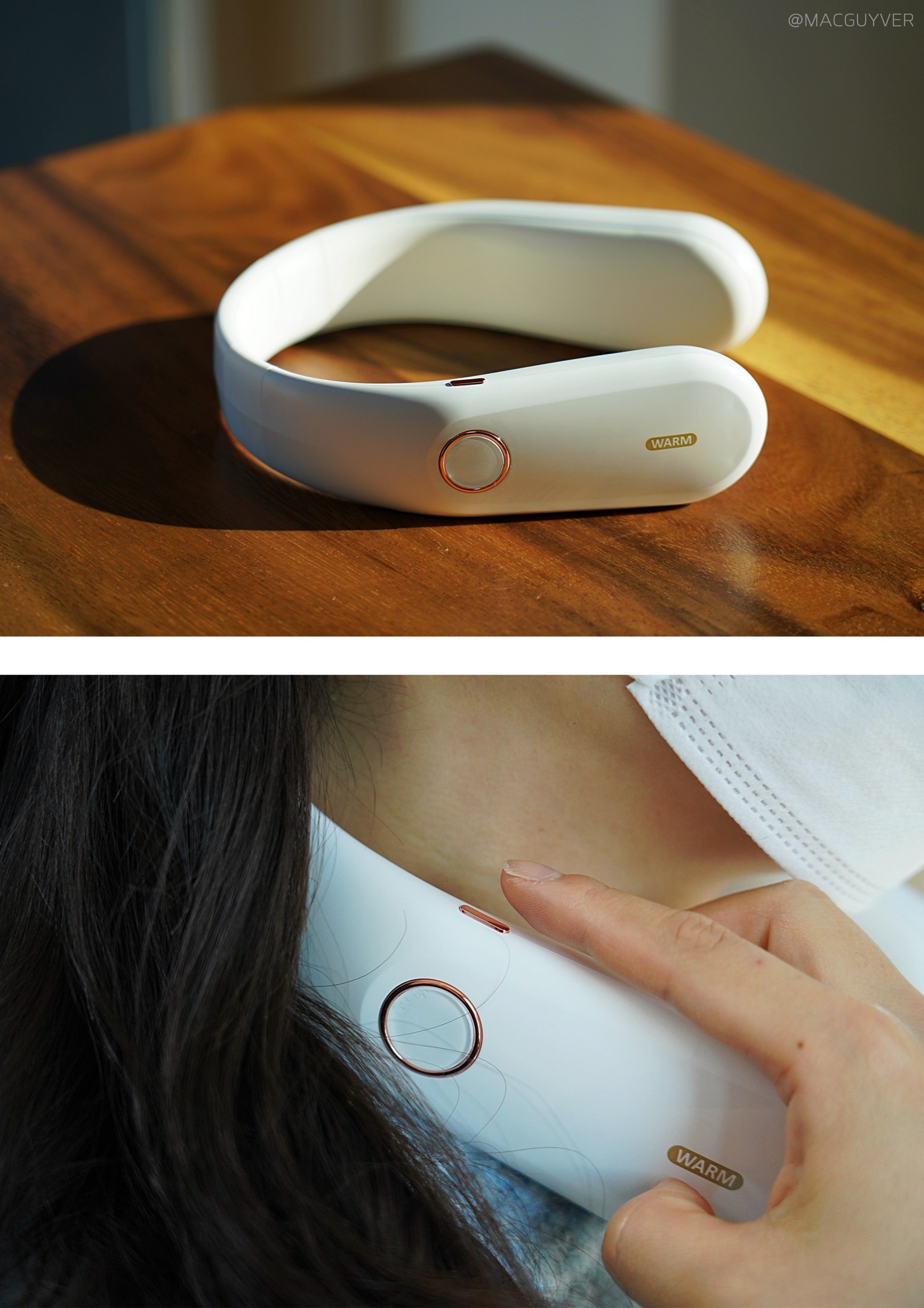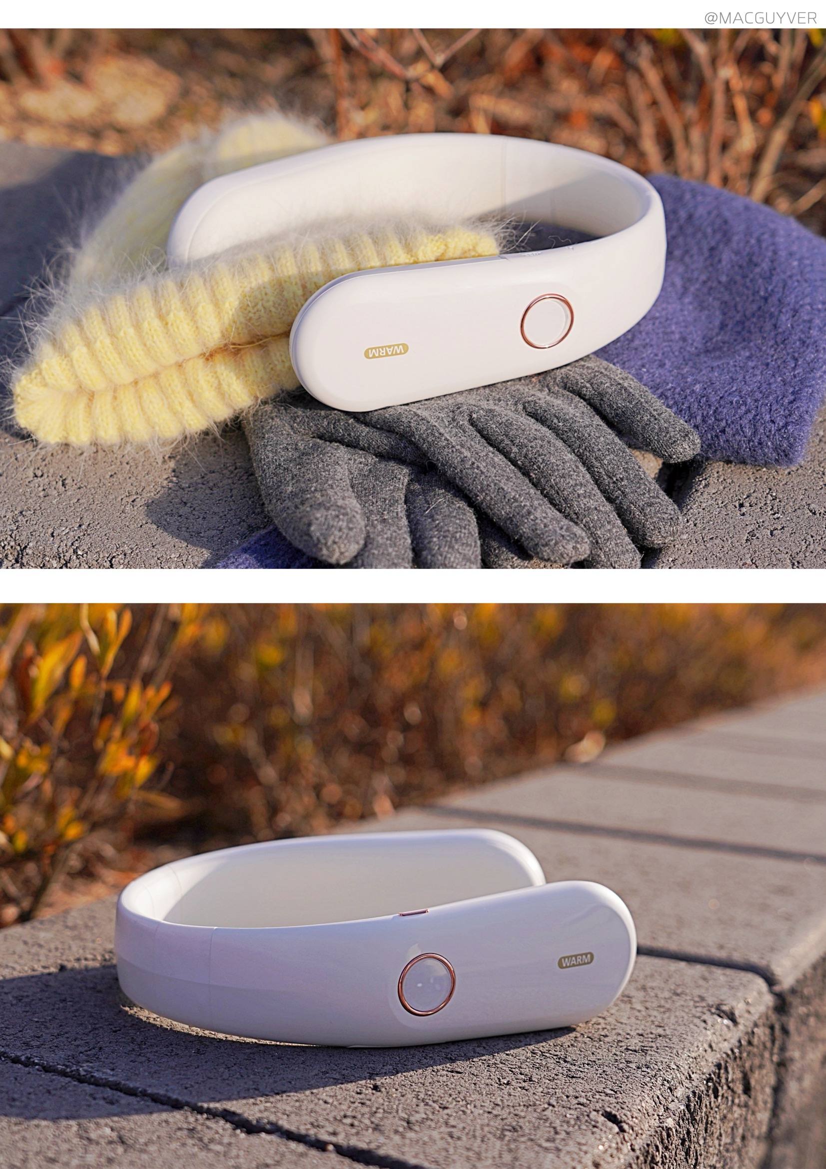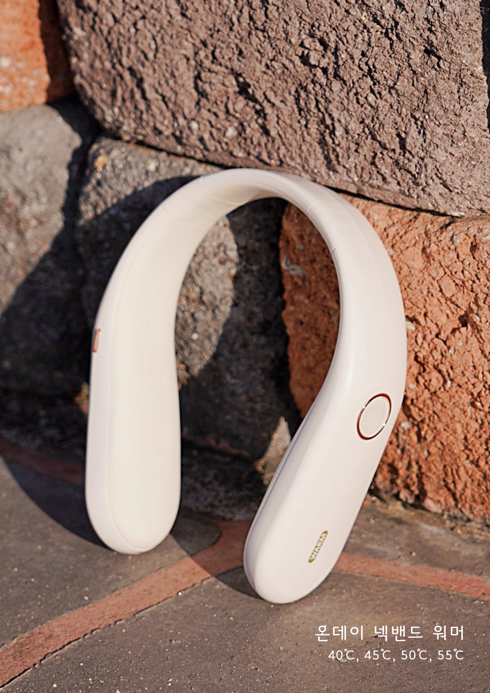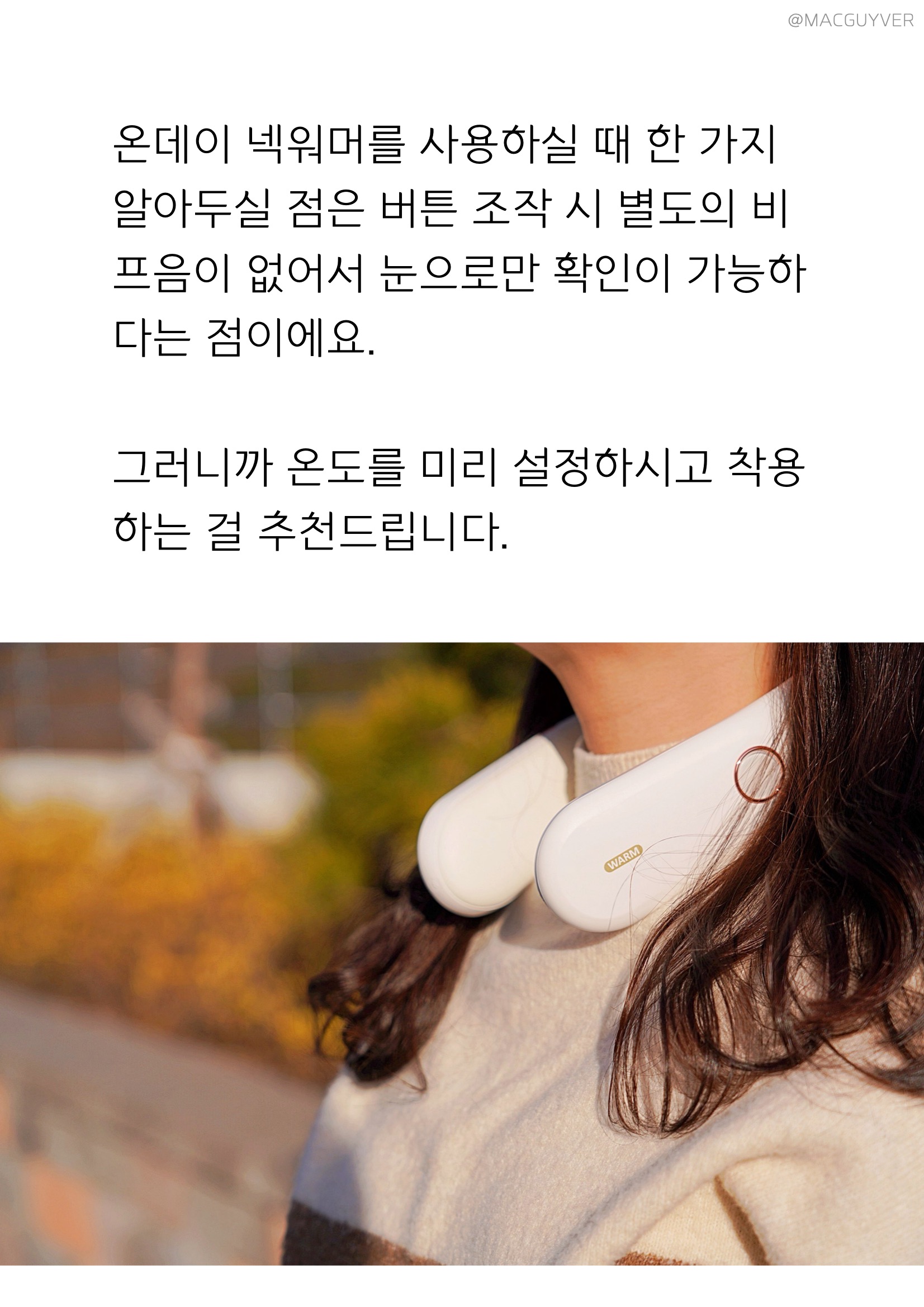 보통 목도리나 넥워머라고 하면 도톰한 니트 같은 재질을 떠올리실 것 같은데요. 온데이 넥워머는 기기의 내장된 배터리로 열을 발생시키는 원리라 U자형의 슬림한 디자인인 목난로예요. 처음엔 넥밴드 워머가 좀 어색하게 느껴지기도 했는데 슬림한 헤드폰을 목에 걸고 있는 느낌이 나더라고요. 그래서 생각보다 목을 움직이거나 숙이는 건 불편하지 않았는데요. 물론 넥워머가 없는 것처럼 옆이나 뒤로 젖히는 것은 힘들 것 같기는 합니다. 이 겨울용품은 남녀노소 누구나 착용하기에도 무난하고, 기기 자체가 화이트톤에 군더더기 없이 심플한 느낌이라 어떤 옷을 입어도 잘 어우러지는 느낌이었어요.