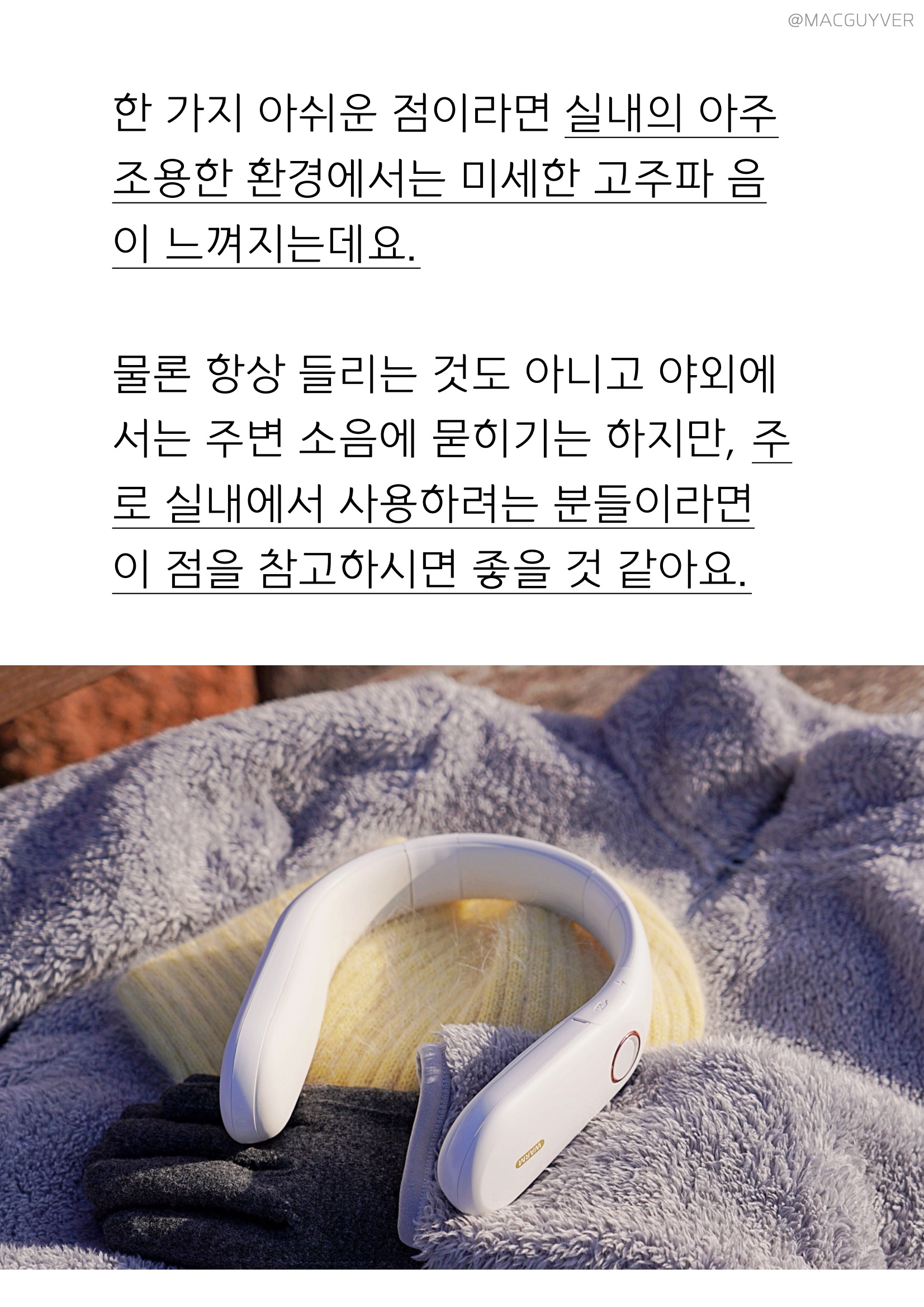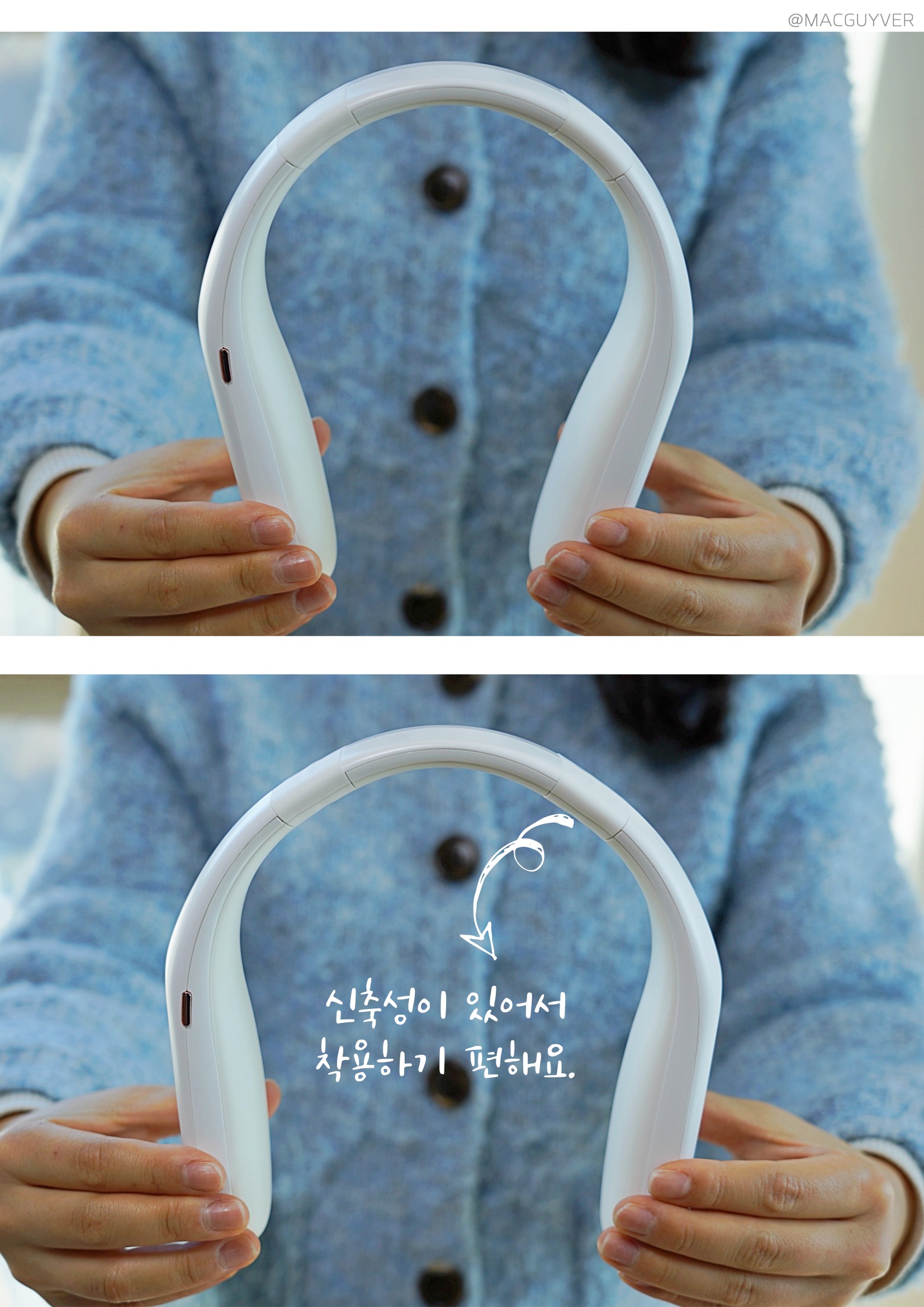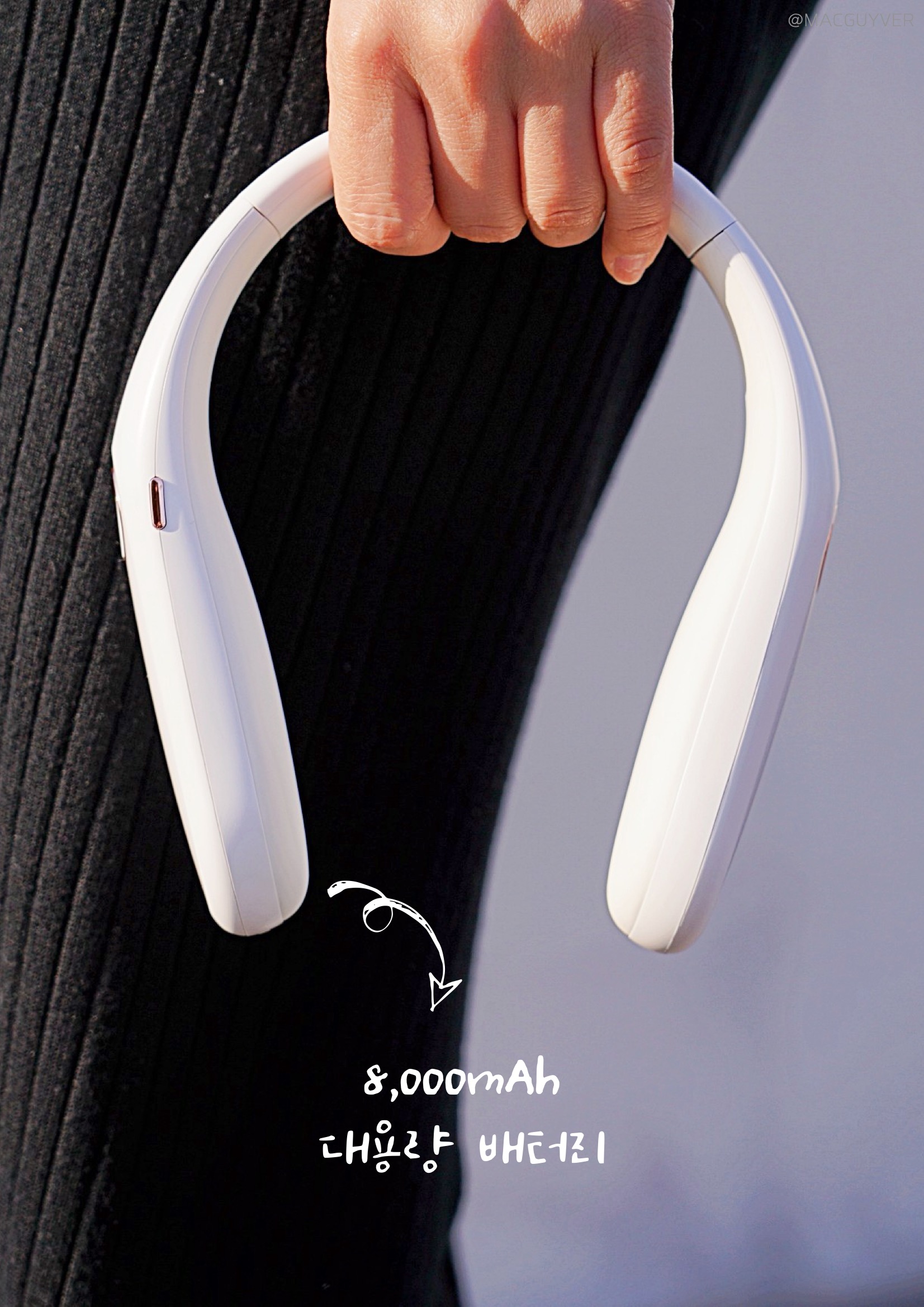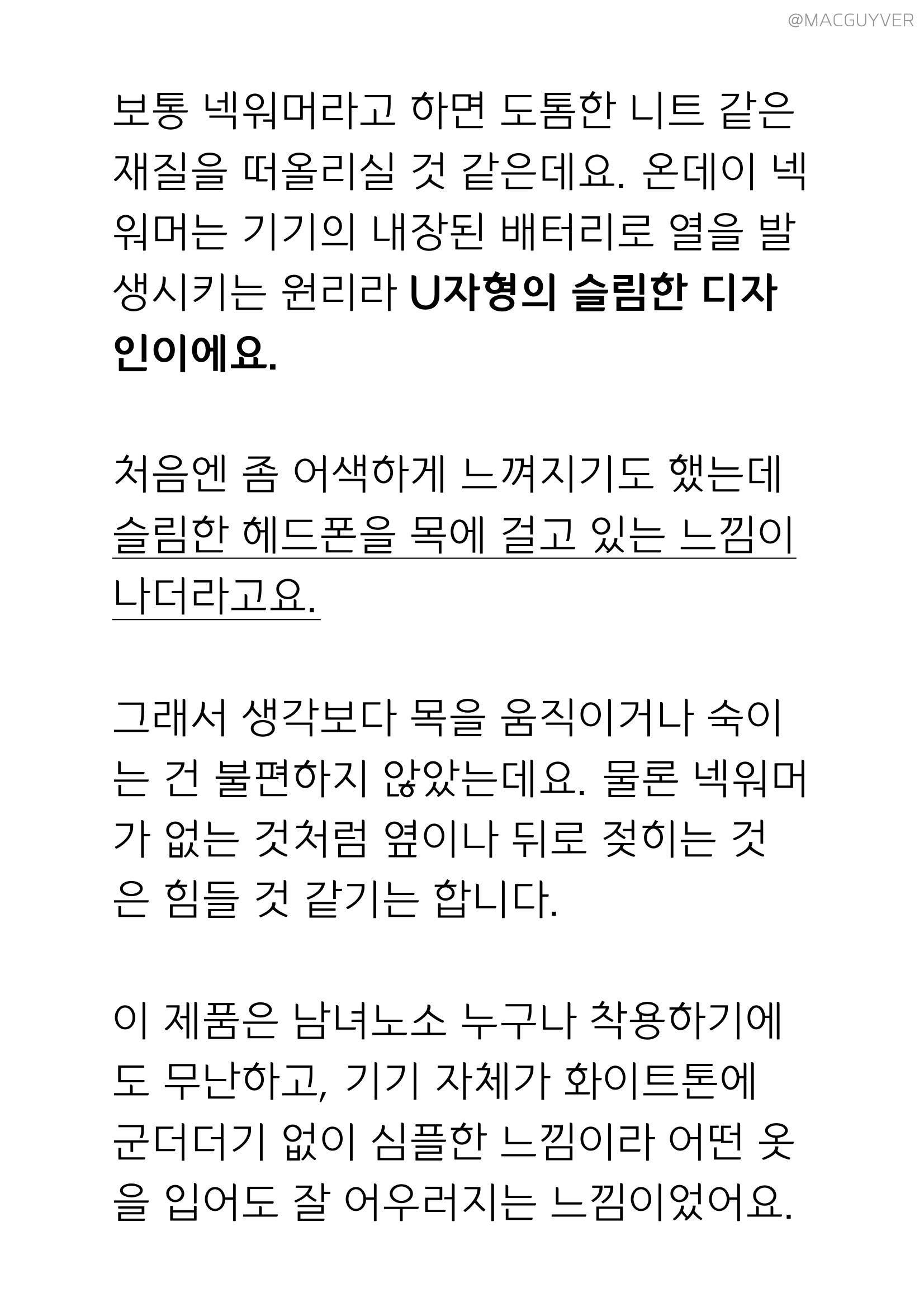 특히 피부에 직접 닿아도 걸리는 곳 없이 부드러운 곡선형으로 마감된 점이 마음에 들었는데요. 장시간 착용하는 제품이라 딱딱하거나 거친 마감이 있으면 불편할 수 있잖아요? 다행히 온데이 넥워머는 부드러운 재질감으로 마감된데다, 목에 착 감겨서 다른 헤드폰이나 기계와는 전혀 다른 편안함을 주더라고요. 하지만 넥워머가 화이트톤이라 컬러감이 있는 선크림이나 로션을 바르신다면 사용 후 닦아서 관리해 줄 필요가 있을 것 같습니다.