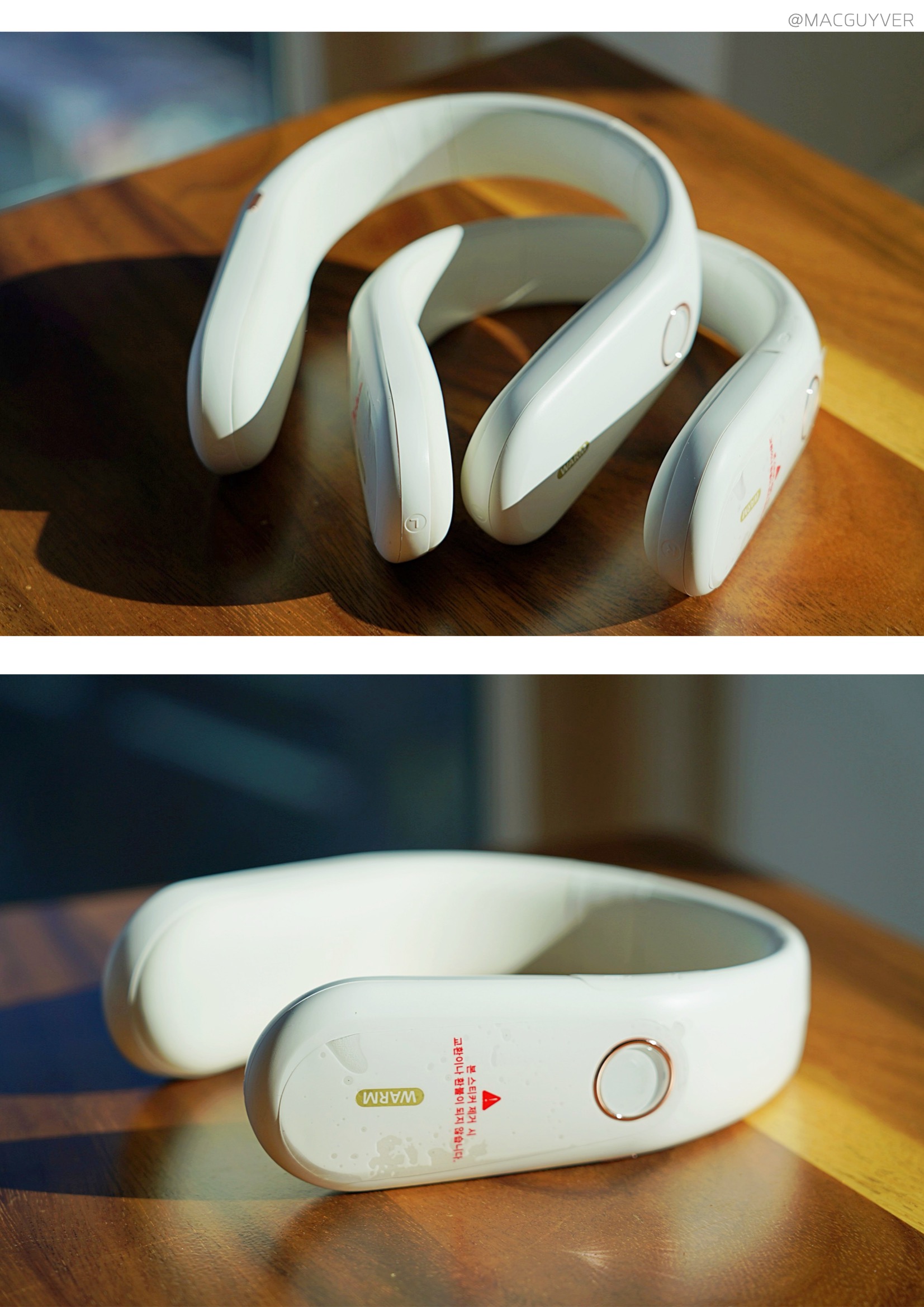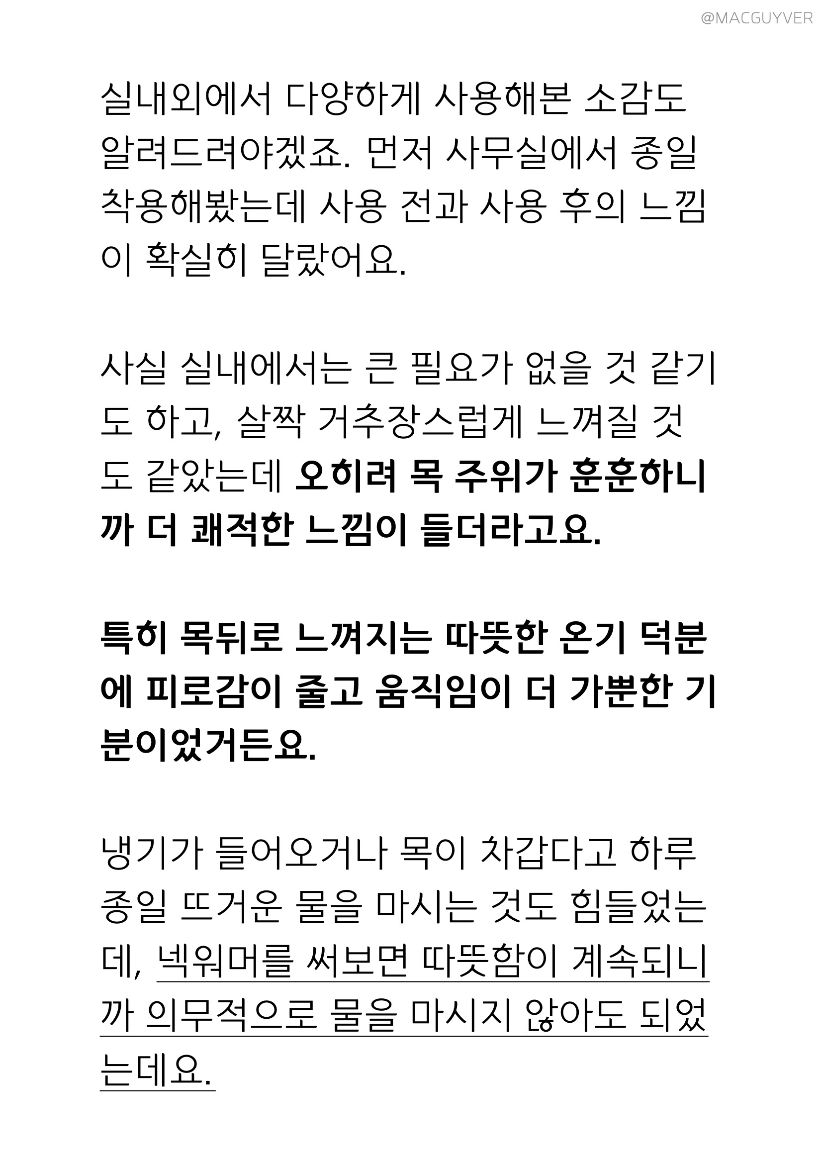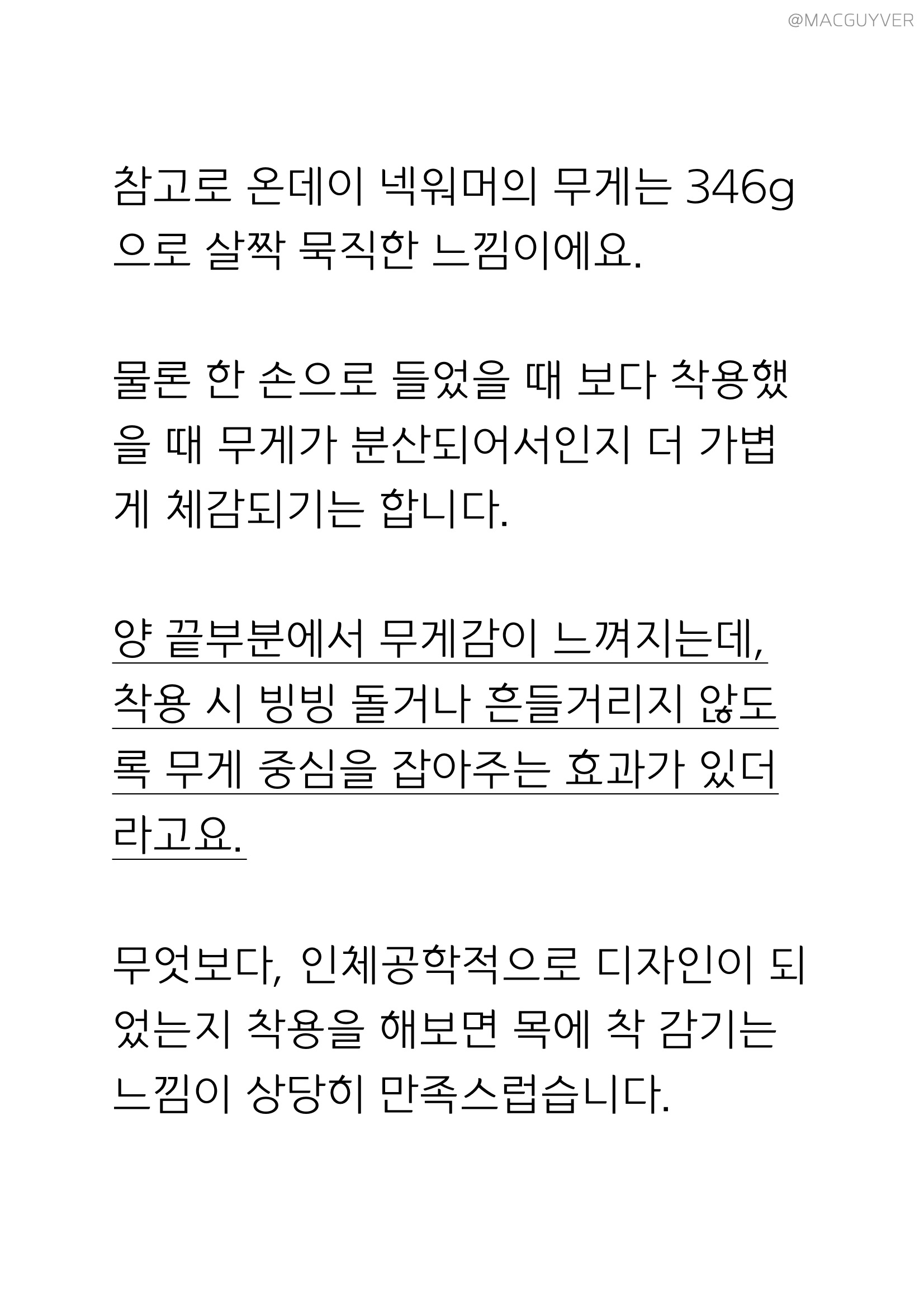 참고로 온데이 넥워머의 무게는 346g으로 살짝 묵직한 느낌이에요. 물론 한 손으로 들었을 때 보다 착용했을 때 무게가 분산되어서인지 더 가볍게 체감되기는 합니다. 넥밴드 워머 양 끝부분에서 무게감이 느껴지는데, 착용 시 빙빙 돌거나 흔들거리지 않도록 무게 중심을 잡아주는 효과가 있더라고요. 무엇보다, 인체공학적으로 디자인이 되었는지 착용을 해보면 목에 착 감기는 느낌이 상당히 만족스럽습니다.