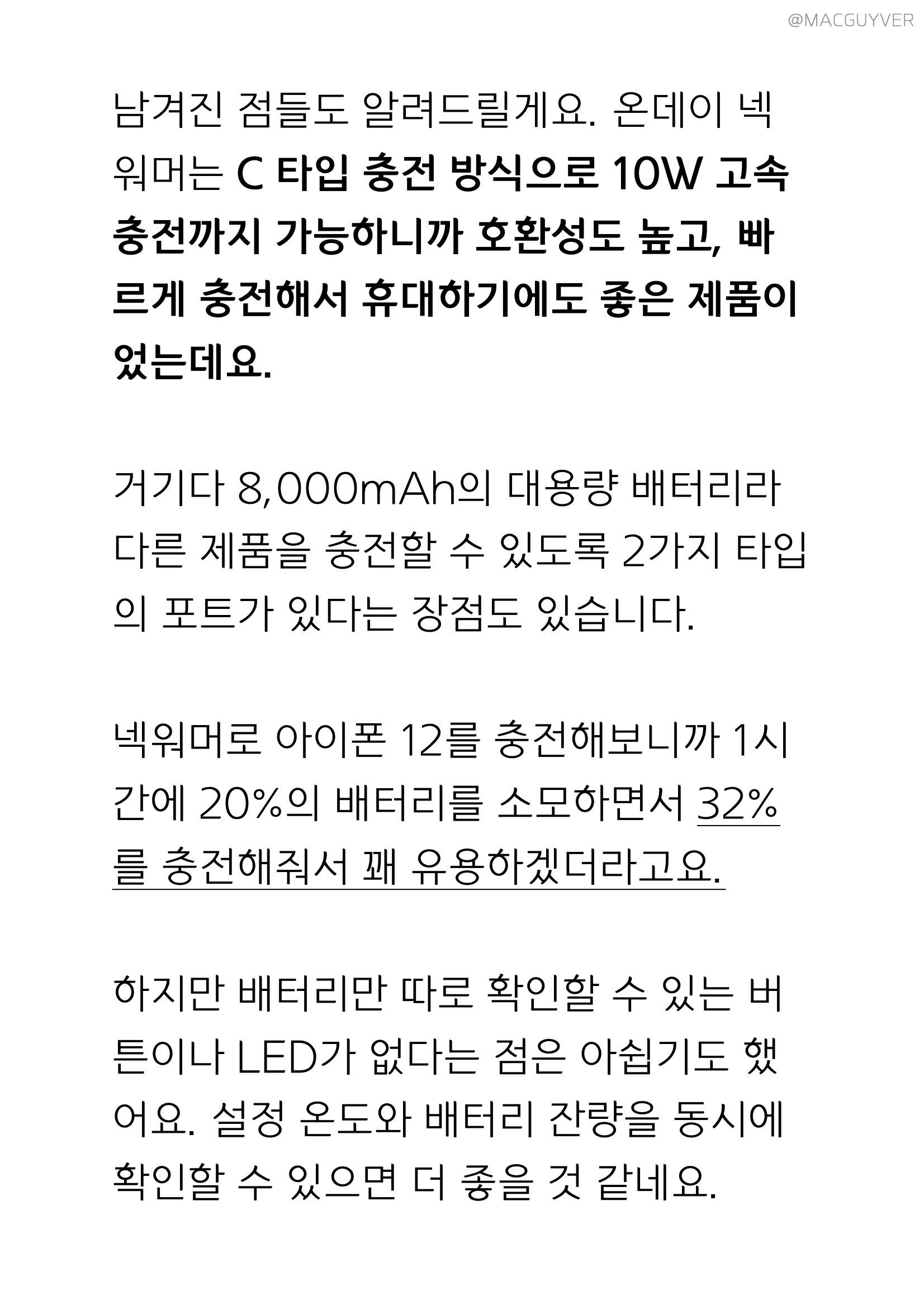 온데이 넥밴드 워머에 대해 남겨진 점들도 알려드릴게요. 온데이 넥워머는 C 타입 충전 방식으로 10W 고속 충전까지 가능하니까 호환성도 높고, 빠르게 충전해서 휴대하기에도 좋은 제품이었는데요. 거기다 방한용품이면서 8,000mAh의 대용량 배터리라 다른 제품을 충전할 수 있도록 2가지 타입의 포트가 있다는 장점도 있습니다. 넥밴드 워머로 아이폰 12를 충전해보니까 1시간에 20%의 배터리를 소모하면서 32%를 충전해줘서 꽤 유용하지 않을까 합니다. 하지만 배터리 %만 따로 확인할 수 있는 버튼이나 LED가 없다는 점은 아쉽기도 했어요. 설정 온도와 배터리 잔량을 동시에 확인할 수 있으면 더 편리할 것 같더라고요.