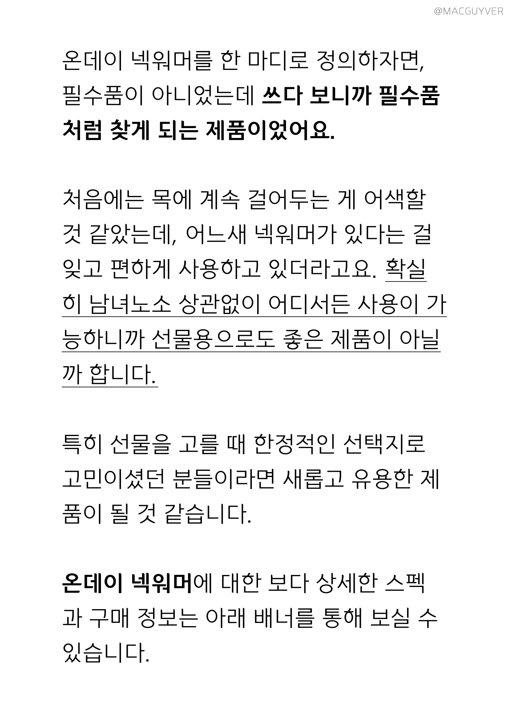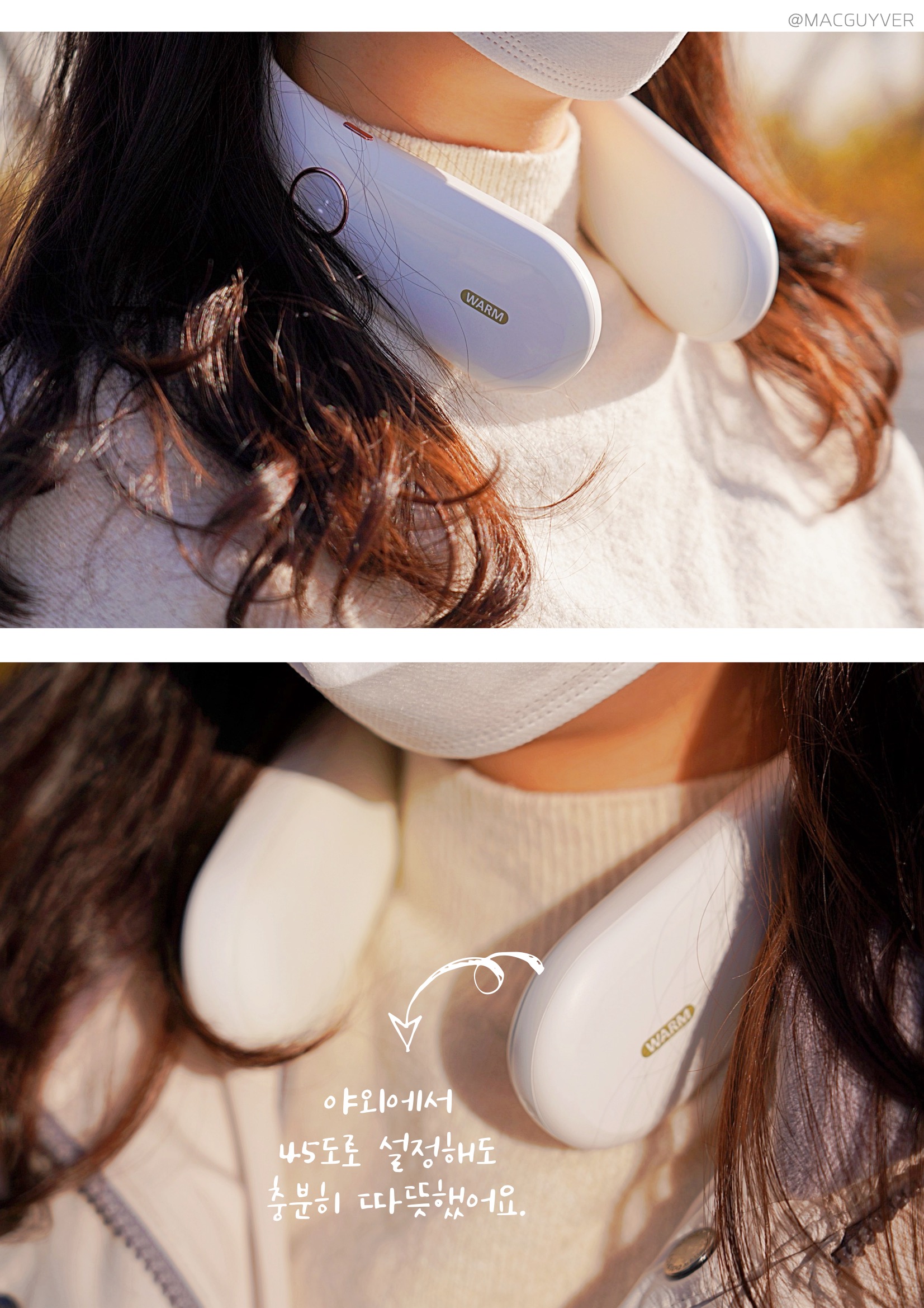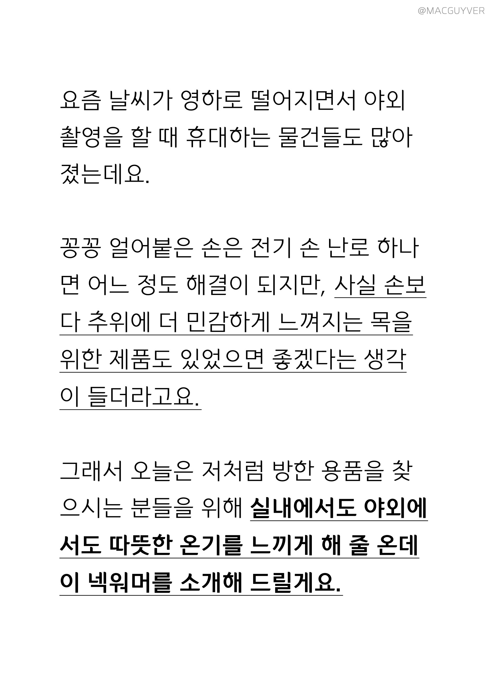 요즘 날씨가 영하로 떨어지면서 야외 촬영을 할 때 휴대하는 물건들도 많아졌는데요. 꽁꽁 얼어붙은 손은 전기 손 난로 하나면 어느 정도 해결이 되지만, 사실 손보다 추위에 더 민감하게 느껴지는 목을 위한 방한용품 같은 제품도 있었으면 좋겠다는 생각이 들더라고요. 그래서 오늘은 저처럼 방한 용품을 찾으시는 분들을 위해 실내에서도 야외에서도 따뜻한 온기를 느끼게 해 줄 온데이 넥워머를 소개해 드릴게요.