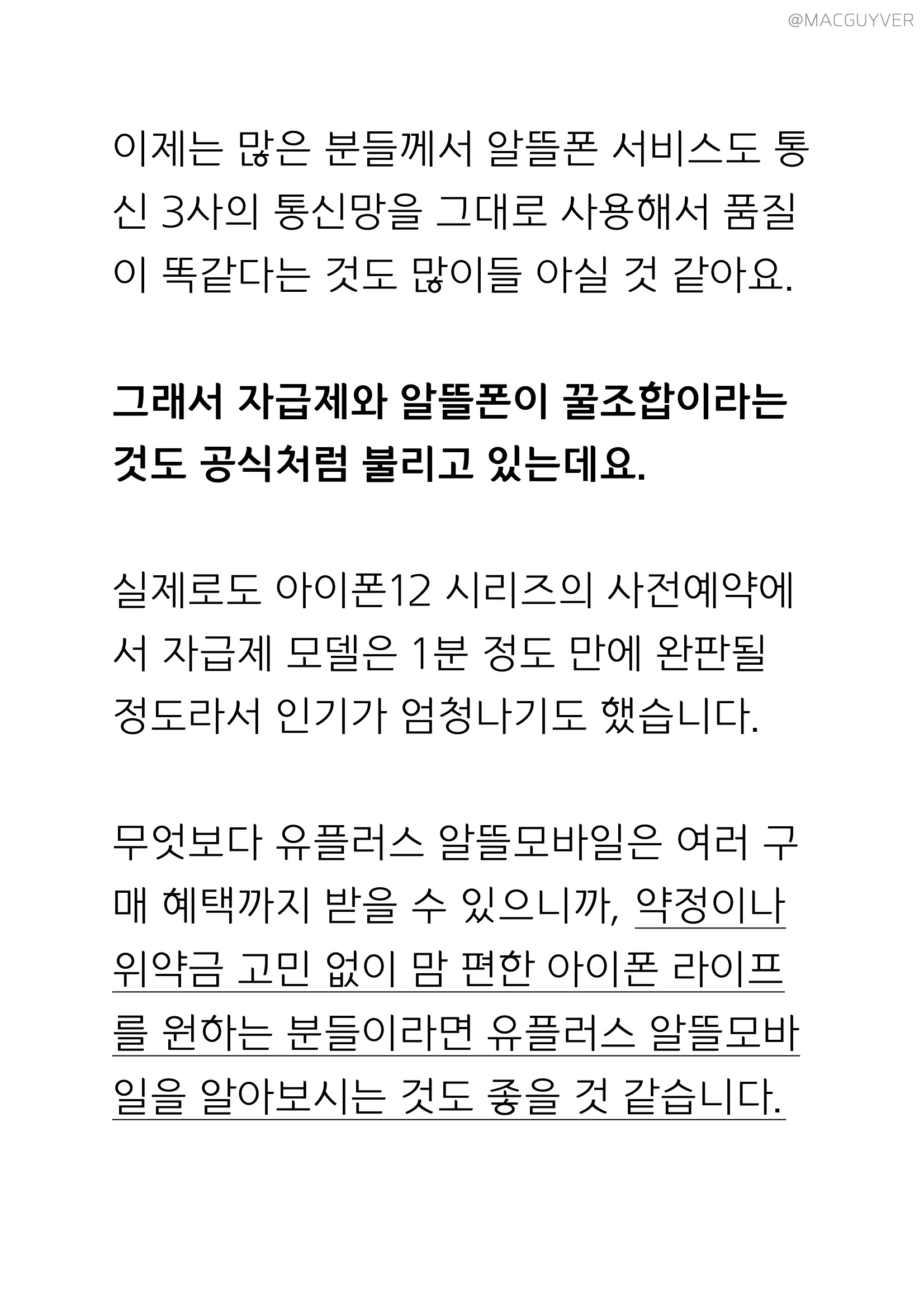 알뜰폰 추천 이제 마무리를 해볼까요? 직접 사용해본 유심 데이터 통화 마음껏 요금제는 통화 품질도 괜찮은데, 데이터가 정말 빠릿해서 만족스러웠어요. 알뜰폰 기본 데이터를 모두 소진해도 매일매일 2GB씩 추가 제공하는데다, 이 데이터도 모두 사용하면 추가로 3Mbps 속도로 무제한 데이터를 제공하더라고요. 그래서 일 제공량을 모두 소진한 상태에서 3Mbps로 인터넷을 써보니까 FHD 유튜브 재생도 거뜬하고, 웹서핑도 빠릿한데다 쇼핑도 정말 빠른 스크롤이 가능해서 답답하지 않았습니다. 유플러스 알뜰모바일 데이터를 펑펑 쓰면서도 아이폰 보험 6개월 무료에 약정도 없다는 게 신기할 정도인데요. 이제는 많은 분들께서 알뜰폰 서비스도 통신 3사의 통신망을 그대로 사용해서 품질이 똑같다는 것도 많이들 아실 것 같아요. 아이폰 알뜰폰, 그래서 자급제와 알뜰폰이 꿀조합이라는 것도 공식처럼 불리고 있는데요. 실제로도 아이폰12 시리즈의 사전예약에서 자급제 모델은 1분 정도 만에 완판될 정도라서 인기가 엄청나기도 했습니다. 무엇보다 유플러스 알뜰모바일은 다양한 구매 혜택까지 받을 수 있으니까, 약정이나 위약금 고민 없이 맘 편한 아이폰 라이프를 원하는 분들이라면 유플러스 알뜰모바일을 알아보시는 것도 좋을 것 같습니다. 앞서 소개 드린 댓글 알뜰폰 요금제 이벤트는 포스트와 영상 속에 숨겨진 문구로 '문장'을 만들어서 댓글을 남겨주시면 당첨 확률이 높아지니까 꼭 문장으로 여러분만의 이야기를 남겨주세요. 그리고 이벤트에 참여하실 때 이메일 주소도 꼭 남겨주시기 바랍니다. 오늘 소개해드린 유플러스 알뜰모바일이 궁금하신 분들은 아래 배너를 통해 더 알아보실 수 있습니다.