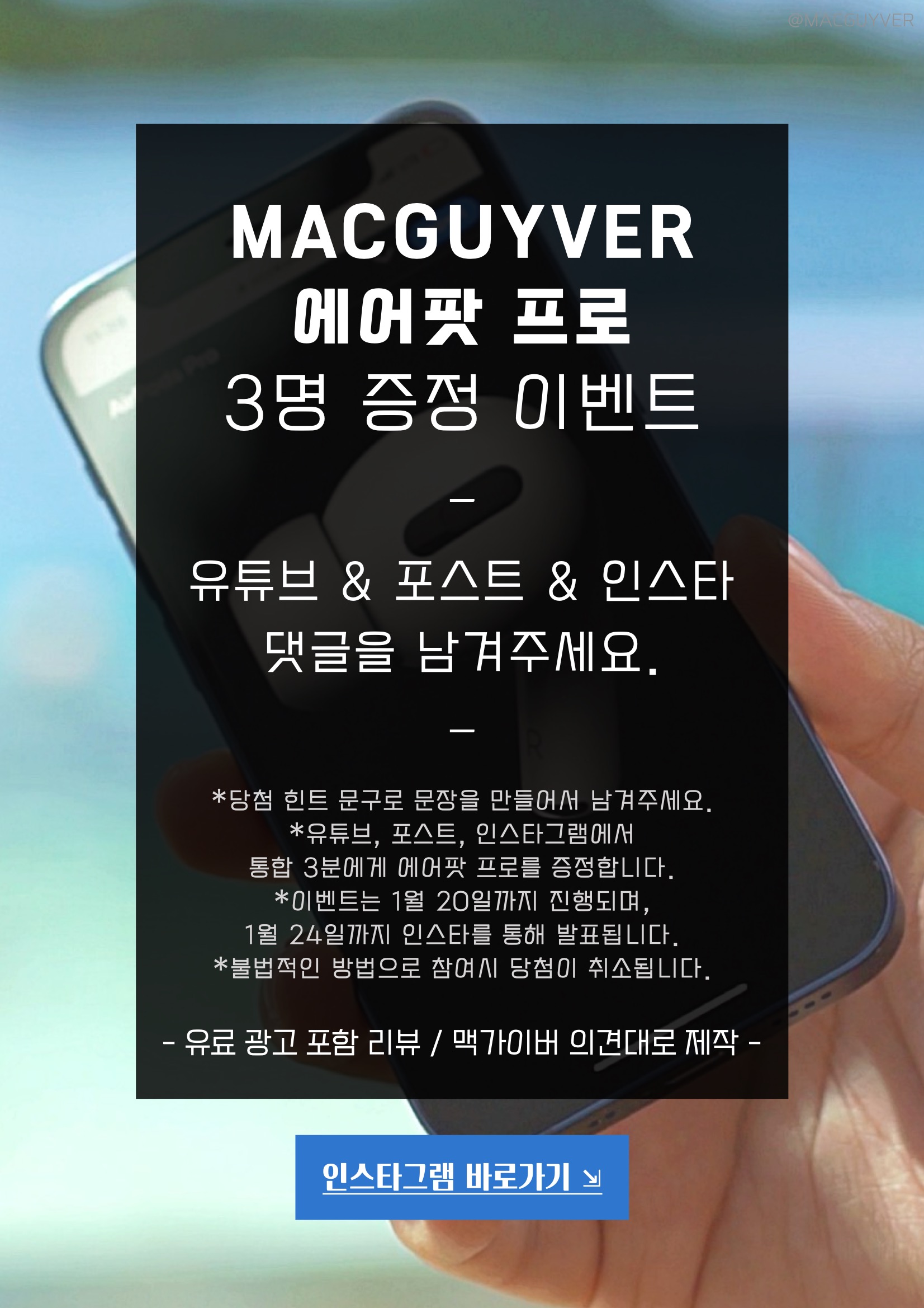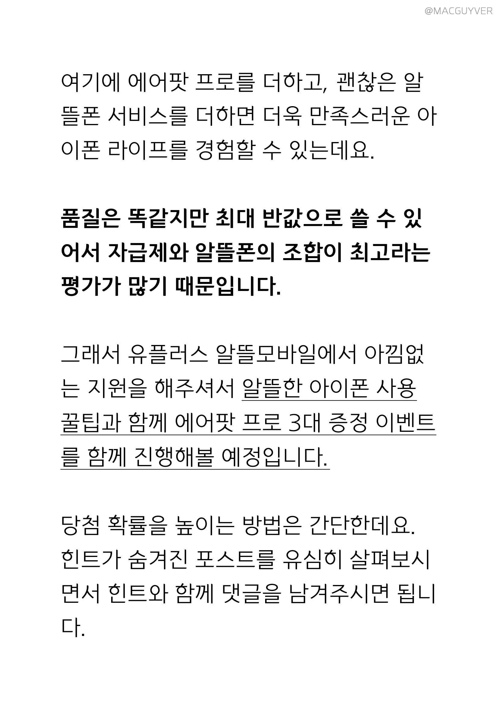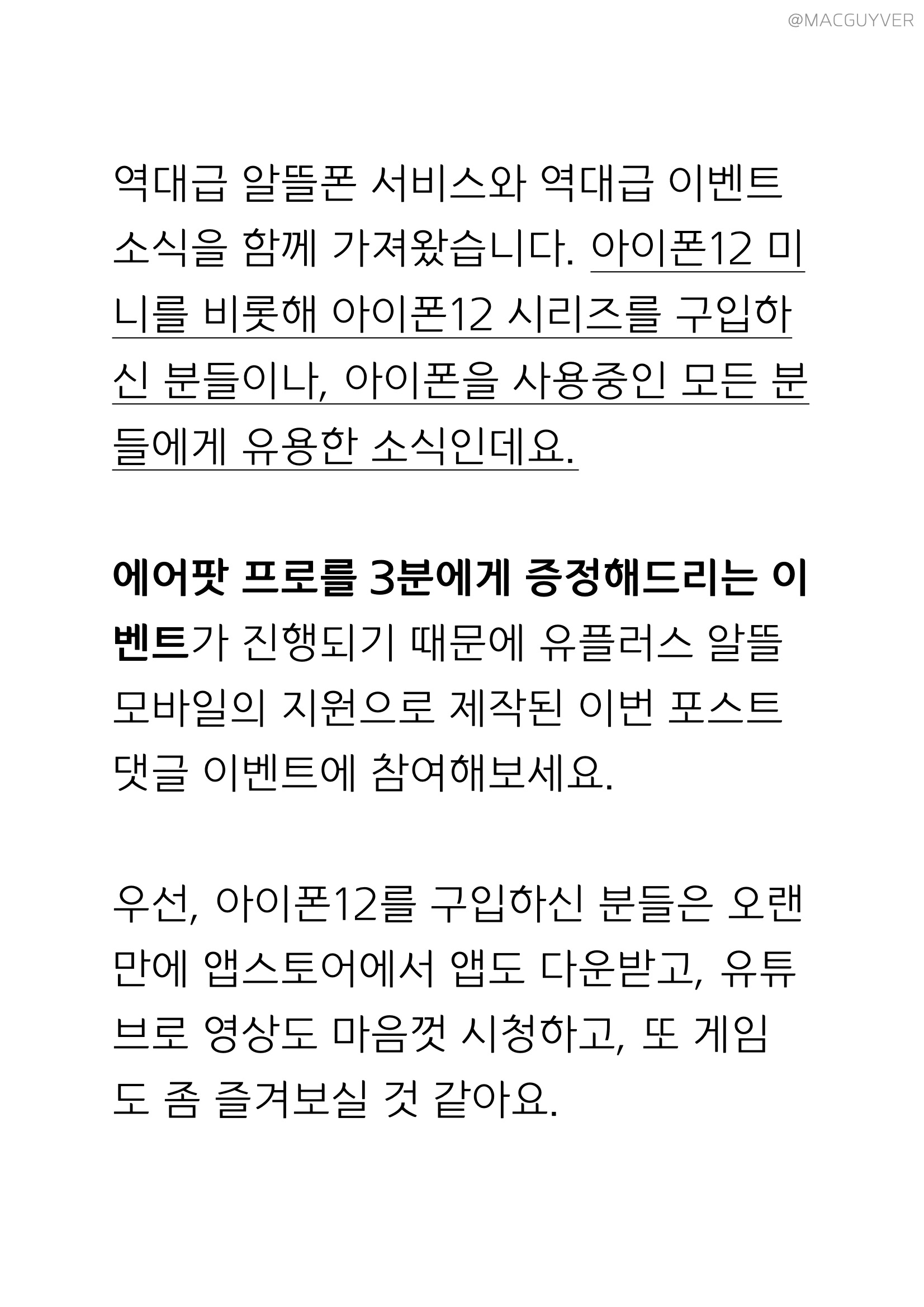 역대급 알뜰폰 서비스와 역대급 이벤트 소식을 함께 가져왔습니다. 아이폰12 미니를 비롯해 아이폰12 시리즈를 구입하신 분들이나, 아이폰을 사용중인 모든 분들에게 유용한 소식인데요. 에어팟 프로를 3분에게 증정해드리는 유플러스 알뜰모바일 이벤트가 진행되기 때문에 유플러스 알뜰모바일의 지원으로 제작된 이번 포스트 댓글 이벤트에 참여해보세요. 우선, 아이폰12를 구입하신 분들은 오랜만에 앱스토어에서 앱도 다운받고, 유튜브로 영상도 마음껏 시청하고, 또 게임도 좀 즐겨보실 것 같아요. 그런데 여기에 에어팟 프로를 더하고, 괜찮은 알뜰폰 서비스를 더하면 더욱 만족스러운 아이폰 라이프를 경험할 수 있는데요. 품질은 똑같지만 최대 반값으로 쓸 수 있어서 자급제와 알뜰폰의 조합이 최고라는 평가가 많기 때문입니다. 그래서 유플러스 알뜰모바일에서 아낌없는 지원을 해주셔서 알뜰한 아이폰 사용 꿀팁과 함께 에어팟 프로 3대 증정 이벤트를 함께 진행해볼 예정입니다. 당첨 확률을 높이는 방법은 간단한데요. 힌트가 숨겨진 포스트를 유심히 살펴보시면서 힌트와 함께 댓글을 남겨주시면 됩니다.
