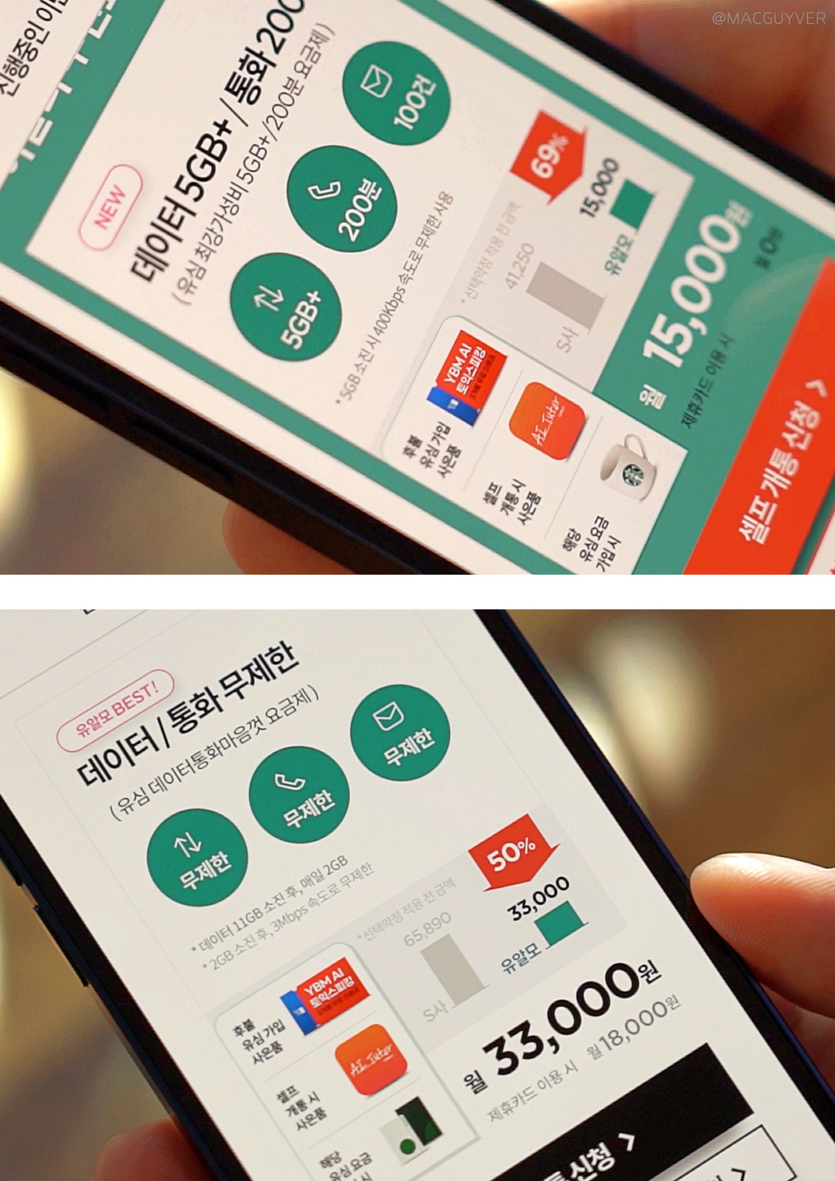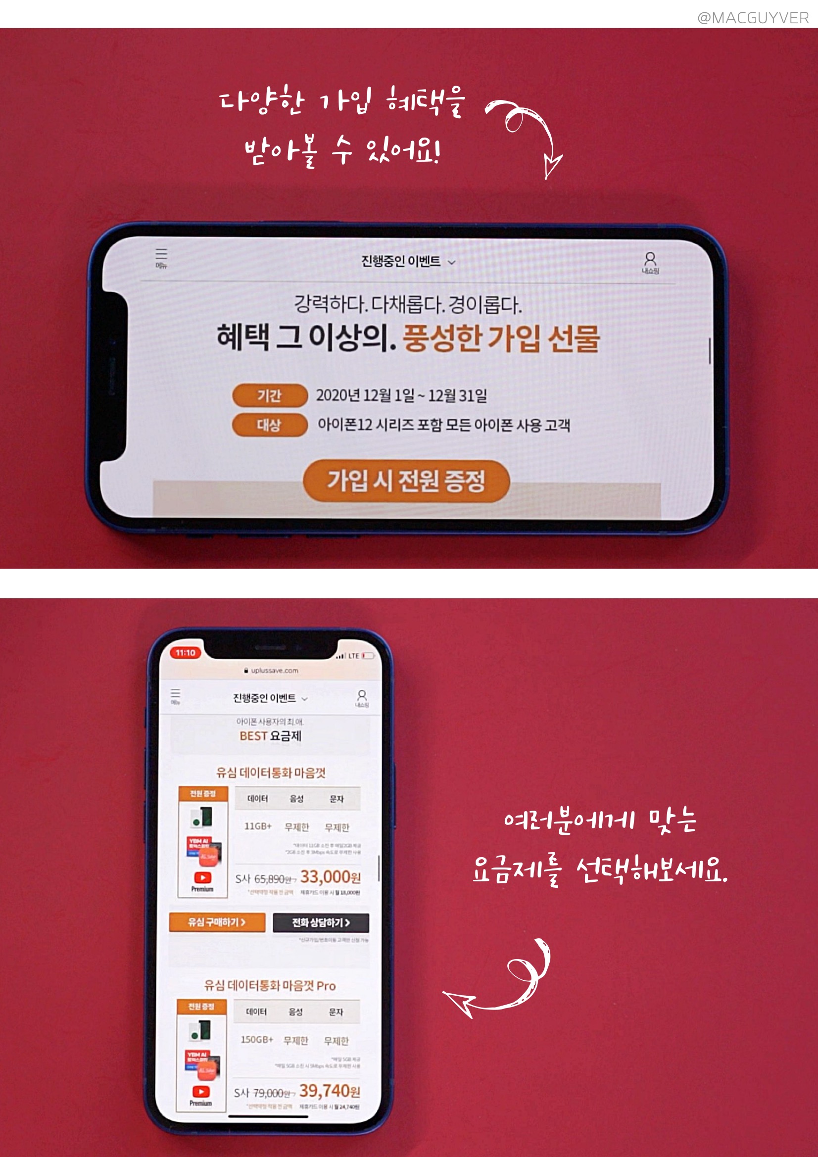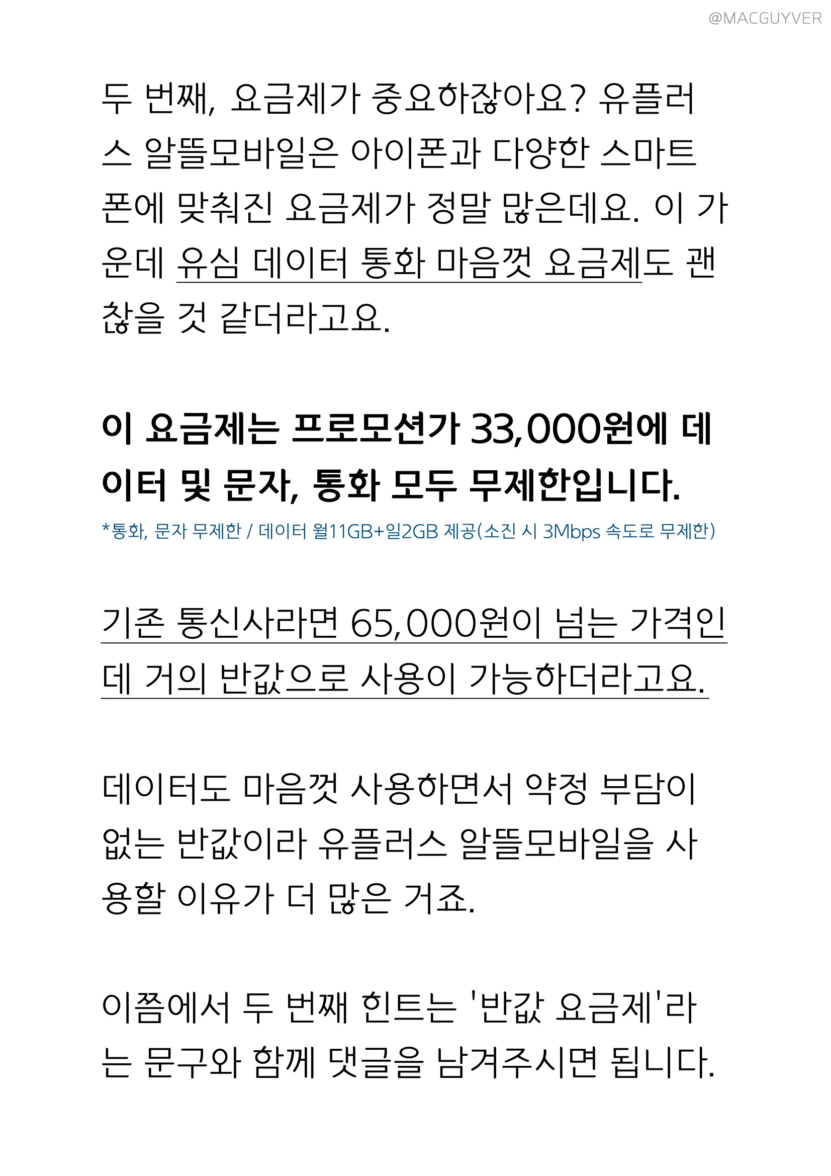 유플러스 두 번째, 요금제가 중요하잖아요? 유플러스 알뜰모바일은 아이폰과 다양한 스마트폰에 맞춰진 요금제가 정말 많은데요. 이 가운데 유심 데이터 통화 마음껏 요금제도 괜찮을 것 같더라고요. 이 요금제는 프로모션가 33,000원에 데이터 및 문자, 통화 모두 무제한입니다. *통화, 문자 무제한 / 데이터 월11GB+일2GB 제공(소진 시 3Mbps 속도로 무제한 기존 통신사라면 65,000원이 넘는 가격이지만 거의 반값으로 사용이 가능하더라고요. 데이터도 마음껏 사용하면서 약정 부담이 없는 반값이라 유플러스 알뜰모바일을 사용할 이유가 더 많은 거죠. 이쯤에서 유플러스 알뜰모바일 두 번째 힌트는 '반값 요금제'라는 문구와 함께 댓글을 남겨주시면 됩니다.