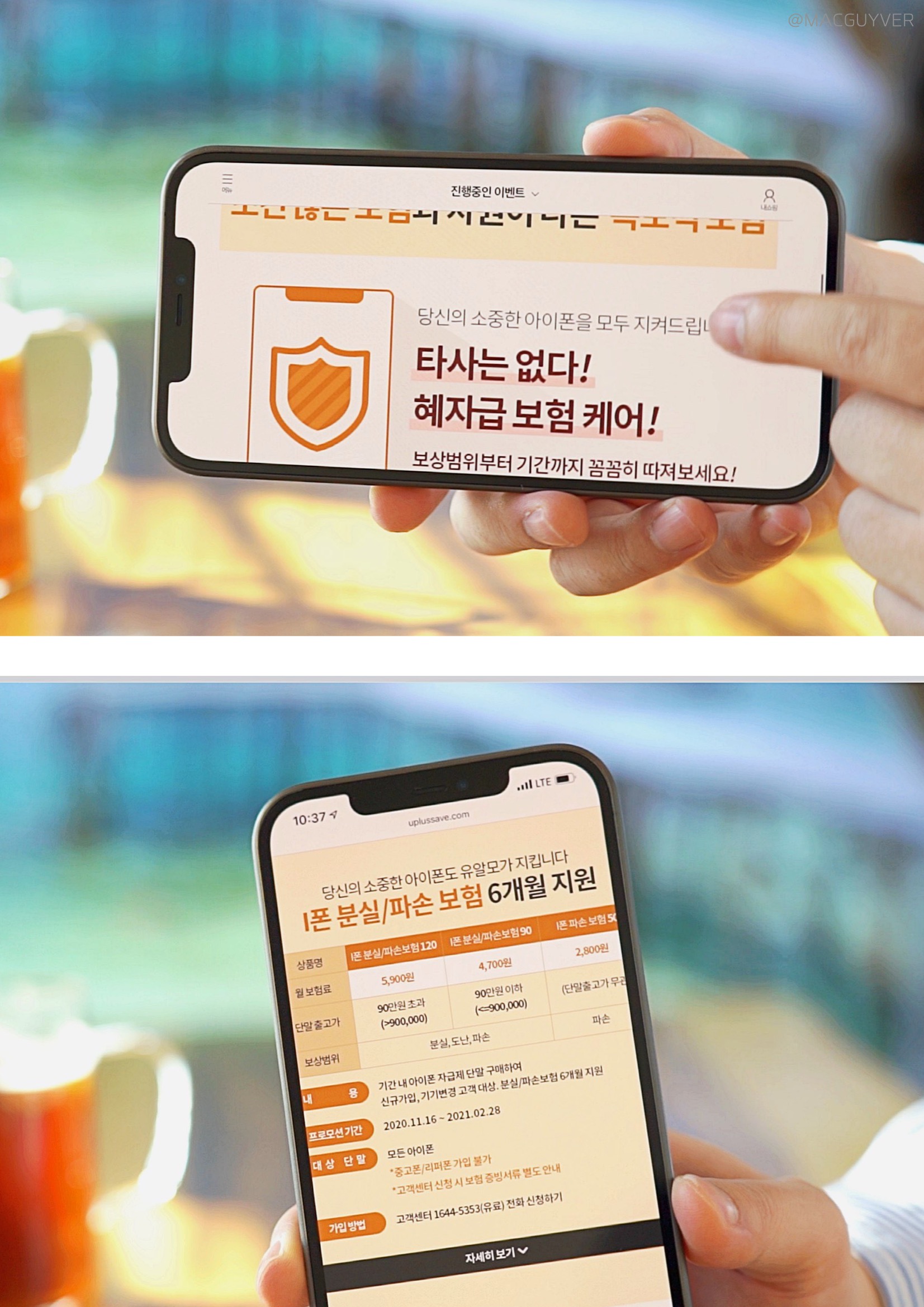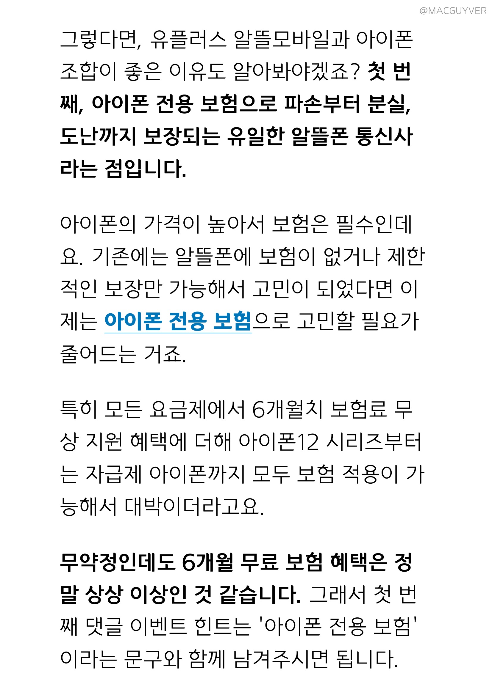 그렇다면, 유플러스 알뜰모바일과 아이폰 조합이 좋은 이유도 알아봐야겠죠? 아이폰12 알뜰폰 첫 번째, 아이폰 전용 보험으로 파손부터 분실, 도난까지 보장되는 유일한 알뜰폰 통신사라는 점입니다. 아이폰 알뜰폰, 아이폰의 가격이 높아서 보험은 필수인데요. 기존에는 알뜰폰에 보험이 없거나 제한적인 보장만 가능해서 고민이 되었다면 이제는 아이폰 전용 보험으로 고민할 필요가 줄어드는 거죠. 특히 모든 요금제에서 6개월치 보험료 무상 지원 혜택에 더해 아이폰12 시리즈부터는 자급제 아이폰까지 모두 보험 적용이 가능해서 대박이더라고요. 유플러스 무약정인데도 6개월 무료 보험 혜택은 정말 상상 이상인 것 같습니다. 그래서 첫 번째 알뜰폰 요금제 댓글 이벤트 힌트는 '아이폰 전용 보험'이라는 문구와 함께 남겨주시면 됩니다.