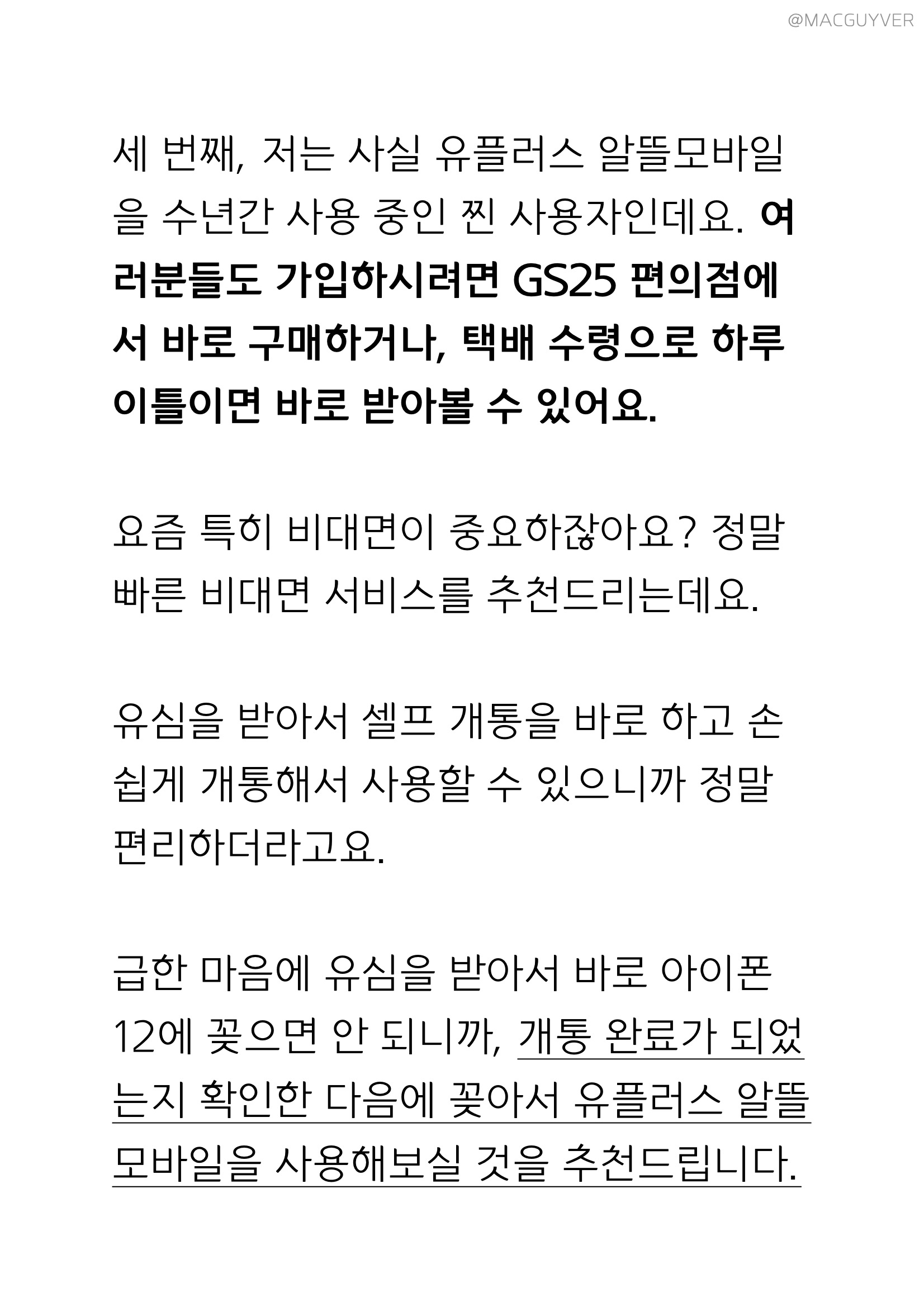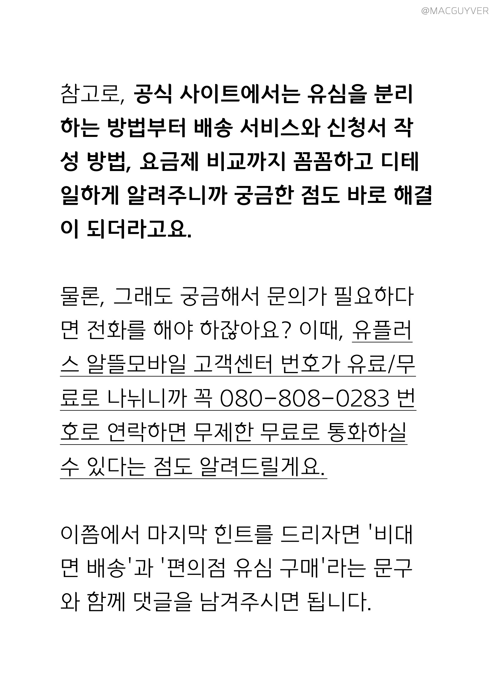 알뜰폰 요금제 세 번째, 저는 사실 유플러스 알뜰모바일을 수년간 사용 중인 찐 사용자인데요. 여러분들도 가입하시려면 GS25 편의점에서 바로 구매하거나, 택배 수령으로 하루 이틀이면 바로 받아볼 수 있어요. 요즘에는 특히 비대면이 중요하잖아요? 정말 빠른 비대면 서비스를 추천드리는데요. 유심을 받아서 셀프 개통을 바로 하고 손쉽게 개통해서 사용할 수 있으니까 정말 편리하더라고요. 급한 마음에 유심을 받아서 바로 아이폰12에 꽂으면 안 되니까, 개통 완료가 되었는지 확인한 다음에 꽂아서 유플러스 알뜰모바일을 사용해보실 것을 추천드립니다. 유모비 참고로, 공식 사이트에서는 유심을 분리하는 방법부터 배송 서비스와 신청서 작성 방법, 요금제 비교까지 꼼꼼하고 디테일하게 알려주니까 궁금한 점도 바로 해결이 되더라고요. 물론, 그래도 궁금해서 문의가 필요하다면 전화를 해야 하잖아요? 이때, 유플러스 알뜰모바일 고객센터 번호가 유료/무료로 나뉘니까 꼭 080-808-0283 번호로 연락하면 무제한 무료로 통화하실 수 있다는 점도 알려드릴게요. 이쯤에서 알뜰폰 추천 마지막 힌트를 드리자면 '비대면 배송'과 '편의점 유심 구매'라는 문구와 함께 댓글을 남겨주시면 됩니다.