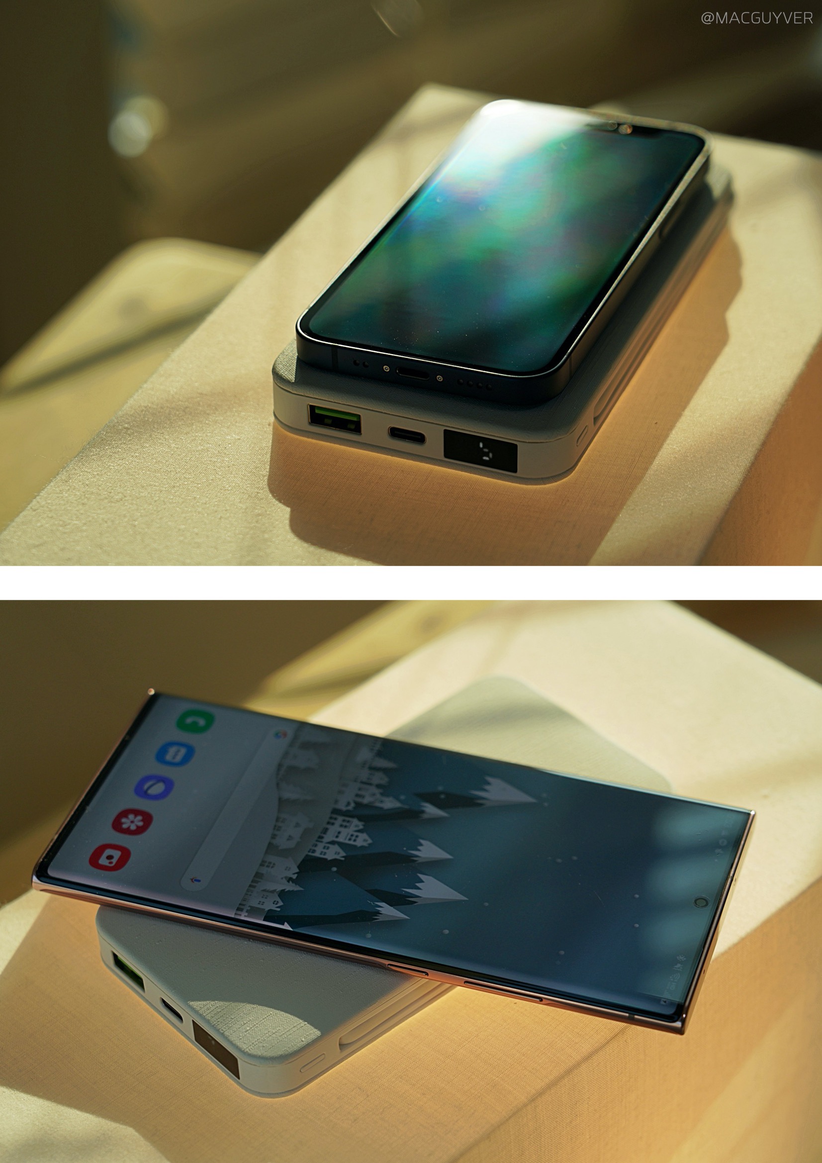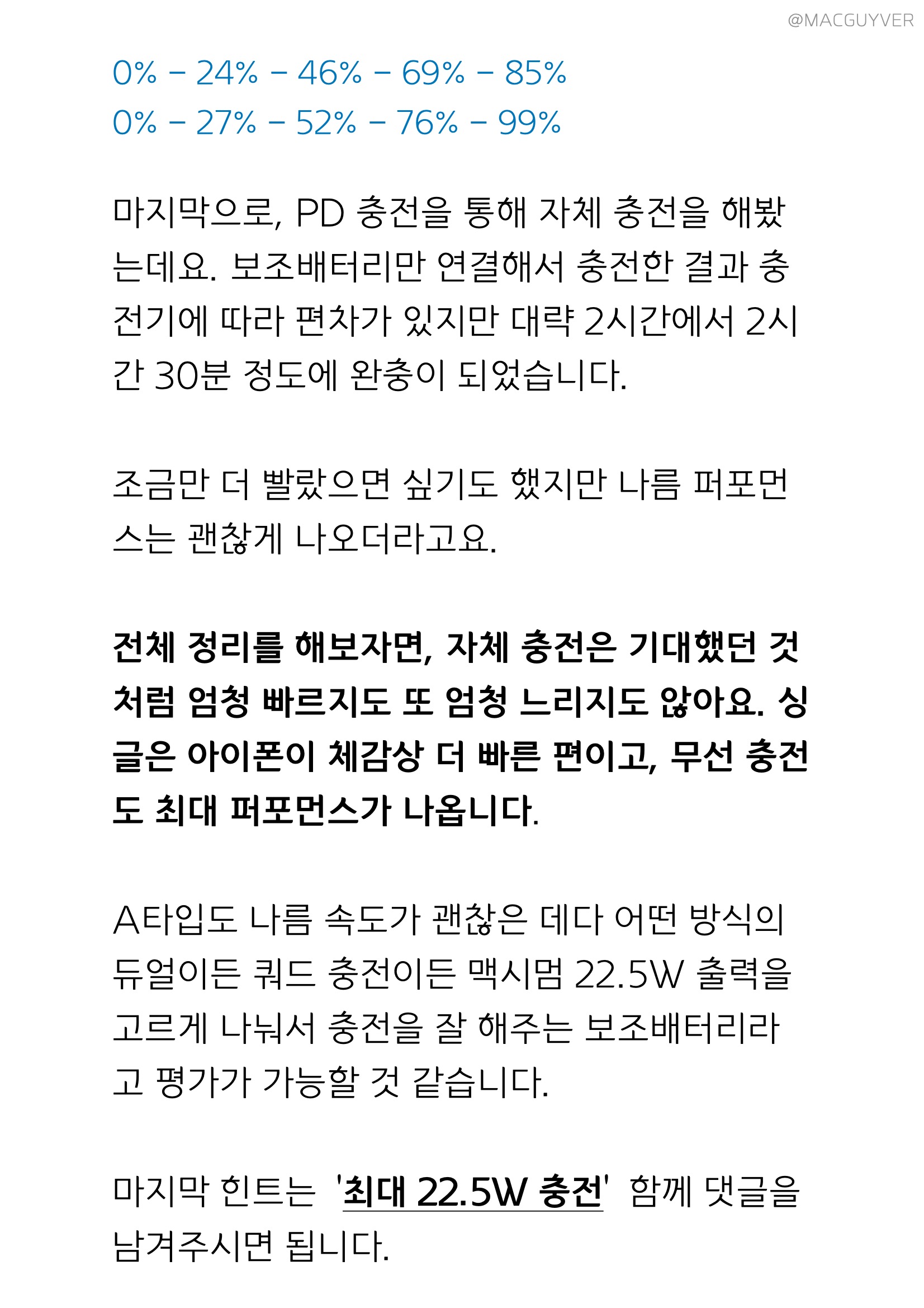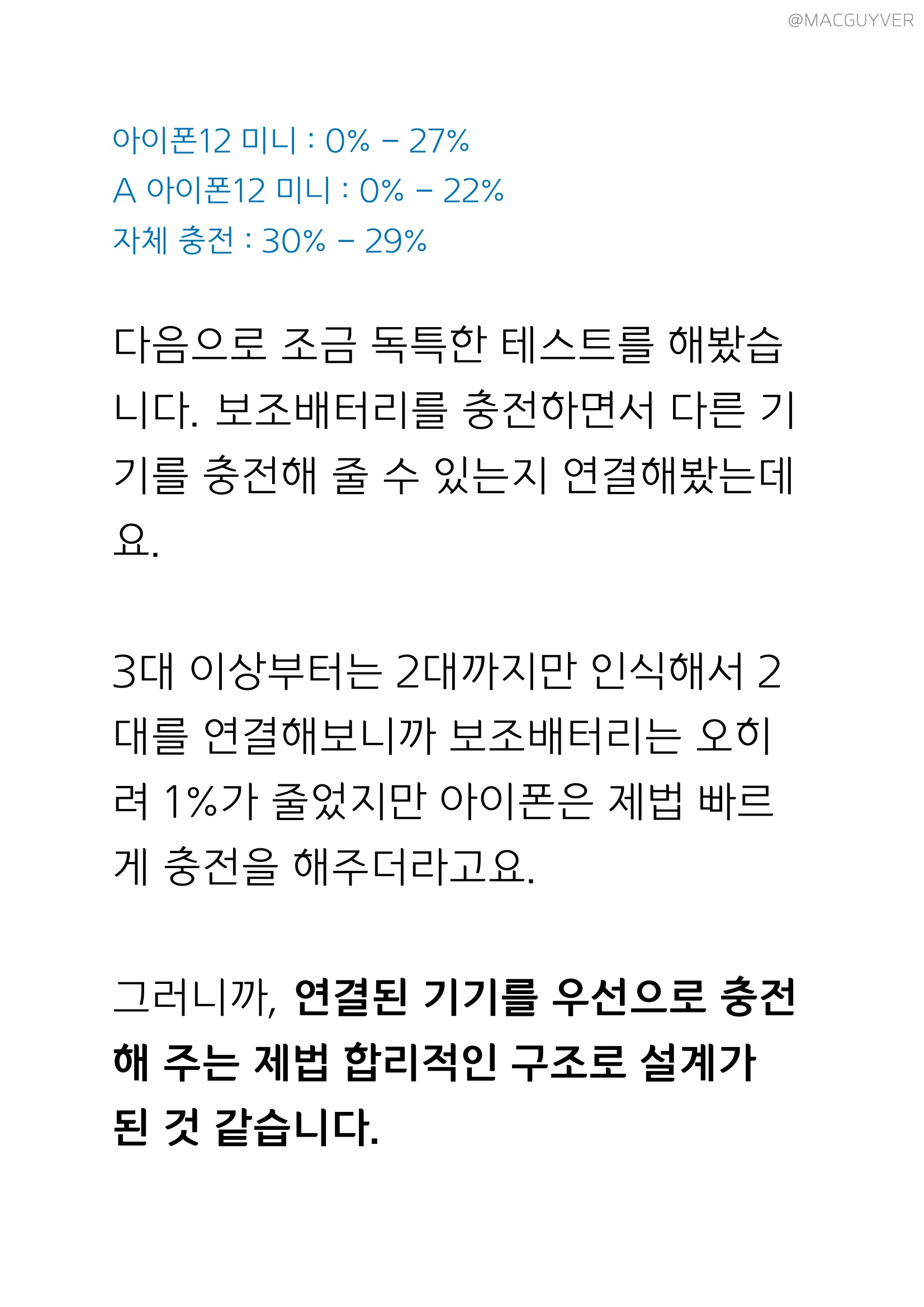 고속충전보조배터리 아이폰12 미니 : 0% - 27% A 아이폰12 미니 : 0% - 22% 자체 충전 : 30% - 29% 다음으로 조금 독특한 테스트를 해봤습니다. 보조배터리를 충전하면서 다른 기기를 충전해 줄 수 있는지 연결해봤는데요. 3대 이상부터는 2대까지만 인식해서 2대를 연결해보니까 보조배터리는 오히려 1%가 줄었지만 아이폰은 제법 빠르게 충전을 해주더라고요. 그러니까, 연결된 기기를 우선으로 충전해 주는 제법 합리적인 구조로 설계가 된 것 같습니다. 애플 충전기 0% - 24% - 46% - 69% - 85% 0% - 27% - 52% - 76% - 99% 마지막으로, PD 충전을 통해 자체 충전을 해봤는데요. 보조배터리만 연결해서 충전한 결과 충전기에 따라 편차가 있지만 대략 2시간에서 2시간 30분 정도에 완충이 되었습니다. 조금만 더 빨랐으면 싶기도 했지만 나름 퍼포먼스는 괜찮게 나오더라고요. 전체 정리를 해보자면, 자체 충전은 기대했던 것처럼 엄청 빠르지도 또 엄청 느리지도 않아요. 싱글은 아이폰이 체감상 더 빠른 편이고, 무선 충전도 최대 퍼포먼스가 나옵니다. A타입도 나름 속도가 괜찮은 데다 어떤 방식의 듀얼이든 쿼드 충전이든 맥시멈 22.5W 출력을 고르게 나눠서 충전을 잘 해주는 보조배터리라고 평가가 가능할 것 같습니다. 마지막 힌트는 ‘최대 22.5W 충전’ 함께 댓글을 남겨주시면 됩니다.
