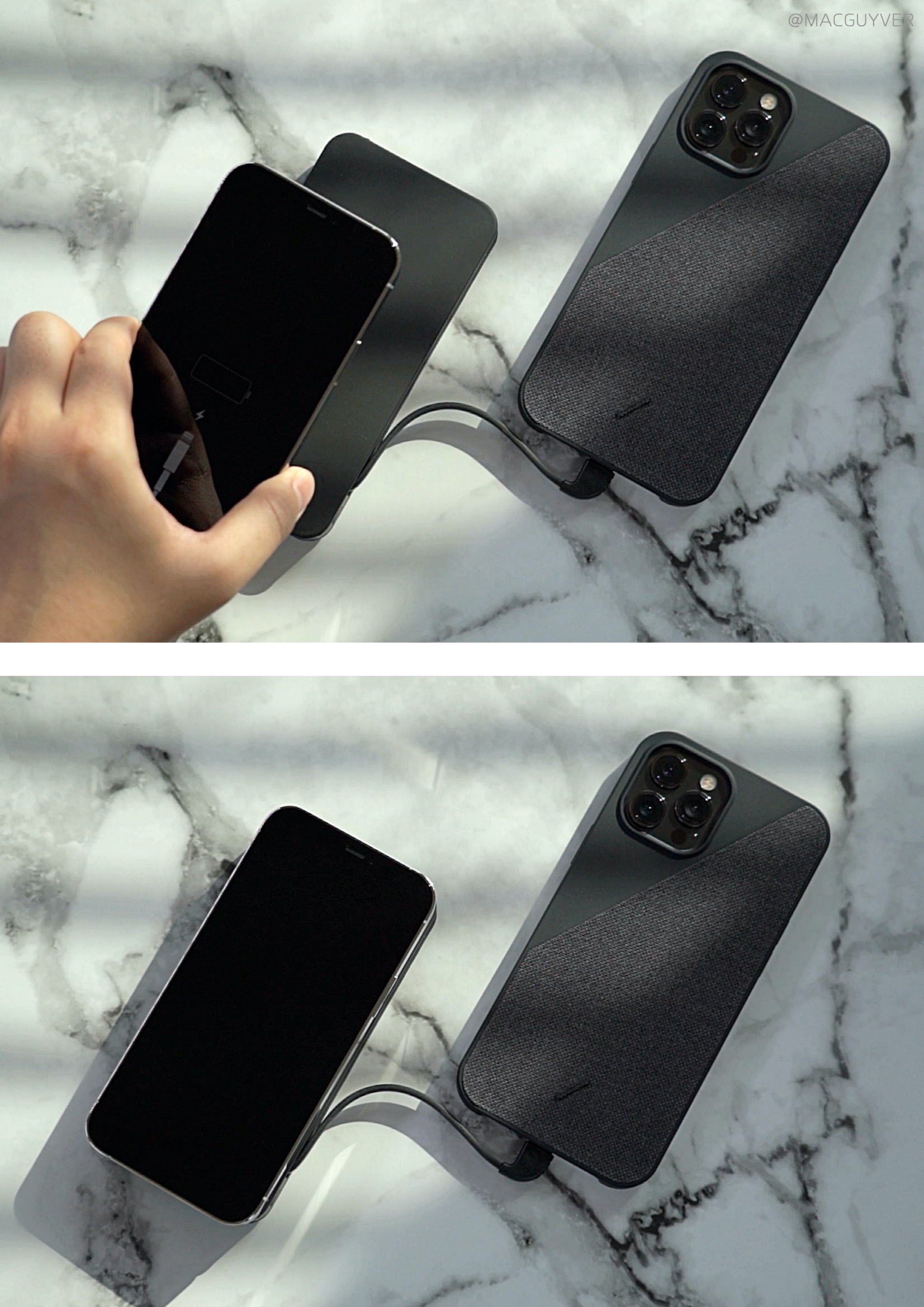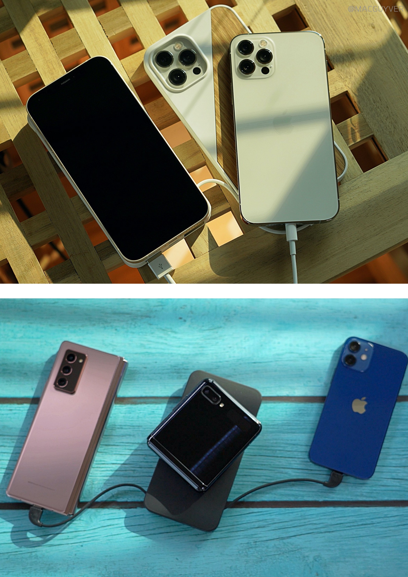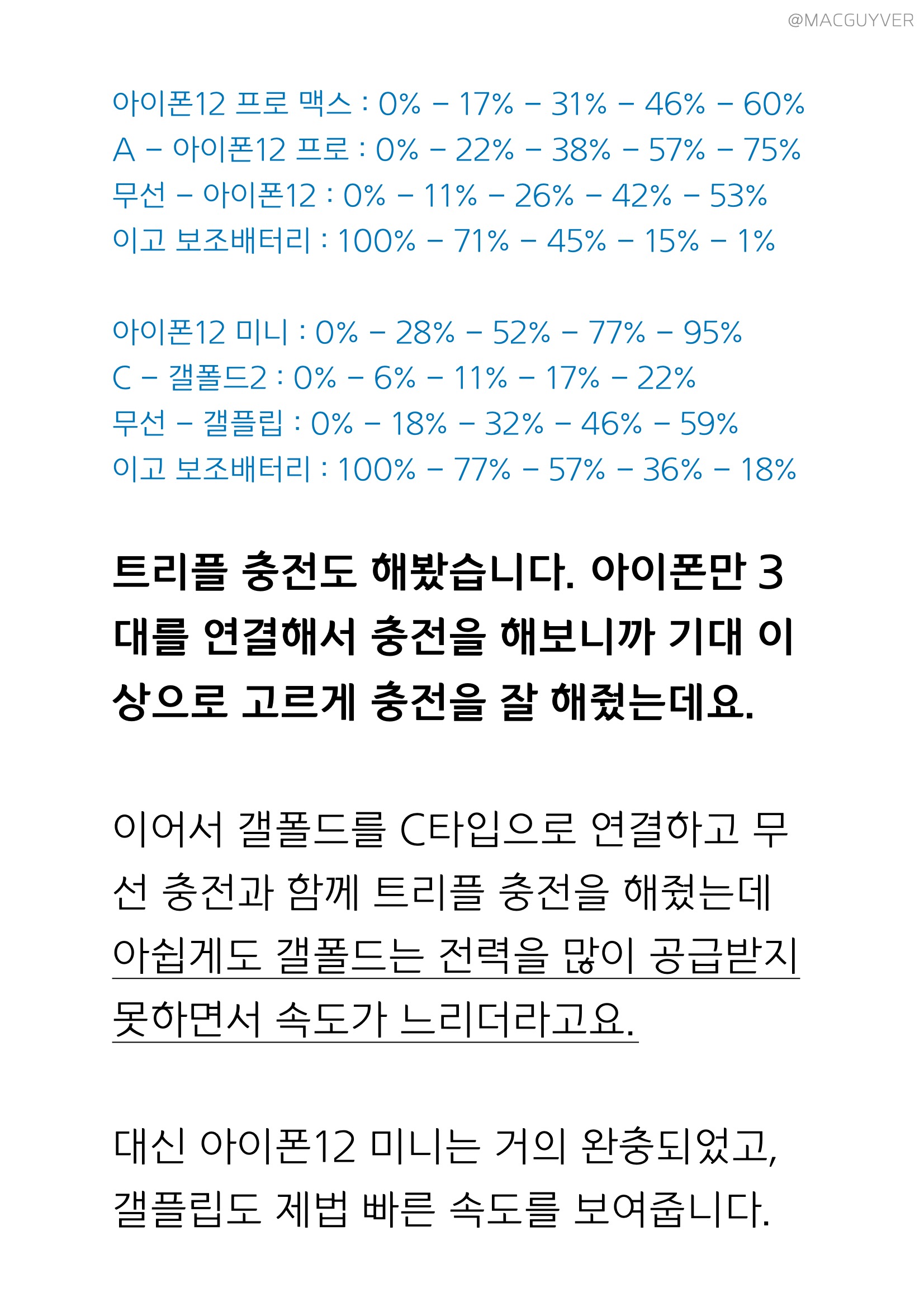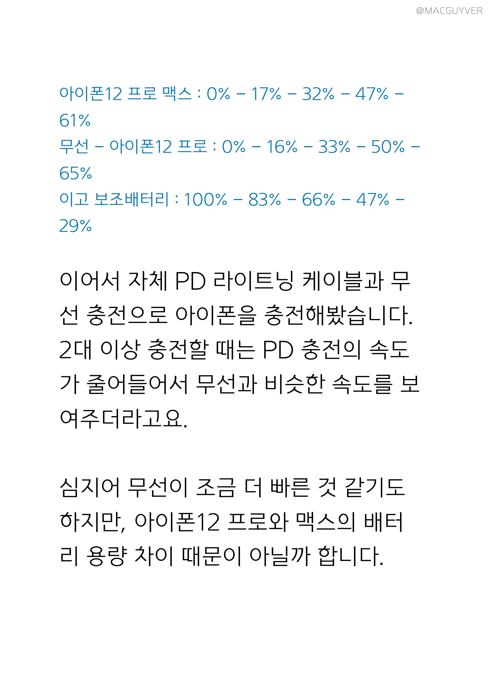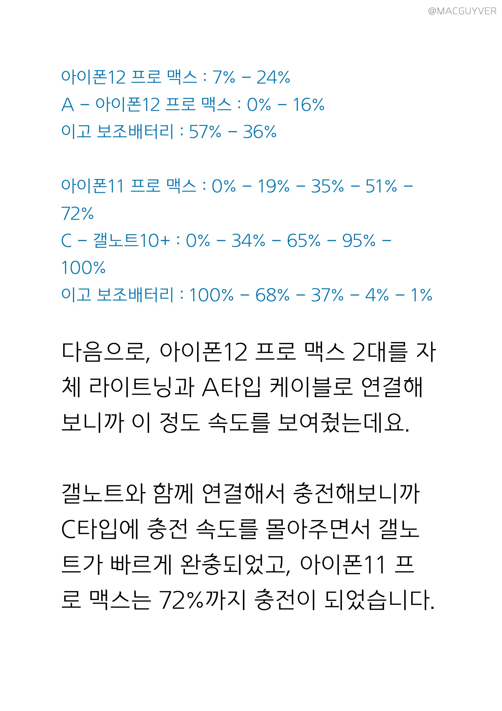 고속충전보조배터리 아이폰12 프로 맥스 : 7% - 24% A - 아이폰12 프로 맥스 : 0% - 16% 이고 보조배터리 : 57% - 36% 아이폰11 프로 맥스 : 0% - 19% - 35% - 51% - 72% C - 갤노트10+ : 0% - 34% - 65% - 95% - 100% 이고 보조배터리 : 100% - 68% - 37% - 4% - 1% 다음으로, 아이폰12 프로 맥스 2대를 자체 라이트닝과 A타입 케이블로 연결해보니까 이 정도 속도를 보여줬는데요. 갤노트와 함께 연결해서 충전해보니까 C타입에 충전 속도를 몰아주면서 갤노트가 빠르게 완충되었고, 아이폰11 프로 맥스는 72%까지 충전이 되었습니다. 아이폰12 프로 맥스 : 0% - 17% - 32% - 47% - 61% 무선 - 아이폰12 프로 : 0% - 16% - 33% - 50% - 65% 이고 보조배터리 : 100% - 83% - 66% - 47% - 29% 이어서 자체 PD 라이트닝 케이블과 무선 충전으로 아이폰을 충전해봤습니다. 2대 이상 충전할 때는 PD 충전의 속도가 줄어들어서 무선과 비슷한 속도를 보여주더라고요. 심지어 무선이 조금 더 빠른 것 같기도 하지만, 아이폰12 프로와 맥스의 배터리 용량 차이 때문이 아닐까 합니다.