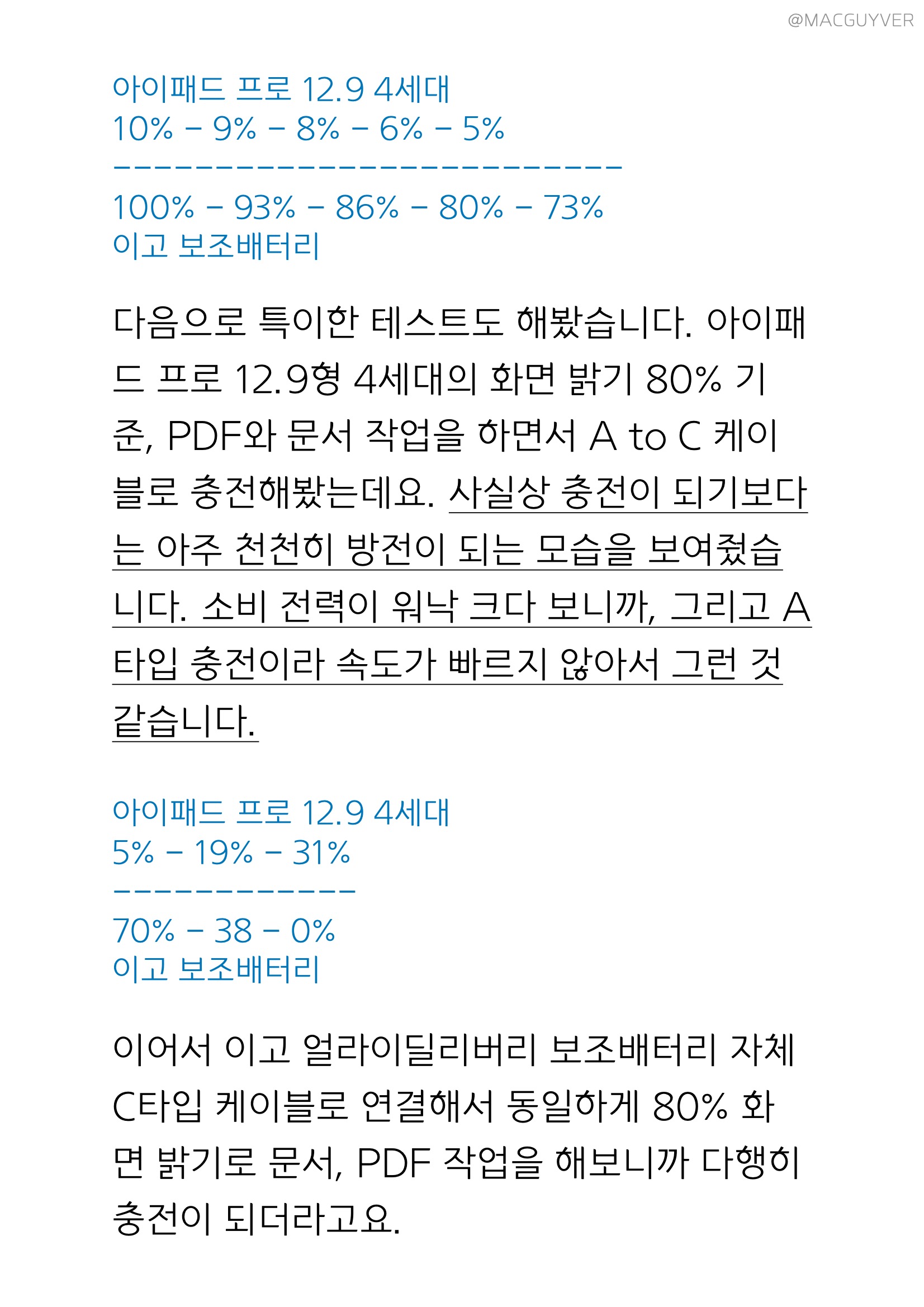 아이폰12 미니 0% - 24% - 39% - 55% - 65% ------------------------- 100% - 90% - 83% - 75% - 70% 이고 보조배터리 갤럭시 노트 20 울트라 0% - 20% - 37% - 51% - 64% - 75% ---------------------------- 70% - 53% - 38% - 26% - 14% - 4% 이고 보조배터리 다음으로 무선 충전도 해봤는데요. 아이폰12 미니와 갤노트20 울트라가 제법 비슷한 속도로 충전이 되더라고요. 30분에 20% 내외, 90분에 50% 내외로 충전이 되니까 평소에 올려두면서 사용하기에 좋은 거죠. 아이폰 보조배터리 이고 아이패드 프로 12.9 4세대 10% - 9% - 8% - 6% - 5% ------------------------- 100% - 93% - 86% - 80% - 73% 이고 보조배터리 다음으로 특이한 테스트도 해봤습니다. 아이패드 프로 12.9형 4세대의 화면 밝기 80% 기준, PDF와 문서 작업을 하면서 A to C 케이블로 충전해봤는데요. 사실상 충전이 되기보다는 아주 천천히 방전이 되는 모습을 보여줬습니다. 소비 전력이 워낙 크다 보니까, 그리고 A타입 충전이라 속도가 빠르지 않아서 그런 것 같습니다.