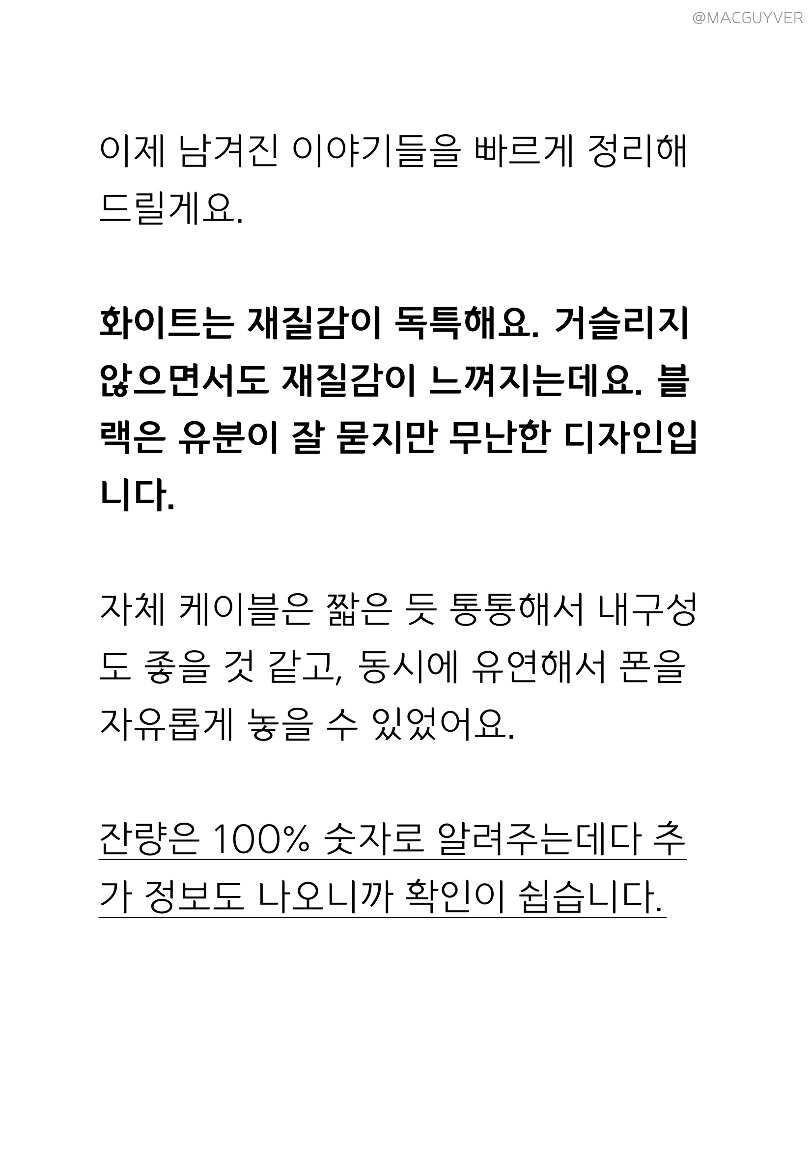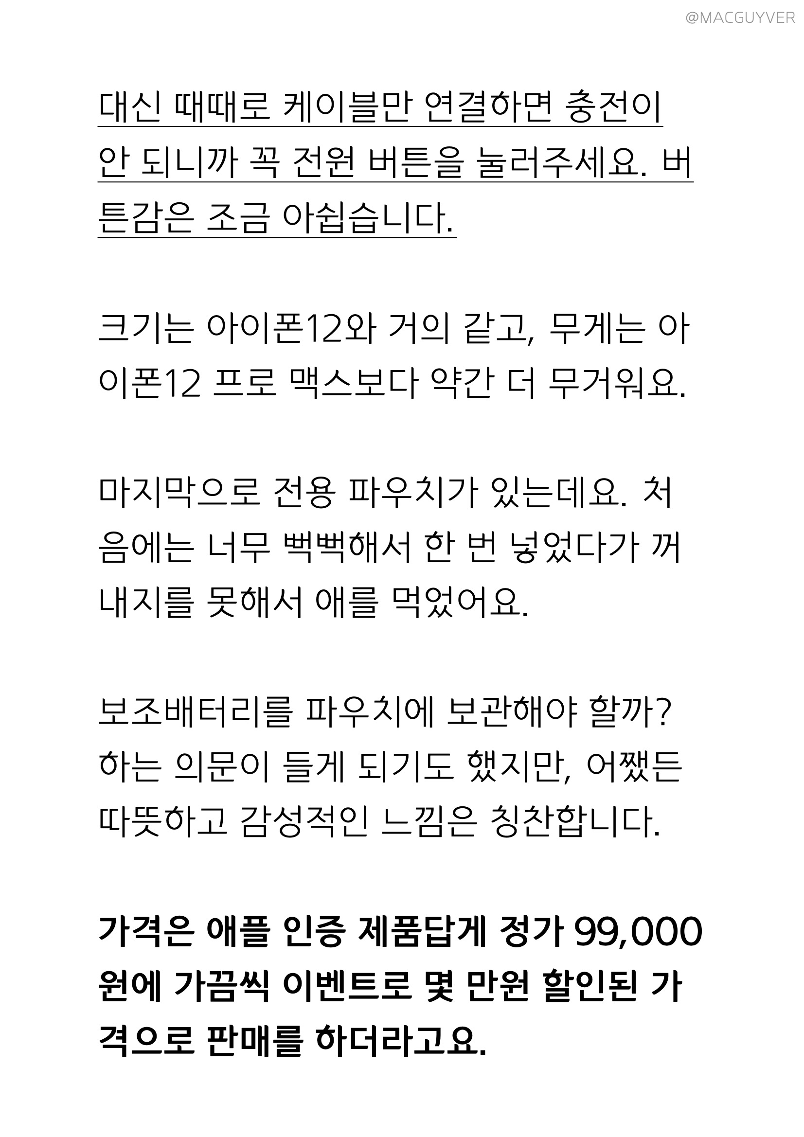 무선 보조배터리 이제 남겨진 이야기들을 빠르게 정리해드릴게요. 화이트는 재질감이 독특해요. 거슬리지 않으면서도 재질감이 느껴지는데요. 블랙은 유분이 잘 묻지만 무난한 디자인입니다. 고속충전기 자체 케이블은 짧은 듯 통통해서 내구성도 좋을 것 같고, 동시에 유연해서 폰을 자유롭게 놓을 수 있었어요. 잔량은 100% 숫자로 알려주는데다 추가 정보도 나오니까 확인이 쉬운 편인데요. 대신 때때로 케이블만 연결하면 충전이 안 되니까 꼭 전원 버튼을 눌러주세요. 버튼감은 조금 아쉽습니다. 애플 충전기 크기는 아이폰12와 거의 같고, 무게는 아이폰12 프로 맥스보다 약간 더 무거워요. 마지막으로 전용 파우치가 있는데요. 처음에는 너무 뻑뻑해서 한 번 넣었다가 꺼내지를 못해서 애를 먹었어요. 보조배터리를 파우치에 보관해야 할까? 하는 의문이 들게 되기도 했지만, 어쨌든 따뜻하고 감성적인 느낌은 칭찬합니다. 가격은 애플 인증 제품답게 정가 99,000원에 가끔씩 이벤트로 몇 만원 할인된 가격으로 판매를 하더라고요. 스마트폰에 여러 스마트 기기까지 함께 사용하시는 분들이라면 이 제품이 올인원으로, 또 애플 인증 제품으로 믿고 쓸 수 있지 않을까 합니다. 마지막으로, 3대 증정 이벤트는 리뷰 속 숨겨진 문구를 그냥 나열하는 게 아닌, '문장'을 만들어서 댓글을 남겨주시면 당첨 확률이 높아지니까 리뷰를 꼼꼼히 보시면서 이벤트에 참여해보시기 바랍니다. 이고 얼라이딜리버리 보조배터리가 궁금하신 분들은 아래 배너를 통해 더 알아보실 수 있습니다.