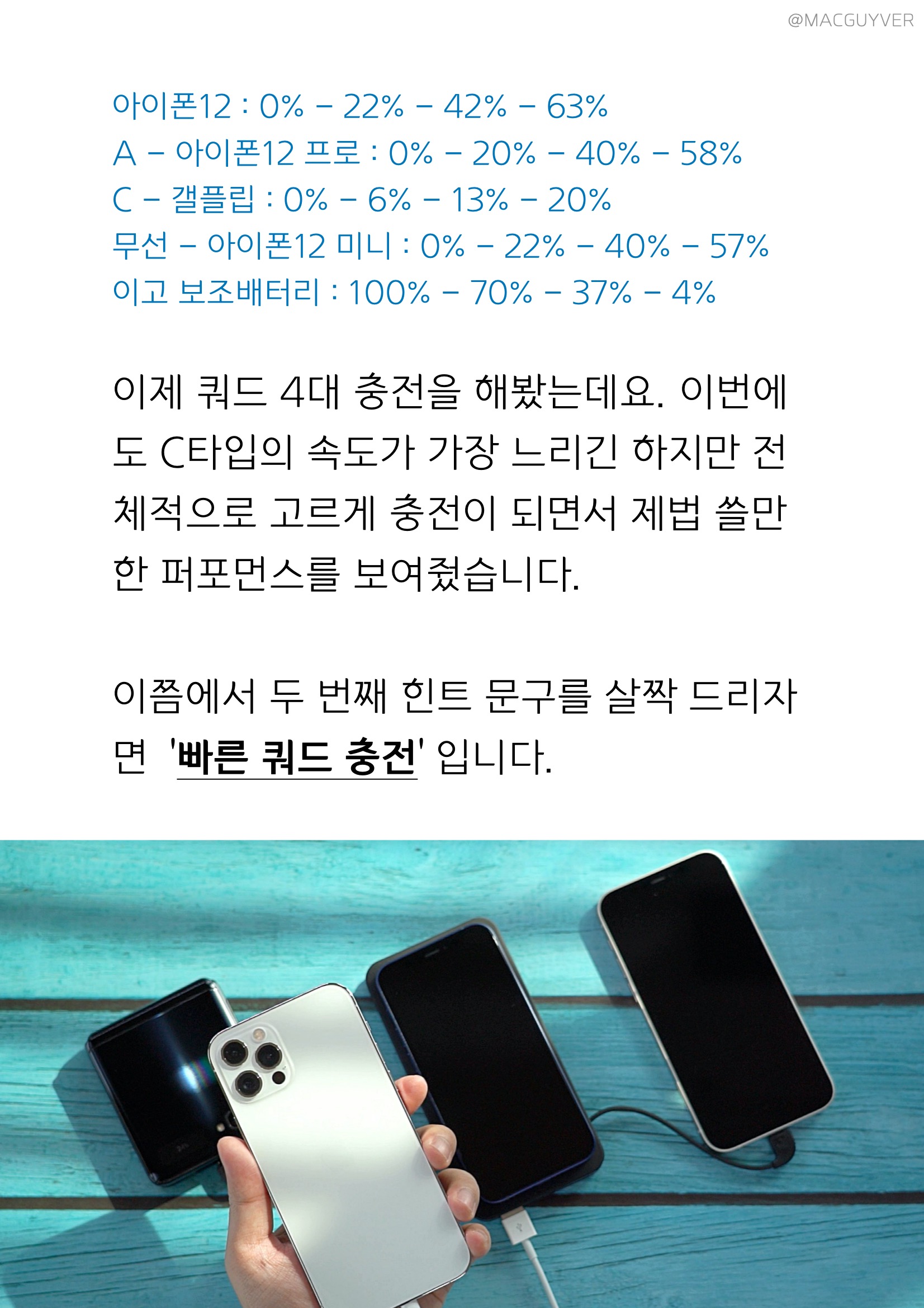 애플 보조배터리 이고 추천 아이폰12 프로 맥스 : 0% - 17% - 31% - 46% - 60% A - 아이폰12 프로 : 0% - 22% - 38% - 57% - 75% 무선 - 아이폰12 : 0% - 11% - 26% - 42% - 53% 이고 보조배터리 : 100% - 71% - 45% - 15% - 1% 아이폰12 미니 : 0% - 28% - 52% - 77% - 95% C - 갤폴드2 : 0% - 6% - 11% - 17% - 22% 무선 - 갤플립 : 0% - 18% - 32% - 46% - 59% 이고 보조배터리 : 100% - 77% - 57% - 36% - 18% 트리플 충전도 해봤습니다. 아이폰만 3대를 연결해서 충전을 해보니까 기대 이상으로 고르게 충전을 잘 해줬는데요. 이어서 갤폴드를 C타입으로 연결하고 무선 충전과 함께 트리플 충전을 해줬는데 아쉽게도 갤폴드는 전력을 많이 공급받지 못하면서 속도가 느리더라고요. 대신 아이폰12 미니는 거의 완충이 되었고, 갤플립도 제법 빠른 속도를 보여줍니다. 애플 충전기 아이폰12 : 0% - 22% - 42% - 63% A - 아이폰12 프로 : 0% - 20% - 40% - 58% C - 갤플립 : 0% - 6% - 13% - 20% 무선 - 아이폰12 미니 : 0% - 22% - 40% - 57% 이고 보조배터리 : 100% - 70% - 37% - 4% 이제 쿼드 4대 충전을 해봤는데요. 이번에도 C타입의 속도가 가장 느리긴 하지만 전체적으로 고르게 충전이 되면서 제법 쓸만한 퍼포먼스를 보여줬습니다. 이쯤에서 두 번째 힌트 문구를 살짝 드리자면 ‘빠른 쿼드 충전’입니다.