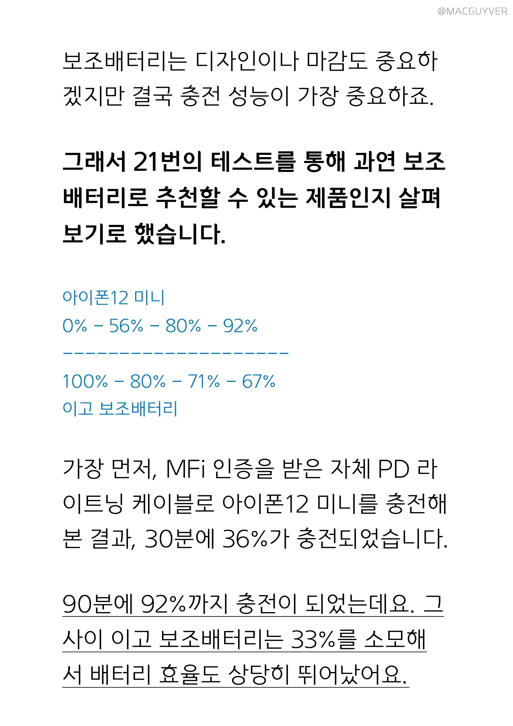 고속충전보조배터리나 보조배터리는 디자인이나 마감도 중요하겠지만 결국 충전 성능이 가장 중요한데요. 그래서 21번의 고속충전기 테스트를 통해 과연 보조배터리로 추천할 수 있는 제품인지 살펴보기로 했습니다. 아이폰12 미니 0% - 56% - 80% - 92% -------------------- 100% - 80% - 71% - 67% 이고 보조배터리 가장 먼저, MFi 인증을 받은 자체 PD 라이트닝 케이블로 아이폰12 미니를 충전해본 결과, 30분에 36%가 충전되었습니다. 90분에 92%까지 충전이 되었는데요. 그사이 이고 보조배터리는 33%를 소모해서 배터리 효율도 상당히 뛰어나더라고요. 아이폰12 프로 0% - 58% - 87% -------------- 100% - 71% - 57% 이고 보조배터리 이어서 아이폰12 프로를 충전해보니까 30분에 58%를 충전해서 아이폰12 미니보다도 더 빨리 충전이 되었는데요. 배터리 소모량도 그만큼 많아졌지만 배터리 용량이 커져도 속도가 상당하다는 게 눈에 띕니다.