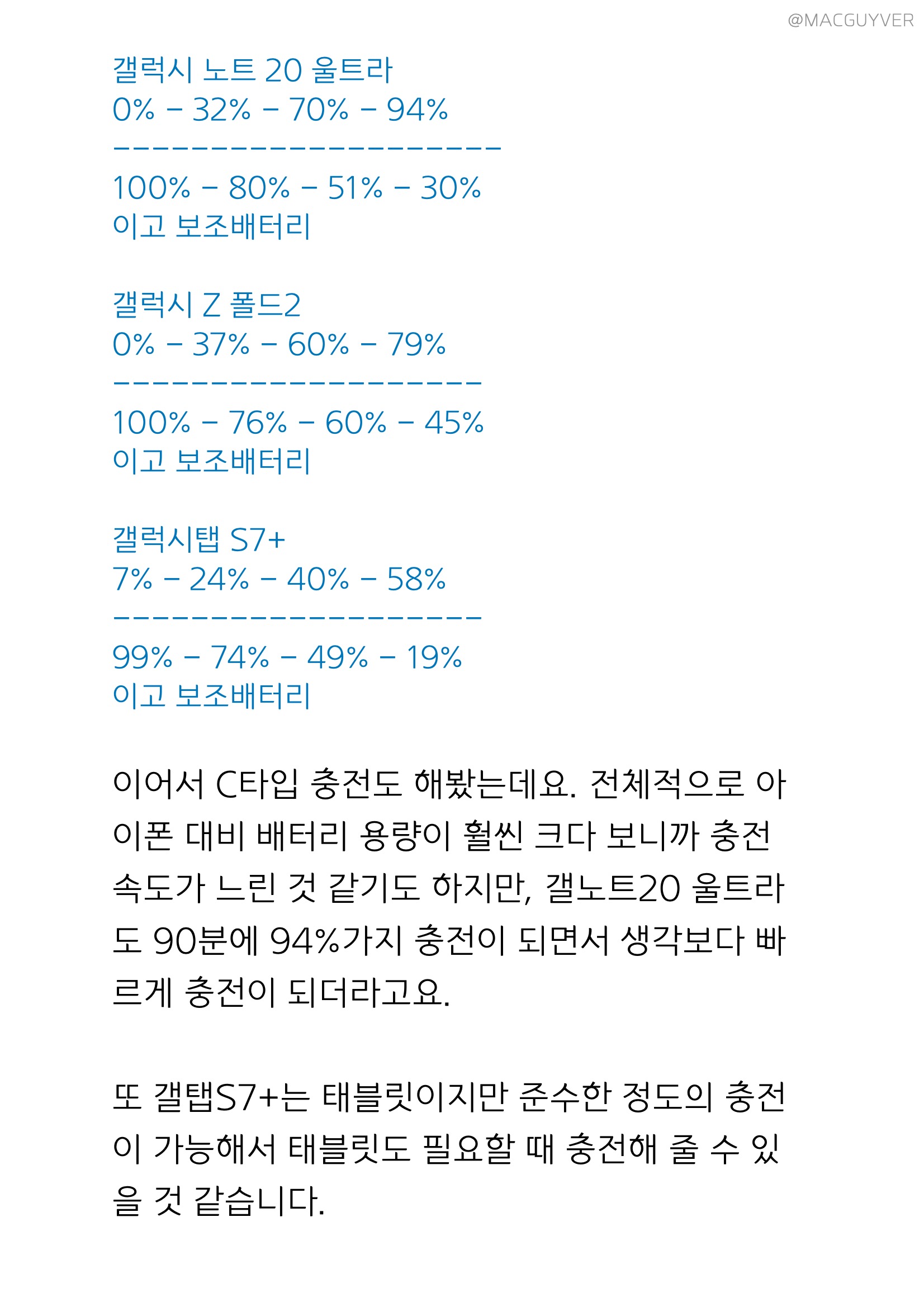 보조배터리추천 아이폰11 프로 맥스 0% - 47% - 81% - 96% ------------------- 98% - 58% - 35% - 27% 이고 보조배터리 1년간 사용했던 아이폰11 프로 맥스를 충전한 결과 30분에 47%가 충전되었고, 90분에 96%까지 빠른 충전이 되었습니다. 아이폰12 프로 맥스 0% - 47% - 80% --------------- 100% - 69% - 47% 이고 고속충전기 보조배터리 다음으로 아이폰12 프로 맥스를 충전한 결과 아이폰11 프로 맥스와 비슷한 속도로 충전이 되는데요. 확실히 PD 충전이 가능한 MFi 인증 라이트닝 케이블이라 충전 속도도 좋고 인식도 잘 되는 것 같습니다. 이쯤에서 첫 번째 댓글 이벤트 힌트를 드리자면 ‘30분에 50% 이상’이라는 문구와 함께 댓글을 남겨주시면 됩니다. 갤럭시 노트 20 울트라 0% - 32% - 70% - 94% -------------------- 100% - 80% - 51% - 30% 이고 보조배터리 갤럭시 Z 폴드2 0% - 37% - 60% - 79% ------------------- 100% - 76% - 60% - 45% 이고 보조배터리 갤럭시탭 S7+ 7% - 24% - 40% - 58% ------------------- 99% - 74% - 49% - 19% 이고 보조배터리 이어서 C타입 충전도 해봤는데요. 전체적으로 아이폰 대비 배터리 용량이 훨씬 크다 보니까 충전 속도가 느린 것 같기도 하지만, 갤노트20 울트라도 90분에 94%가지 충전이 되면서 생각보다 빠르게 충전이 되더라고요. 또 갤탭S7+는 태블릿이지만 준수한 정도의 충전이 가능해서 태블릿도 필요할 때 충전해 줄 수 있을 것 같습니다.