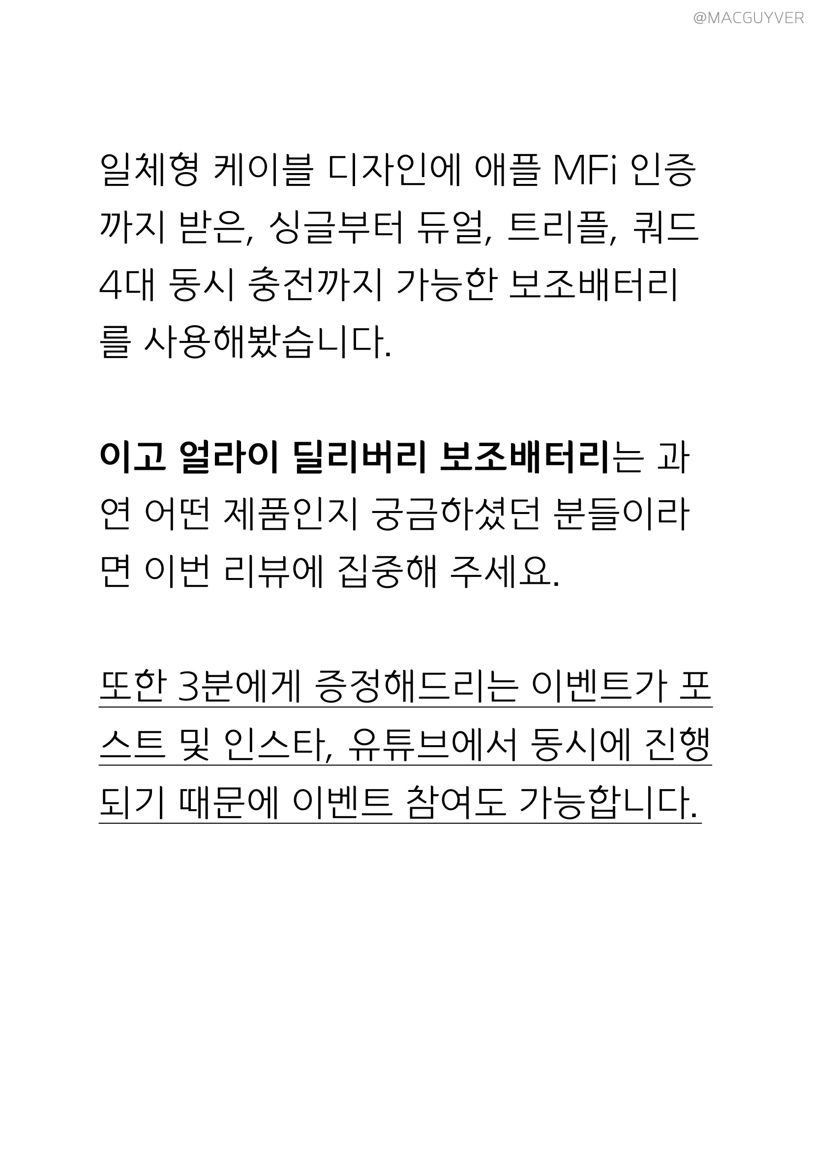 일체형 케이블 디자인에 애플 MFi 인증까지 받은 애플제품의 보조배터리, 싱글부터 듀얼, 트리플, 쿼드 4대 동시 충전까지 가능한 보조배터리를 사용해봤습니다. 무선 보조배터리추천 이고 얼라이 딜리버리 보조배터리는 과연 어떤 제품인지 궁금하셨던 분들이라면 이번 무선 보조 배터리추천 리뷰에 집중해 주세요. 또한 3분에게 증정해드리는 이벤트가 포스트 및 인스타, 유튜브에서 동시에 진행되기 때문에 이벤트 참여도 가능합니다.