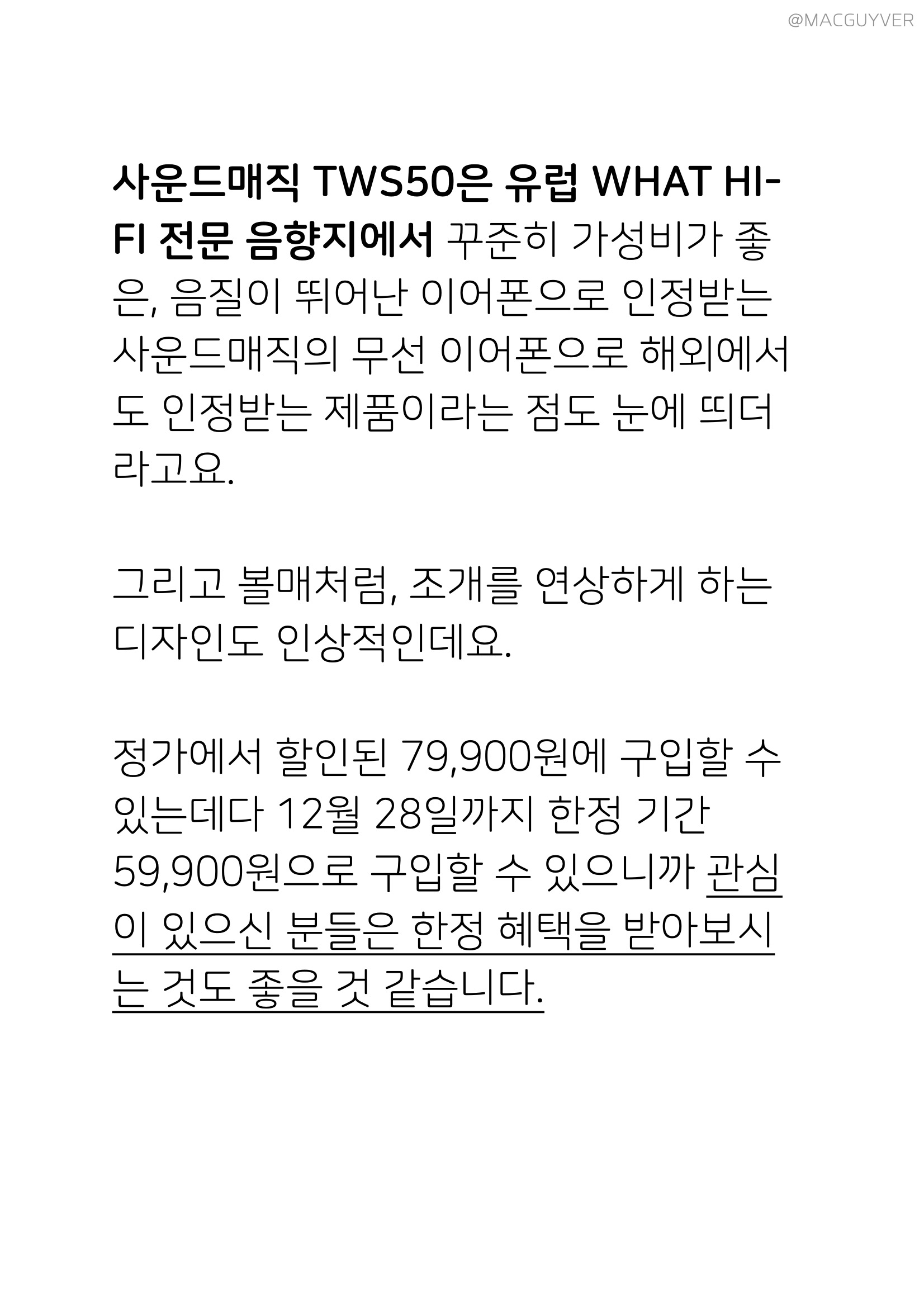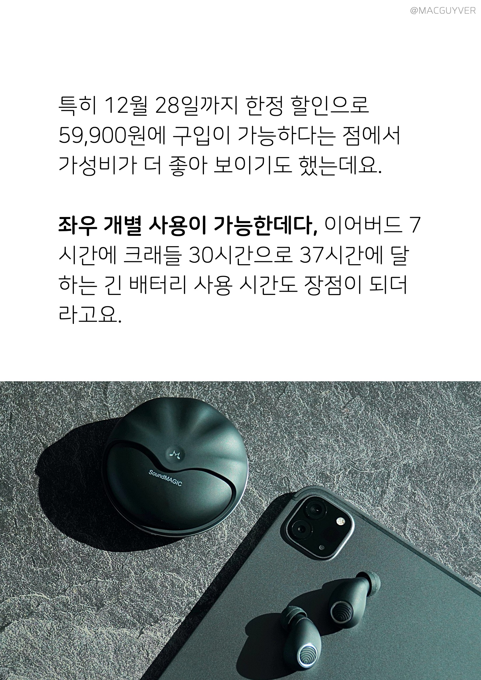 대신 통화는 전체적으로 아쉬운 편이라 통화를 목적으로 사용하기에는 애매합니다. 또 유선형이라 크래들에서 이어버드를 꺼낼 때 약간 미끄러운 경우도 있었어요. 블루투스 연결은 정말 안정적인데요. 1~2층을 오고가도 연결이 잘 되는데다 10m를 넘어서서 최대 19m 정도까지도 연결이 잘 되니까 활동 반경이 상당히 넓어지더라고요. 이외에도 오토페어링이 상당히 빠르고, IPX7 등급의 생활 방수가 되니까 제품 마감이 좋은데다 내구성도 기대가 되는데요. 이어버드 무게가 4g으로 가볍다는 점, 하이파이 다이나믹 드라이버로 음질이 뛰어나다는 점, 45일 대기가 가능하다는 점들이 큰 장점이 아닐까 합니다. 사운드매직 TWS50 무선 이어폰 추천 제품은 유럽 WHAT HI-FI 전문 음향지에서 꾸준히 가성비가 좋은, 음질이 뛰어난 이어폰으로 인정받는 사운드매직의 무선 이어폰으로 해외에서도 인정받는 제품이라는 점도 눈에 띄더라고요. 그리고 볼매처럼, 조개를 연상하게 하는 디자인도 인상적인데요. 정가에서 할인된 79,900원에 구입할 수 있는데다 12월 28일까지 한정 기간 59,900원으로 구입할 수 있으니까 관심이 있으신 분들은 한정 혜택을 받아보시는 것도 좋을 것 같습니다.
