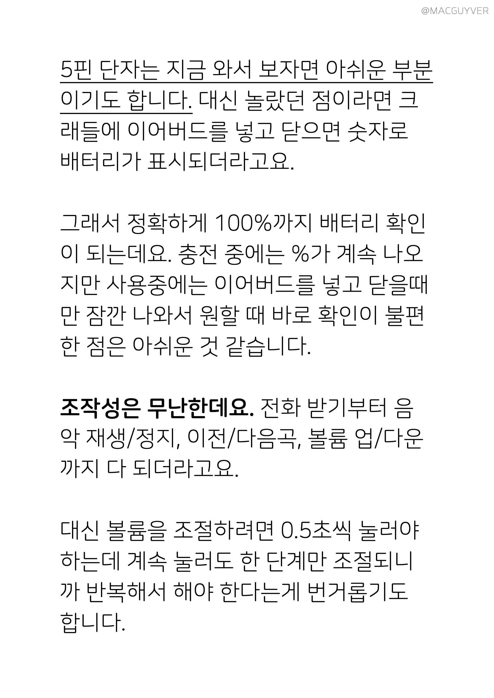 충전 중에는 %가 계속 나오지만 사용중에는 이어버드를 넣고 닫을때만 잠깐 나와서 원할 때 바로 확인이 불편한 점은 아쉬운 것 같습니다. 조작성은 무난한데요. 가성비 블루투스 이어폰 전화 받기부터 음악 재생/정지, 이전/다음곡, 볼륨 업/다운까지 다 되더라고요. 대신 볼륨을 조절하려면 0.5초씩 눌러야 하는데 계속 눌러도 한 단계만 조절되니까 반복해서 해야 한다는게 번거롭기도 합니다. 귀가 작은 분들이라면 약간 귀에서 떠 있는 느낌도 들 것 같지만, 대부분은 이어버드가 귀에 쏙 들어가는 라운딩 디자인이라 편한 착용이 가능할 것 같아요. 노이즈 캔슬링 이어폰은 의외로 중요한 동영상 싱크는 유튜브나 게임을 할 때도 밀림이 거의 없어서 불편함이 없었는데요. 음악만 들으려는 목적이 아니라면, 동영상 싱크를 꼭 확인해야 한다는 점에서 사운드매직 TWS50은 동영상 싱크도 충분한 장점이 아닐까 합니다.