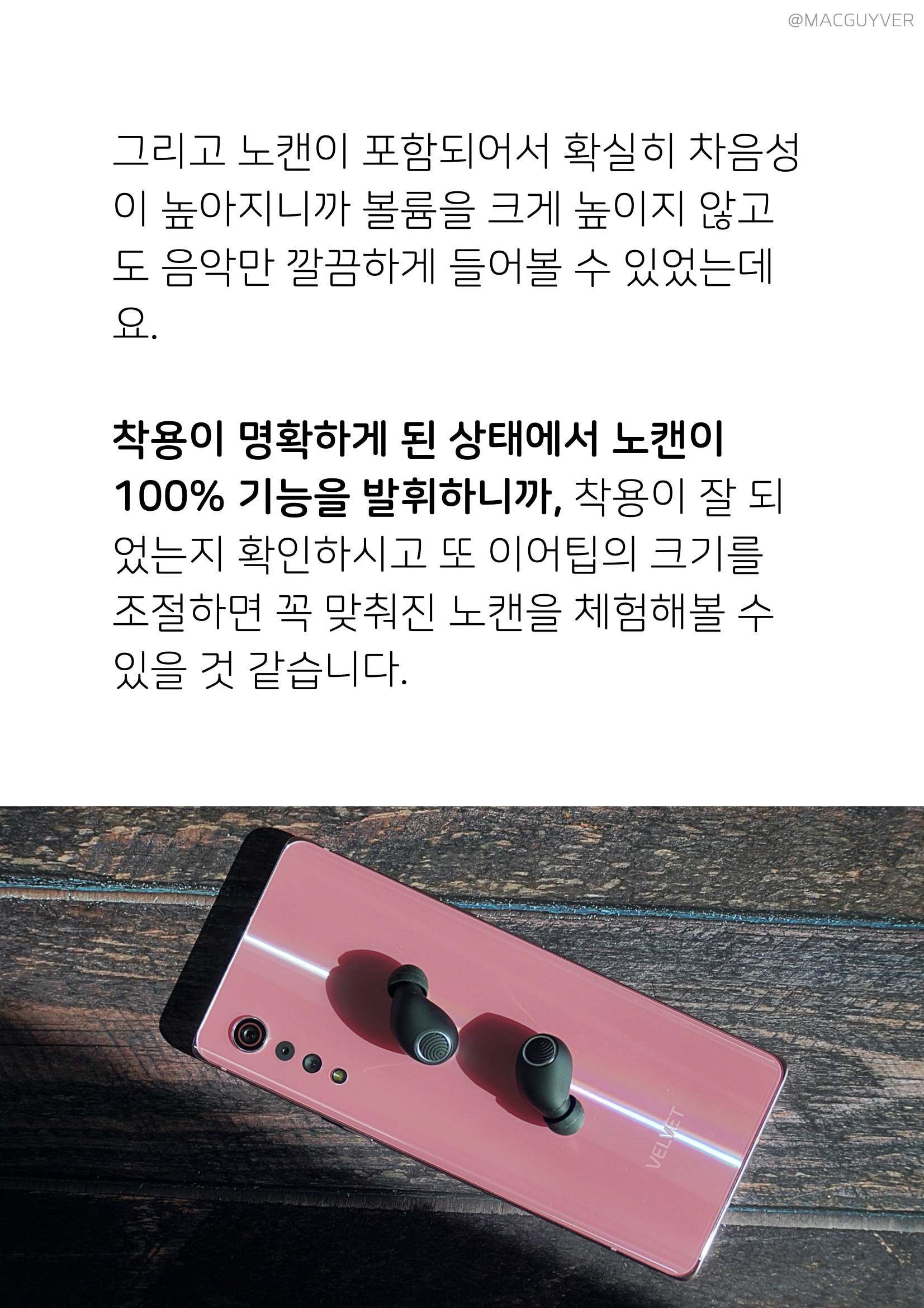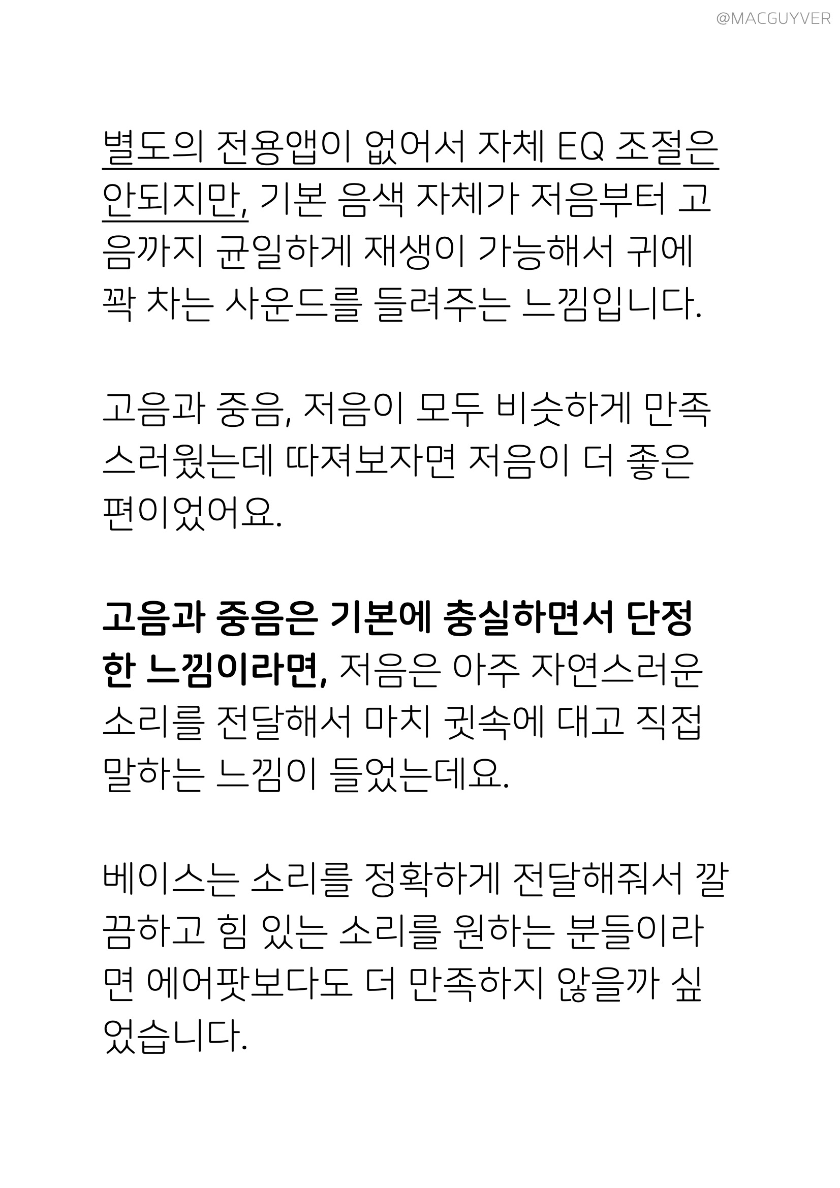 착용이 명확하게 된 상태에서 노캔이 100% 기능을 발휘하니까, 착용이 잘 되었는지 확인하시고 또 이어팁의 크기를 조절하면 꼭 맞춰진 노캔을 체험해볼 수 있을 것 같습니다. 노이즈 캔슬링 이어폰 별도의 전용앱이 없어서 자체 EQ 조절은 안되지만, 기본 음색 자체가 저음부터 고음까지 균일하게 재생이 가능해서 귀에 꽉 차는 사운드를 들려주는 느낌입니다. 고음과 중음, 저음이 모두 비슷하게 만족스러웠는데 따져보자면 저음이 더 좋은 편이었어요. 고음과 중음은 기본에 충실하면서 단정한 느낌이라면, 저음은 아주 자연스러운 소리를 전달해서 마치 귓속에 대고 직접 말하는 느낌이 들었는데요. 가성비 블루투스 이어폰 베이스는 소리를 정확하게 전달해줘서 깔끔하고 힘 있는 소리를 원하는 분들이라면 에어팟보다도 더 만족하지 않을까 싶었습니다. 참고로, EQ를 만져보면 베이스에 공간감이나 울림이 더해지면서 기본에 들리지 않던 악기 소리도 훨씬 잘 들립니다.