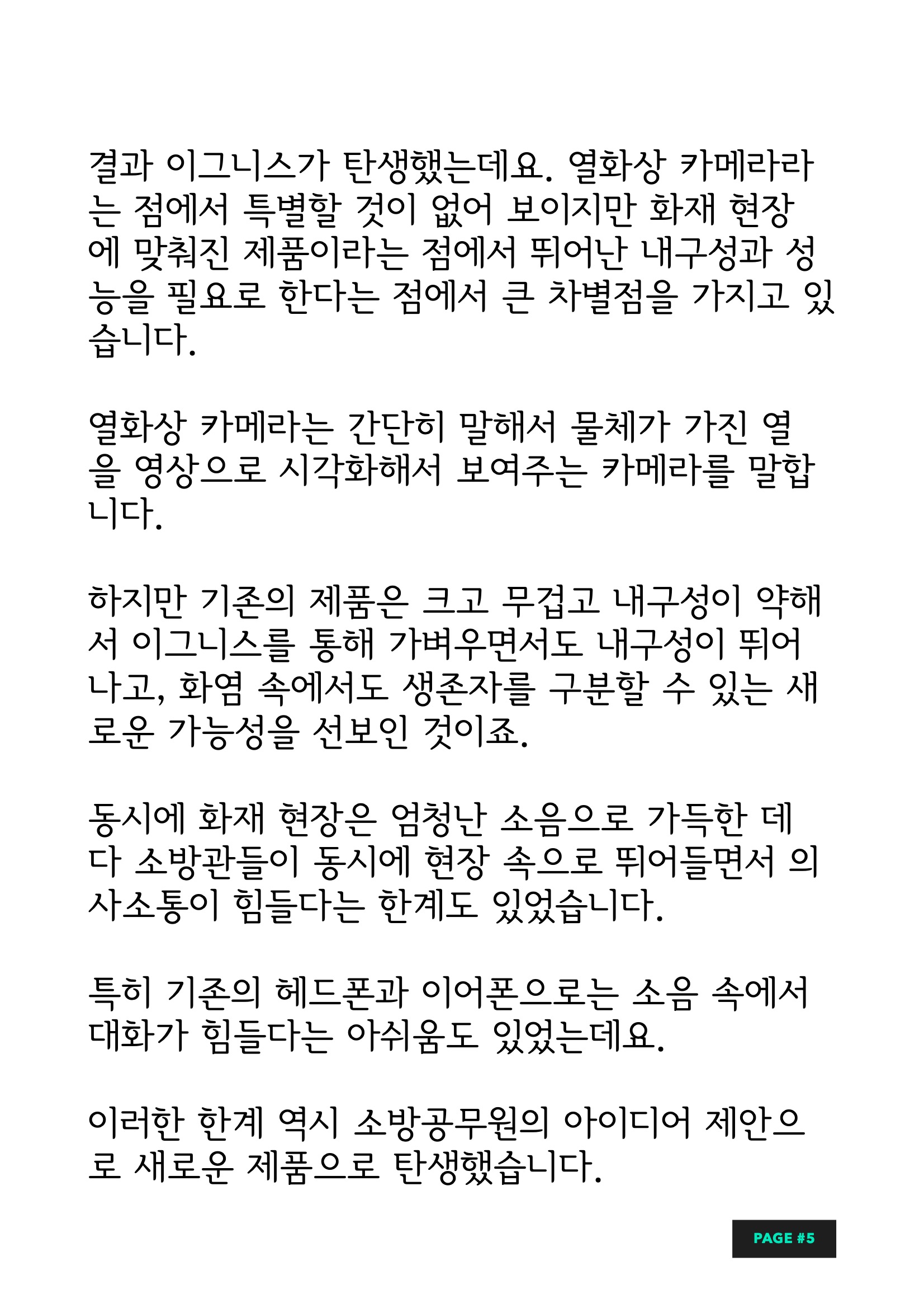 열화상 카메라는 간단히 말해서 물체가 가진 열을 영상으로 시각화해서 보여주는 카메라를 말합니다. 하지만 기존의 소방장비 제품은 크고 무겁고 내구성이 약해서 이그니스를 통해 가벼우면서도 내구성이 뛰어나고, 화염 속에서도 생존자를 구분할 수 있는 새로운 가능성을 선보인 것이죠. 동시에 화재 현장은 엄청난 소음으로 가득한 데다 소방관들이 동시에 현장 속으로 뛰어들면서 의사소통이 힘들다는 한계도 있었습니다. 특히 기존의 소방장비 헤드폰과 이어폰으로는 소음 속에서 대화가 힘들다는 아쉬움도 있었는데요. 이러한 한계 역시 소방공무원의 아이디어 제안으로 새로운 제품으로 탄생했습니다.
