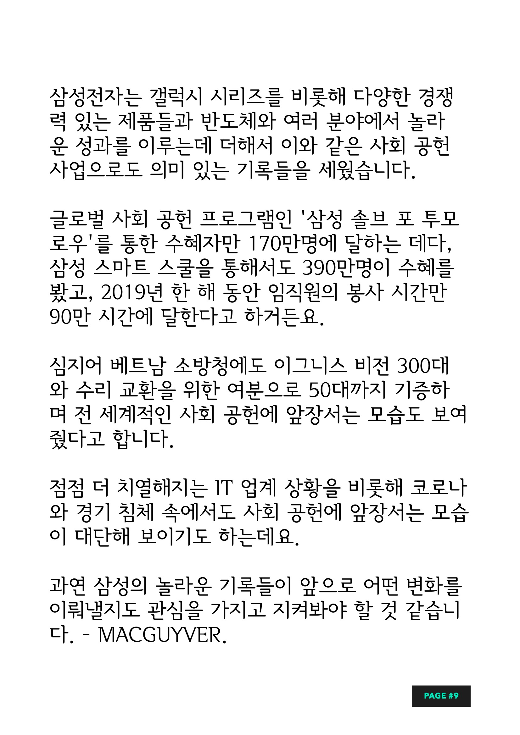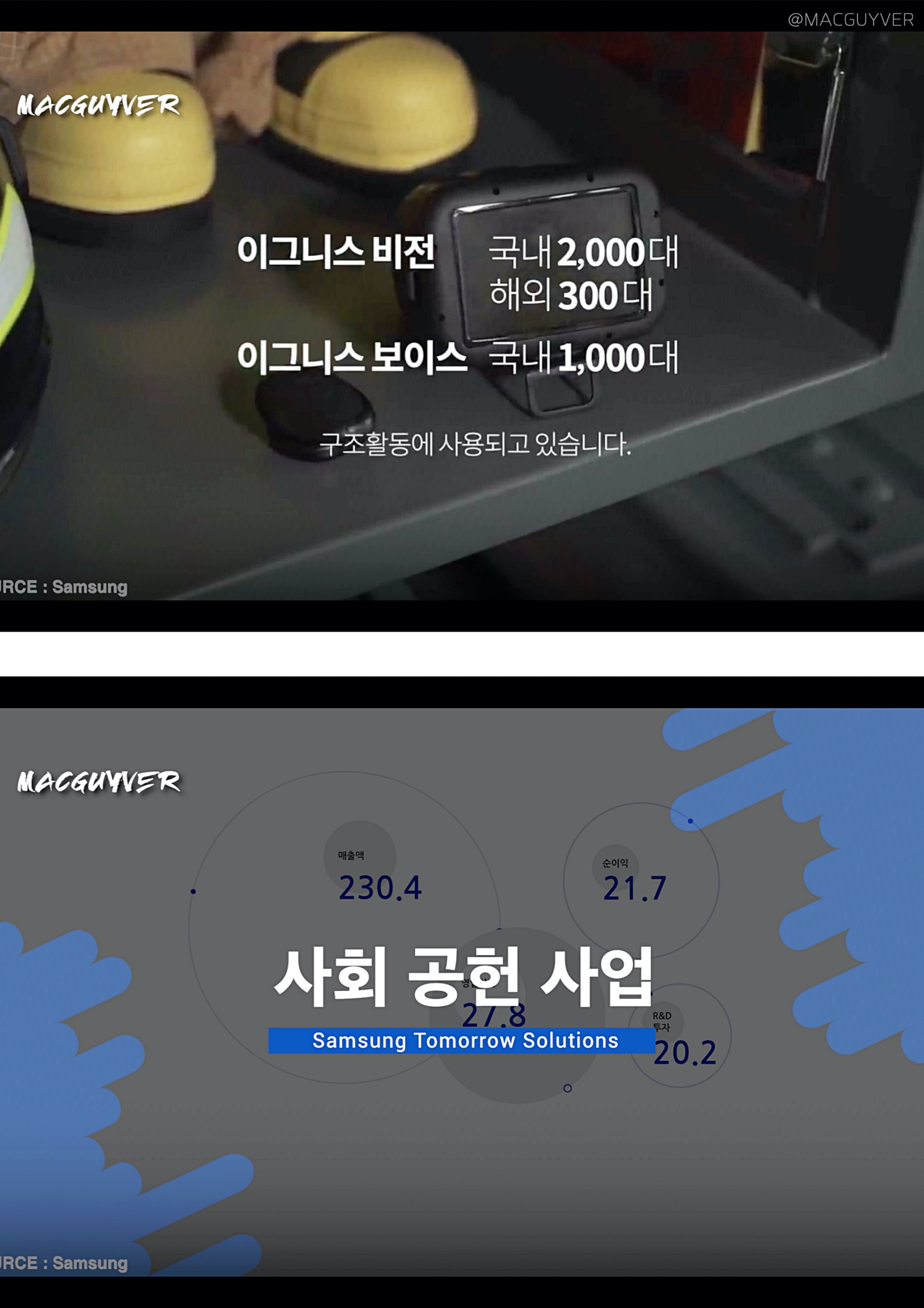 글로벌 사회공헌사업, 사회 공헌 프로그램인 '삼성 솔브 포 투모로우'를 통한 수혜자만 170만명에 달하는 데다, 삼성 스마트 스쿨을 통해서도 390만명이 수혜를 봤고, 2019년 한 해 동안 임직원의 봉사 시간만 90만 시간에 달한다고 하거든요. 심지어 베트남 소방청에도 삼성솔브 이그니스 비전 300대와 수리 교환을 위한 여분으로 50대까지 기증하며 전 세계적인 사회 공헌에 앞장서는 모습도 보여줬다고 합니다. 점점 더 치열해지는 IT 업계 상황을 비롯해 코로나와 경기 침체 속에서도 사회 공헌에 앞장서는 모습이 대단해 보이기도 하는데요. 과연 삼성의 놀라운 기록들이 앞으로 어떤 변화를 이뤄낼지도 관심을 가지고 지켜봐야 할 것 같습니다. - MACGUYVER.