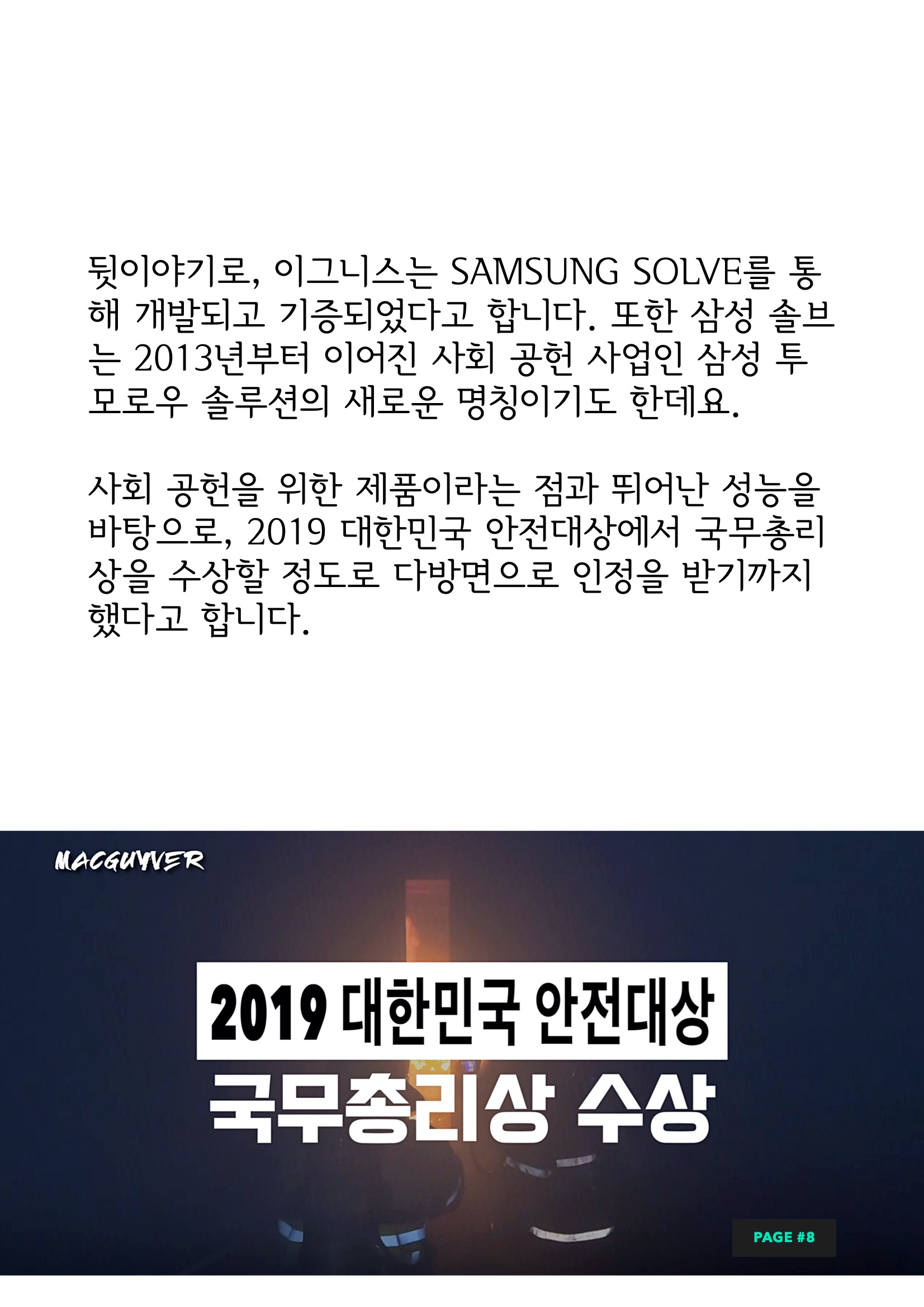 뒷이야기로, 이그니스는 SAMSUNG SOLVE를 통해 개발되고 기증되었다고 합니다. 또한 삼성 솔브는 2013년부터 이어진 사회 공헌 사업인 삼성 투모로우 솔루션의 새로운 명칭이기도 한데요. 사회 공헌을 위한 제품이라는 점과 뛰어난 성능을 바탕으로, 2019 대한민국 안전대상에서 국무총리상을 수상할 정도로 다방면으로 인정을 받기까지 했다고 합니다. 삼성전자는 갤럭시 시리즈를 비롯해 다양한 경쟁력 있는 제품들과 반도체와 여러 분야에서 놀라운 성과를 이루는데 더해서 이와 같은 사회 공헌 사업으로도 의미 있는 기록들을 세웠습니다.